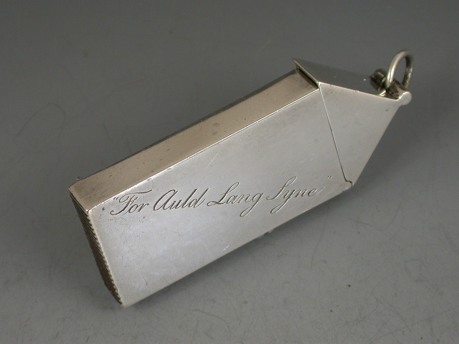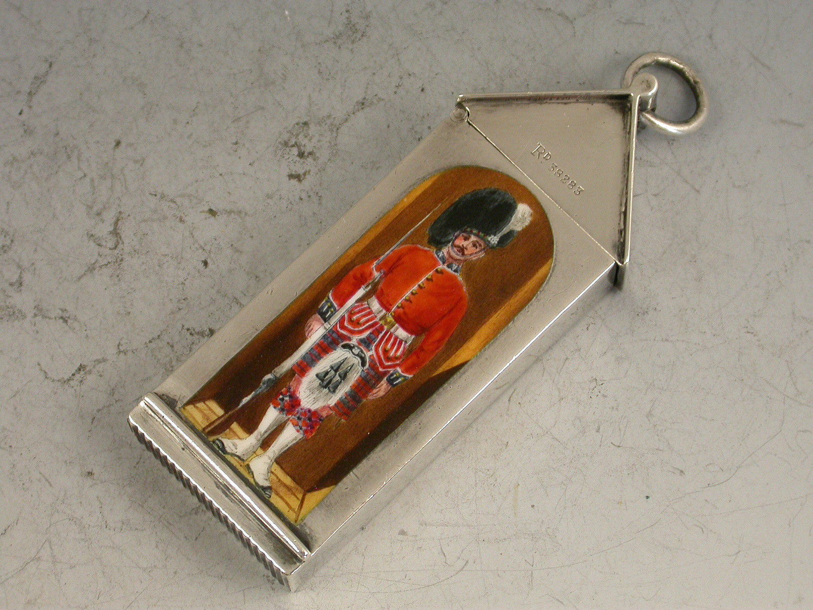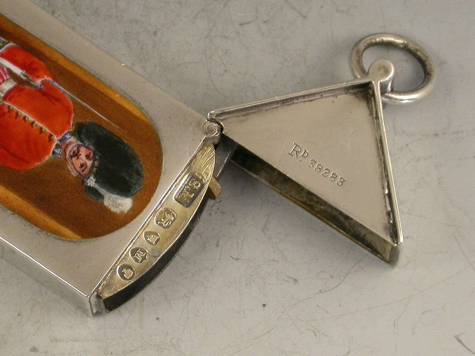 This is one from a series of silver and enamel Vesta Cases depicting ‘Soldiers of the Queen’ produced by Mordan around the time of Victoria’s Golden Jubilee in 1887. It was originally thought that the Sentry Box Vesta was limited to a series of perhaps 10 or 12 different examples made specifically for the Jubilee. Around 25 plus different Regiments have now been recorded.
