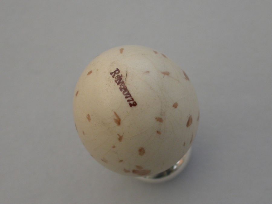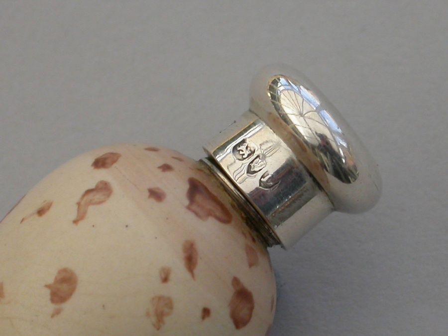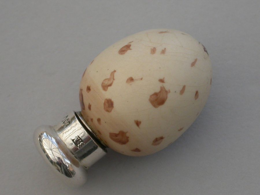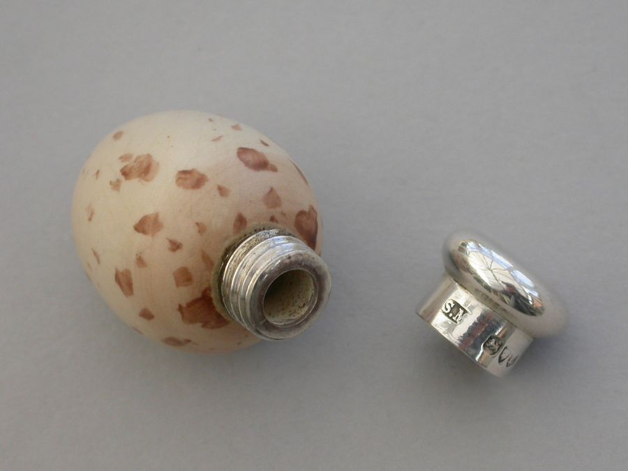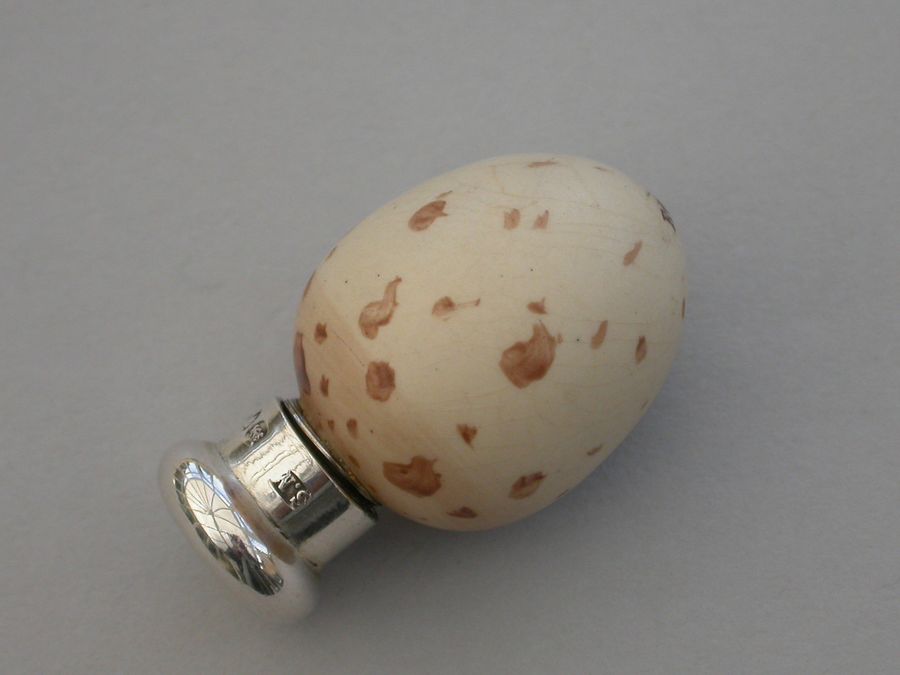 A good Victorian novelty silver and MacIntyre ceramic Scent Bottle made in the form of a Chaffinch's egg, with screw-off silver top.