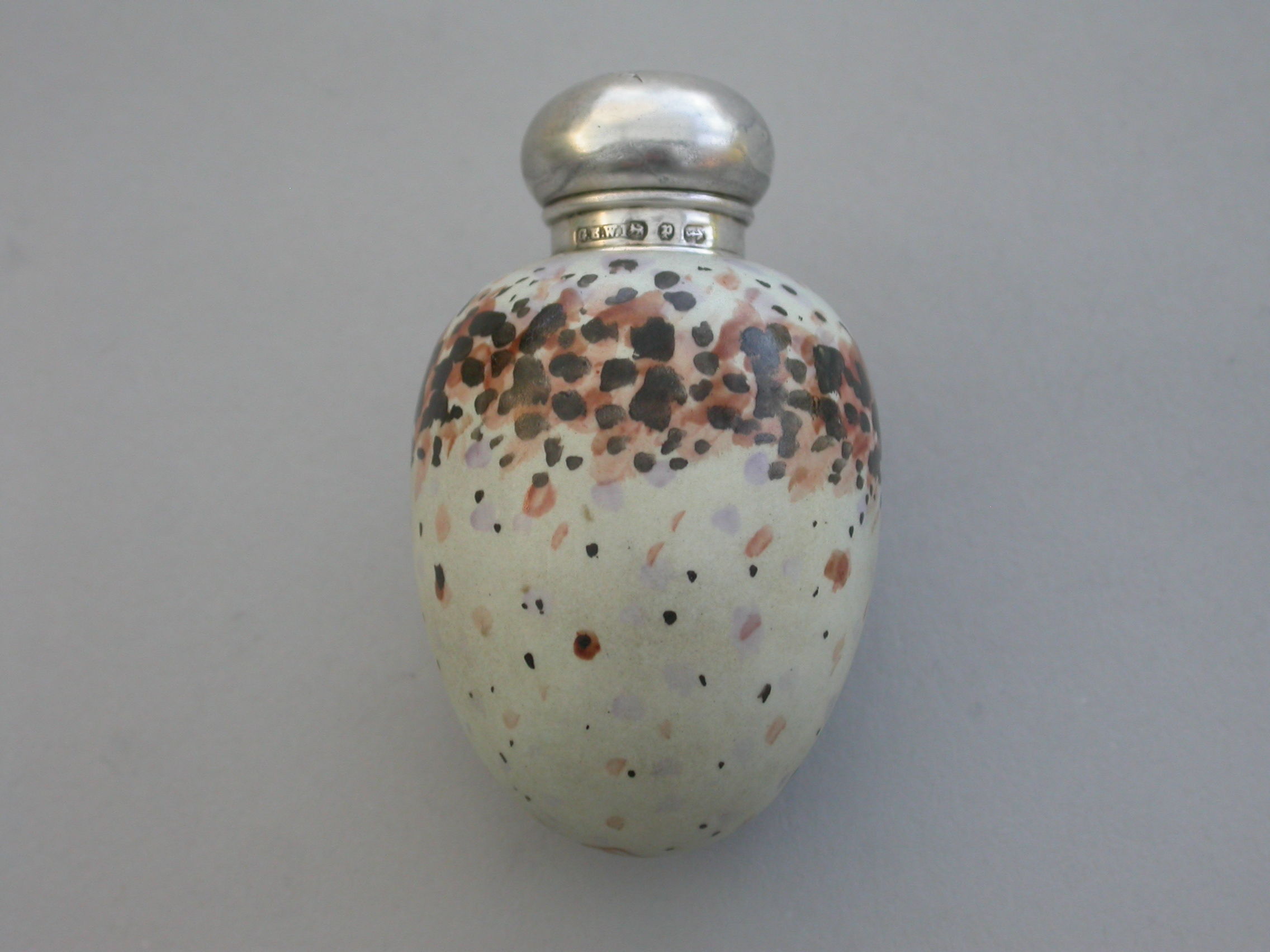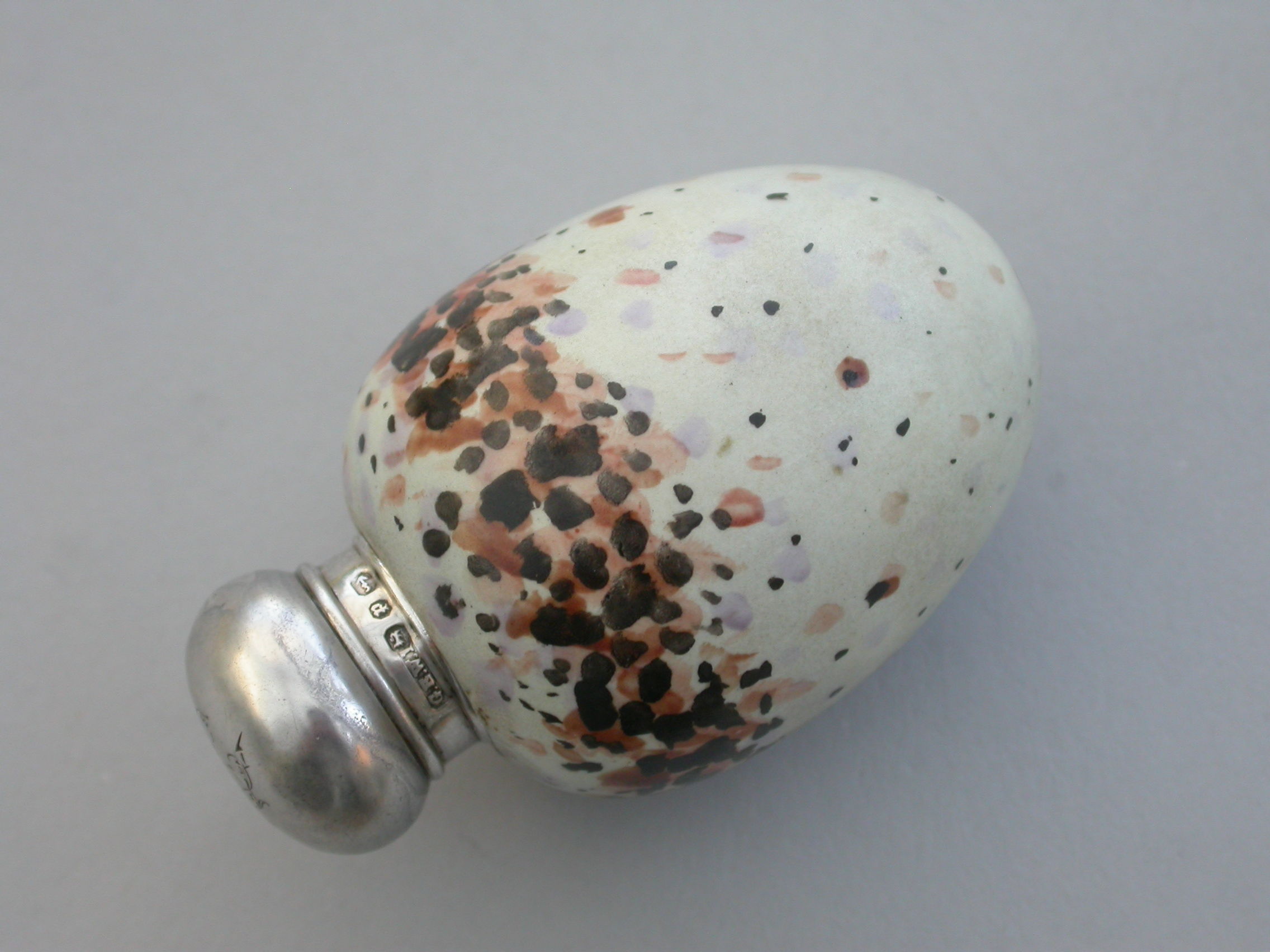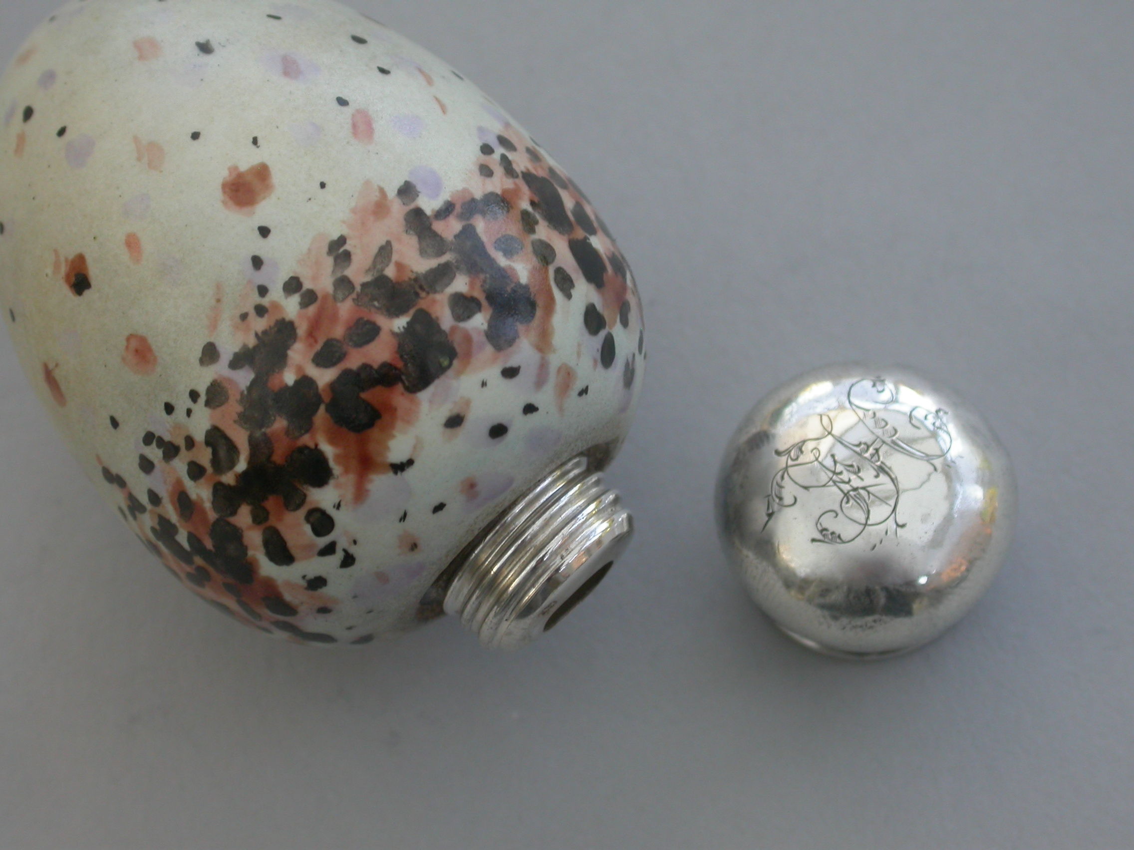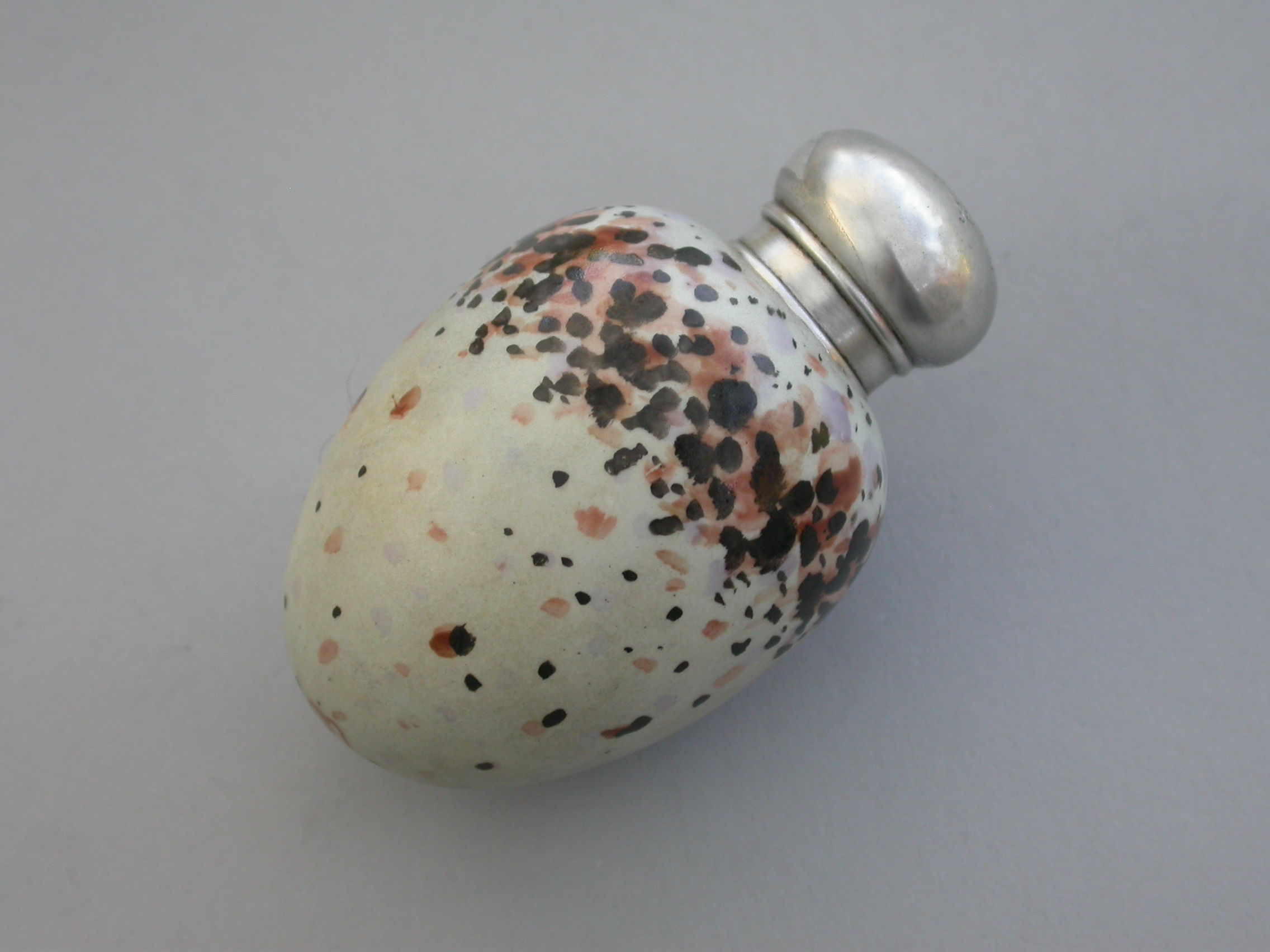 A good Victorian novelty silver and MacIntyre ceramic Scent Bottle made in the form of a gulls egg, with screw-off silver top.