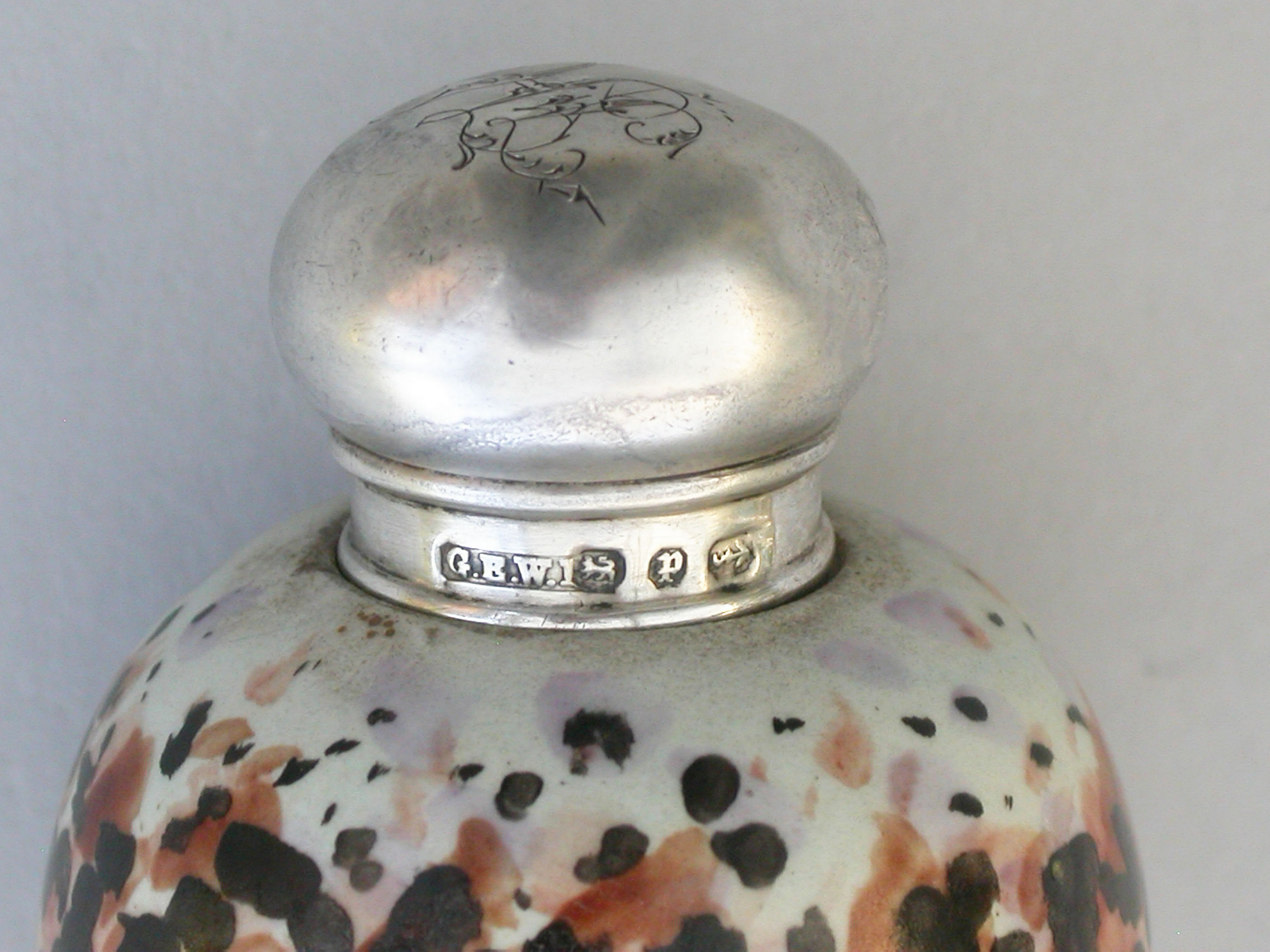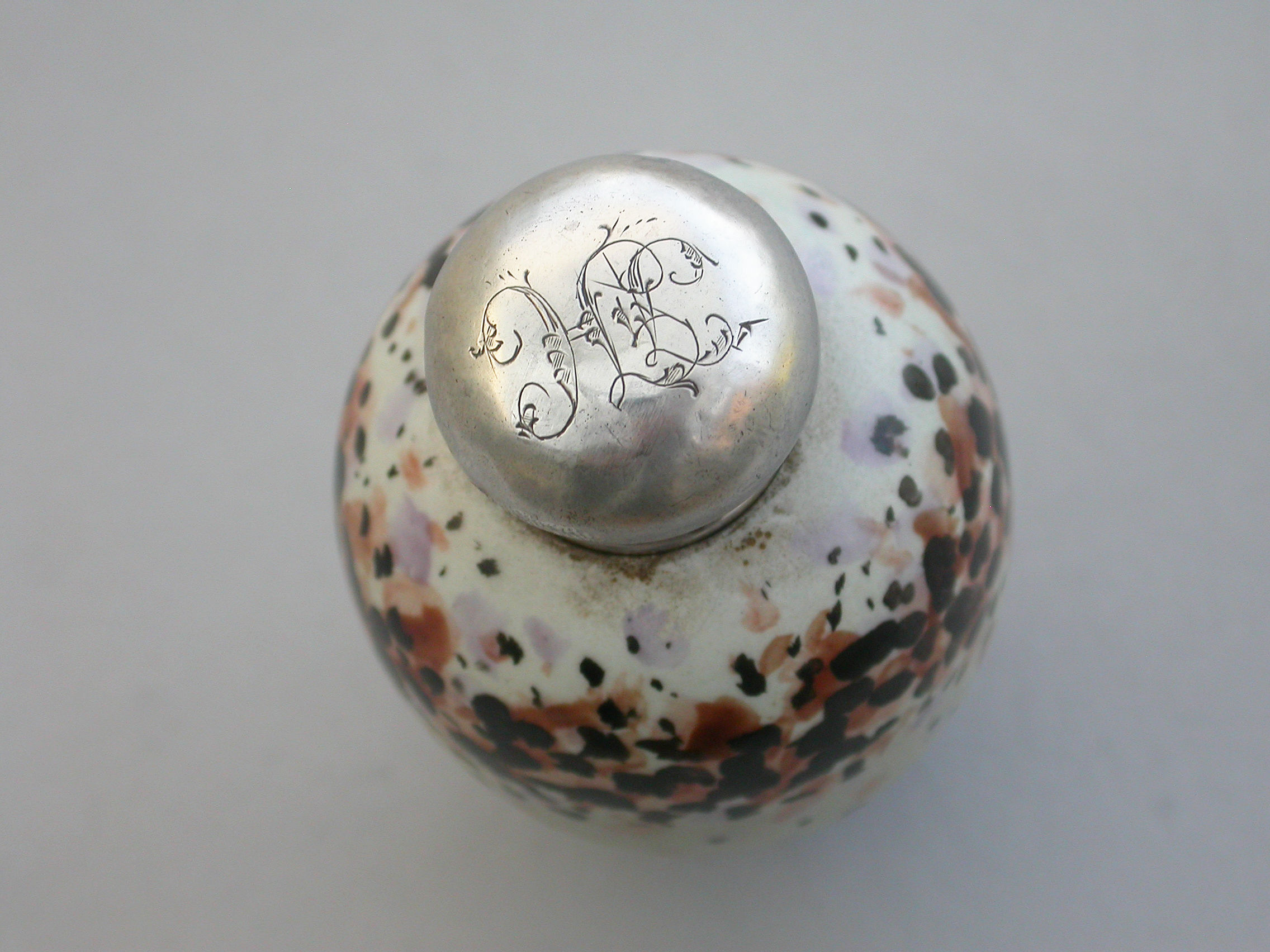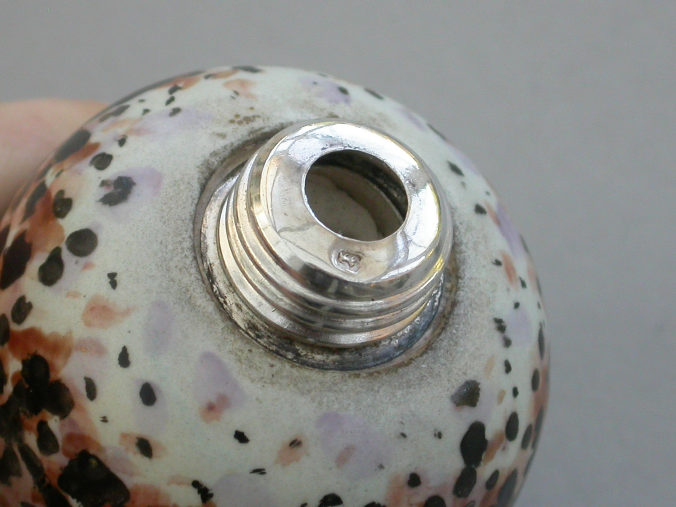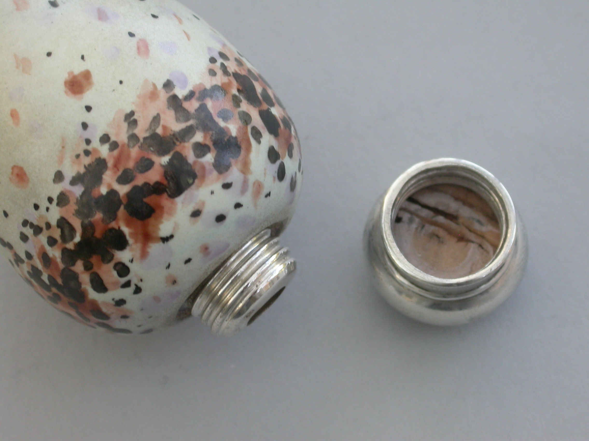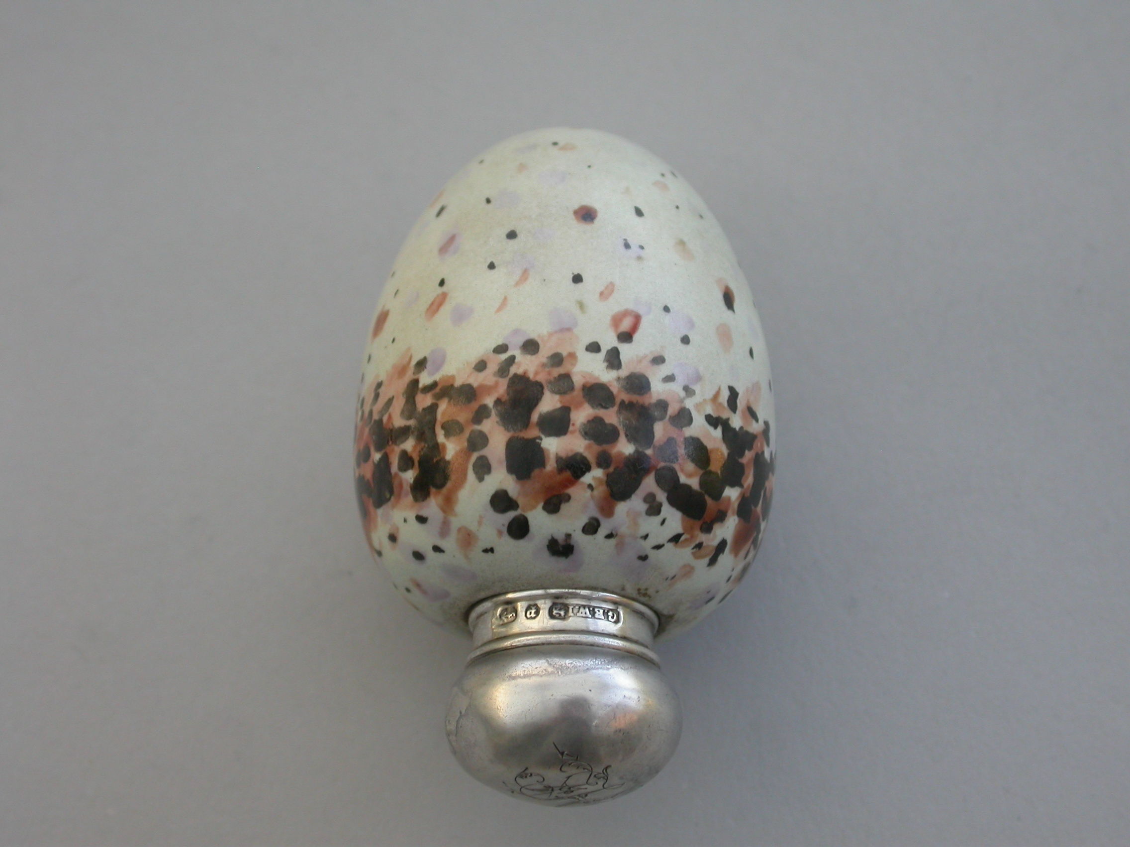 A good Victorian novelty silver and MacIntyre ceramic Scent Bottle made in the form of a gulls egg, with screw-off silver top.