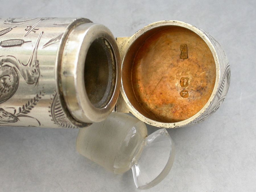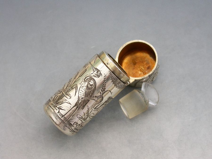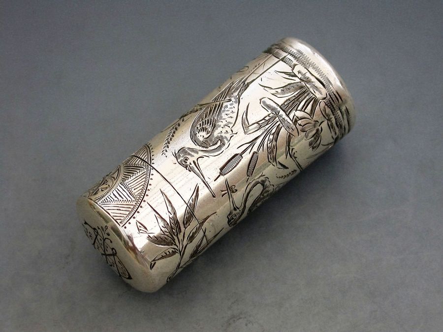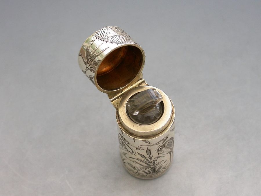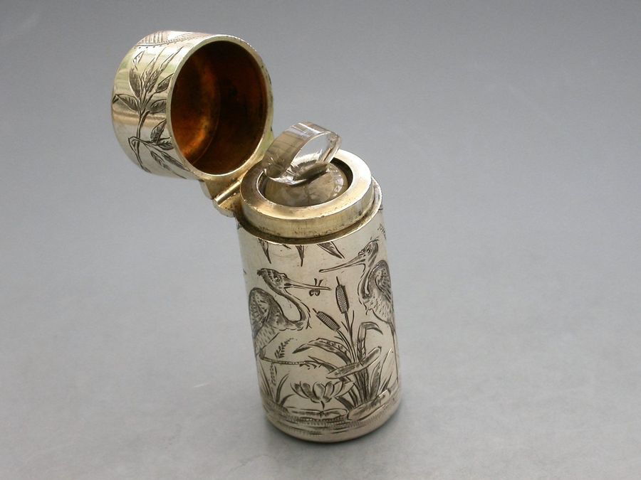 A fine Victorian silver Scent Bottle of cylindrical form with hinged lid and glass stopper, the body engraved in Aesthetic style with Herons or Cranes standing in a pond amongst bull rushes. Silver gilt interior. The lid engraved with a contemporary cypher.