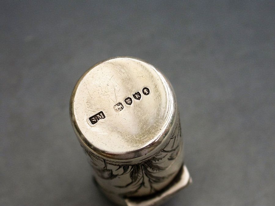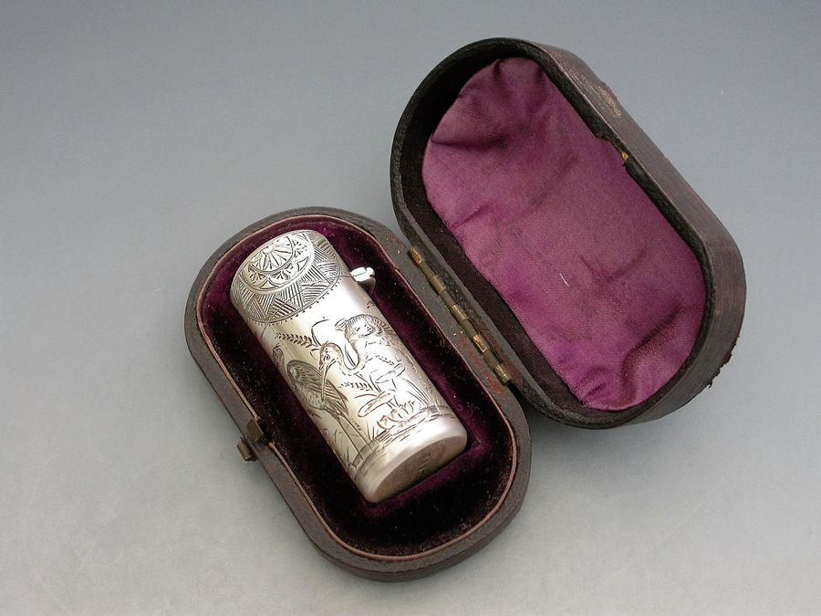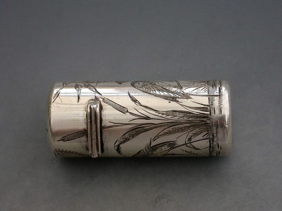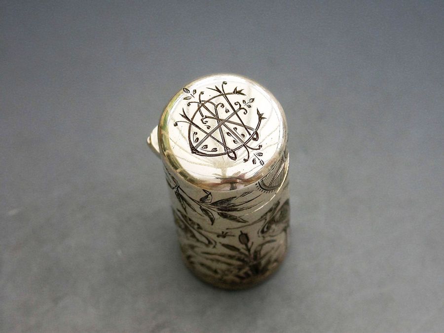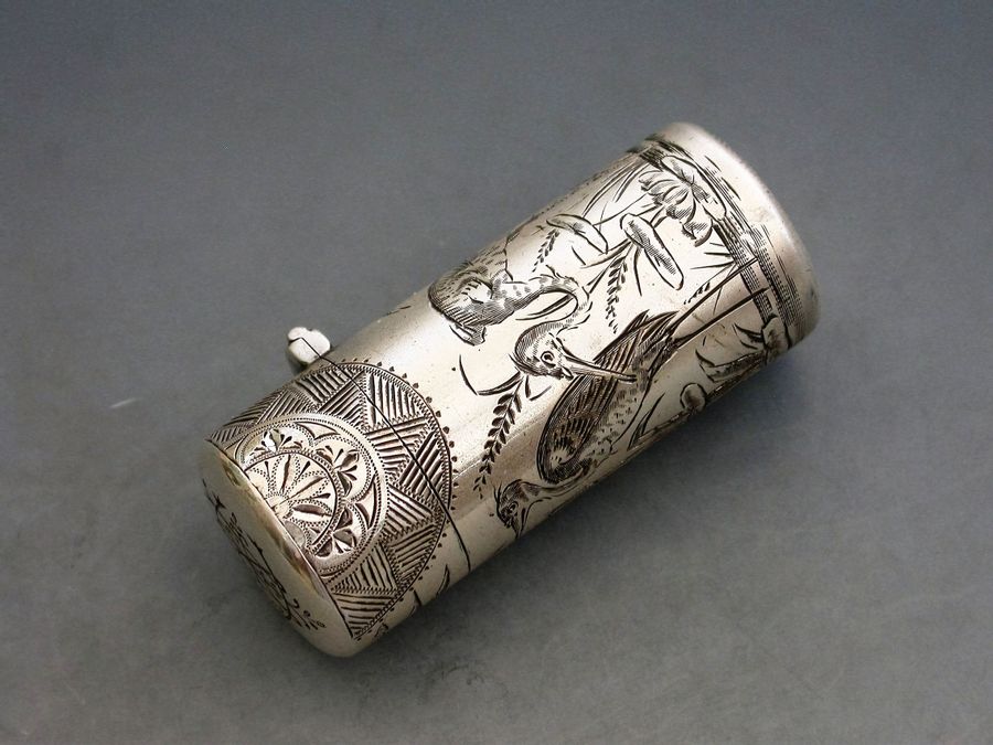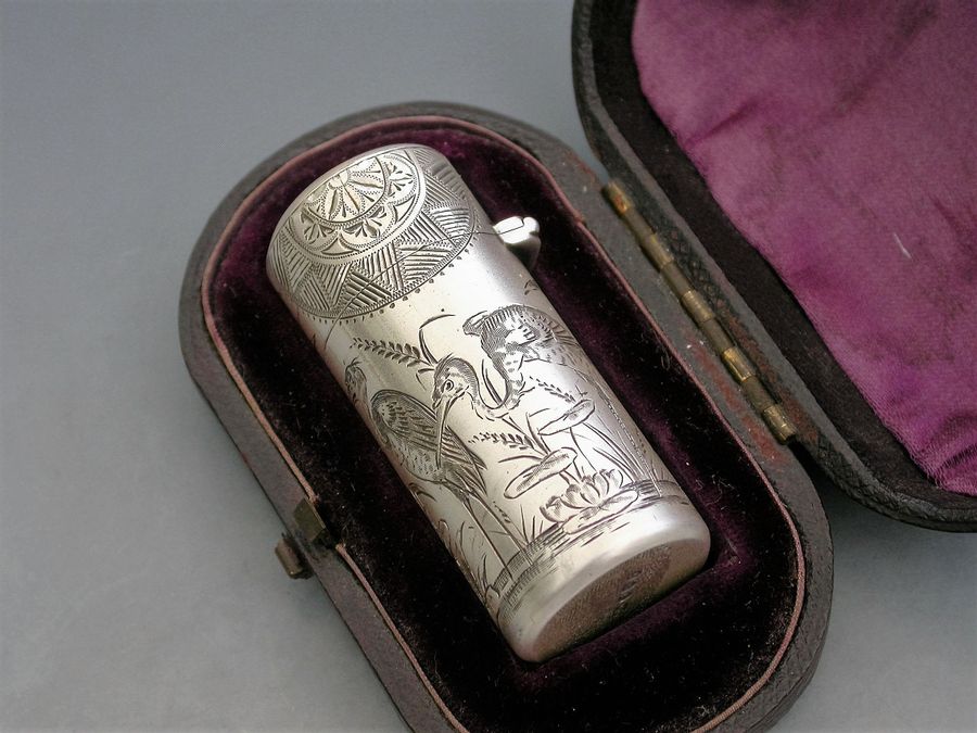 A fine Victorian silver Scent Bottle of cylindrical form with hinged lid and glass stopper, the body engraved in Aesthetic style with Herons or Cranes standing in a pond amongst bull rushes. Silver gilt interior. The lid engraved with a contemporary cypher.