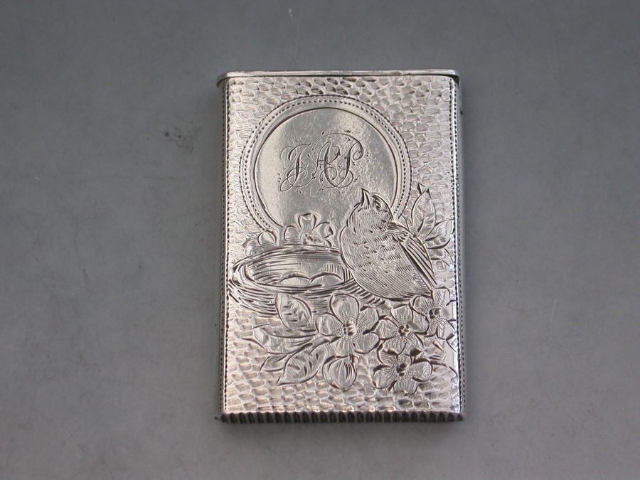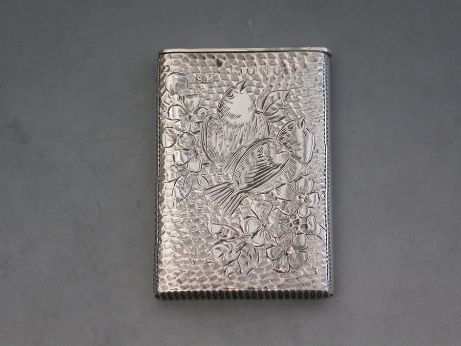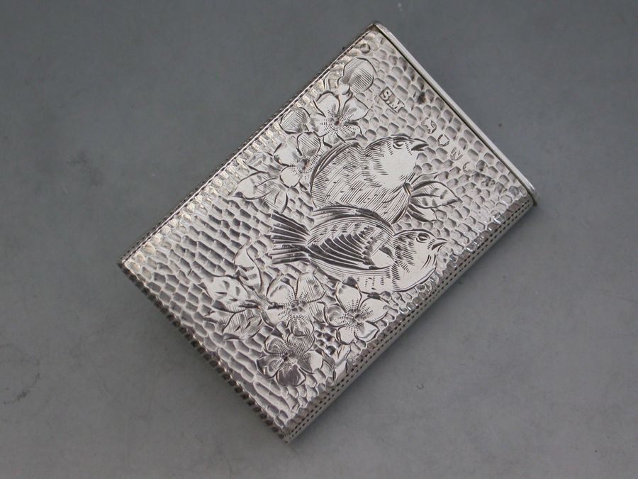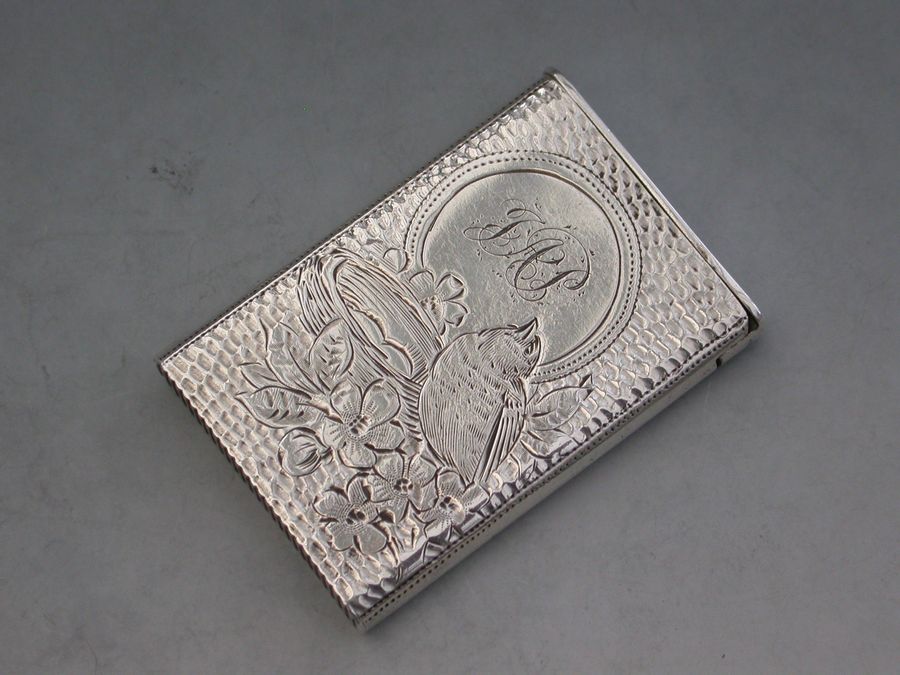 A good Victorian silver Vesta Case of flat rounded rectangular form with sprung hinged lid, engraved in the Aesthetic style with finches and blossom on a hammered background.