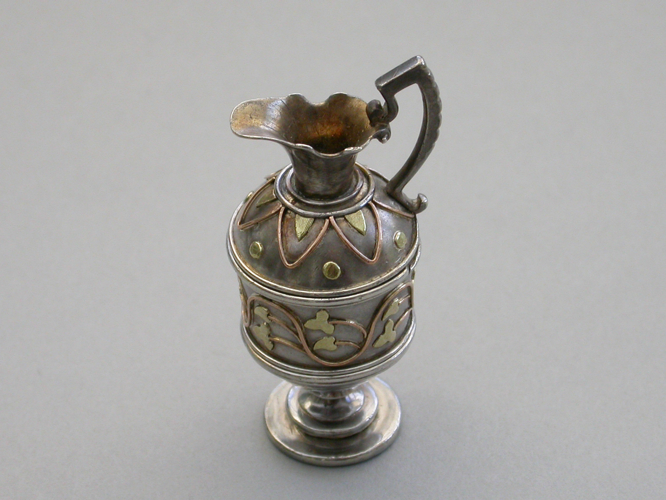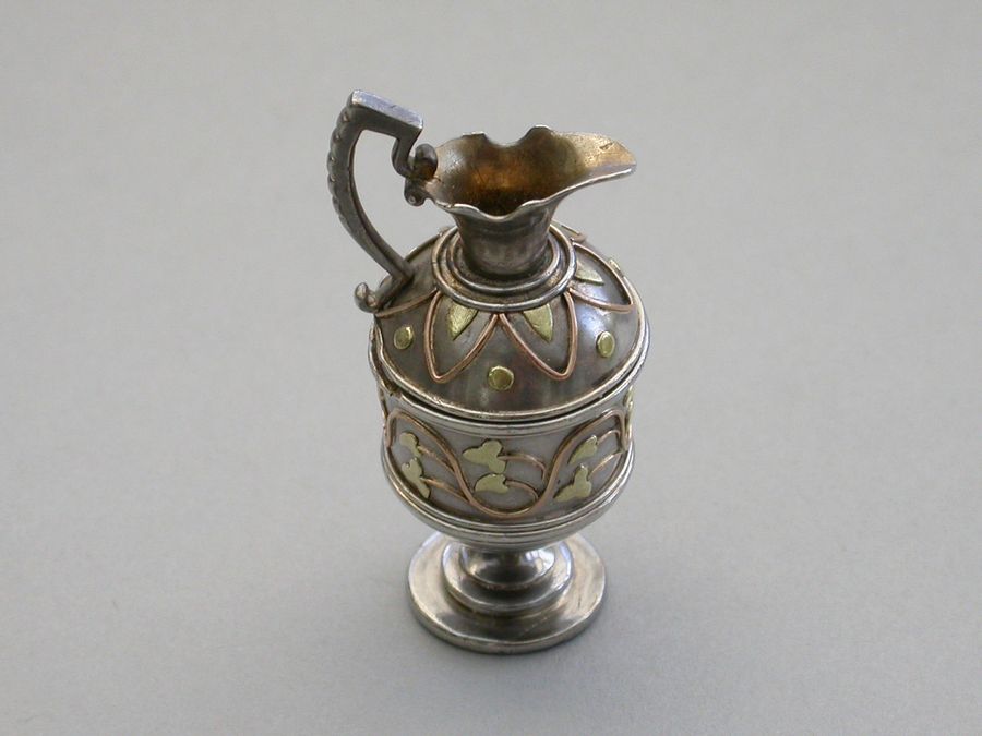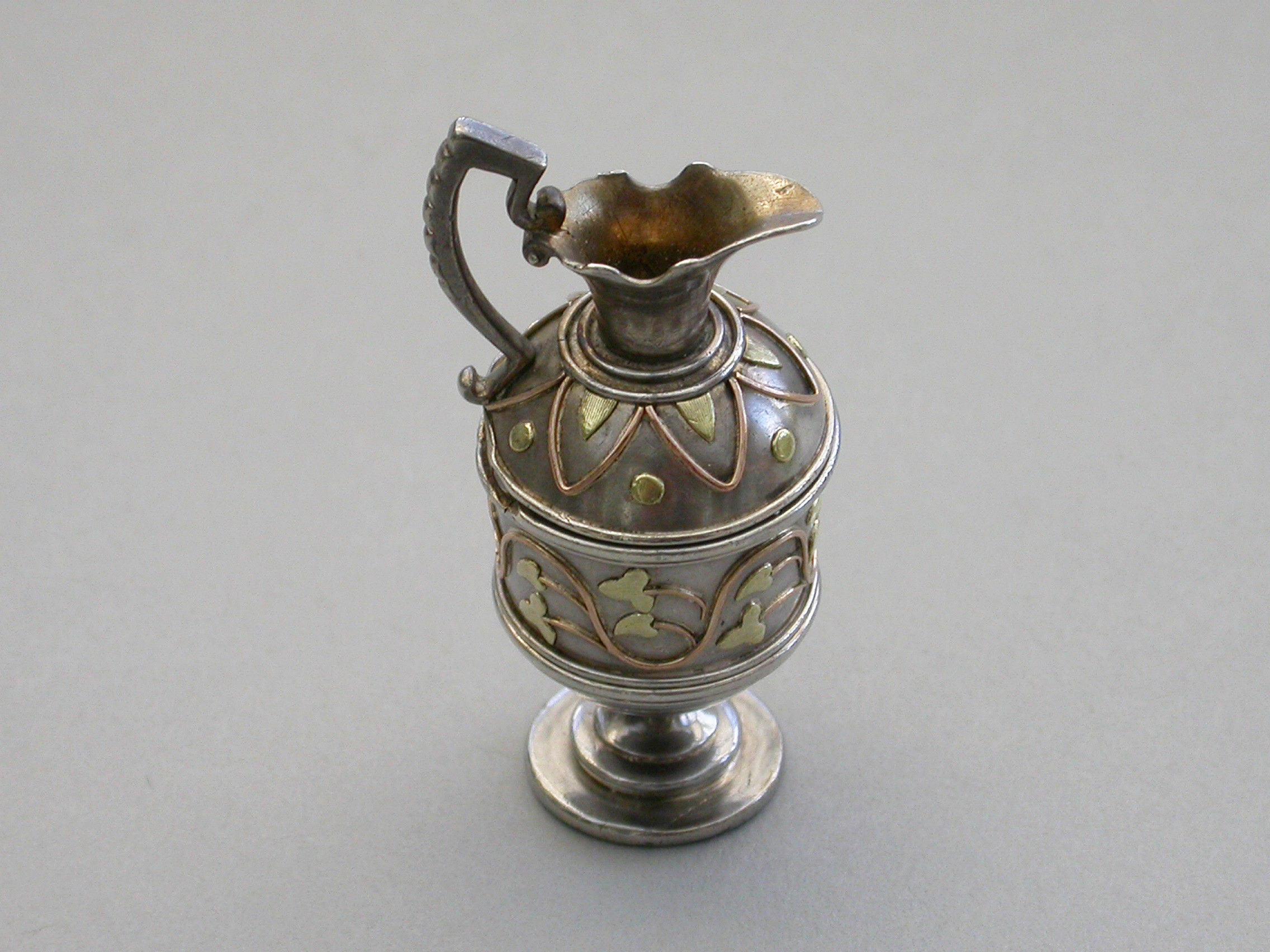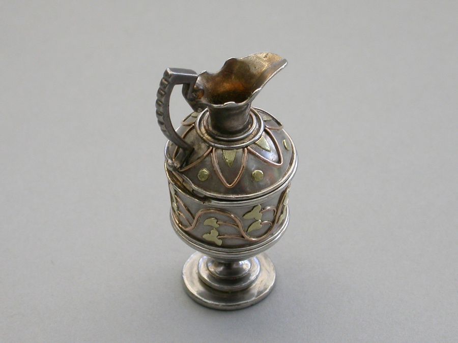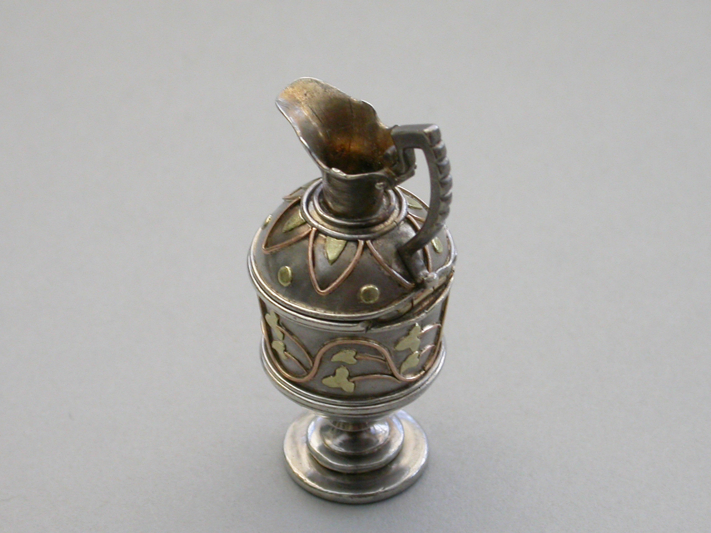 A very fine and rare Victorian novelty silver and 2-colour gold Vinaigrette made in the form of a Roman Wine Ewer, of small size and opening at the shoulder, with 2-colour gold decoration applied as an undulating foliate stem around the body and an echoing geometric pattern around the lid. The interior hinged silver gilt grille with three rows of six holes and some scrolling below.
