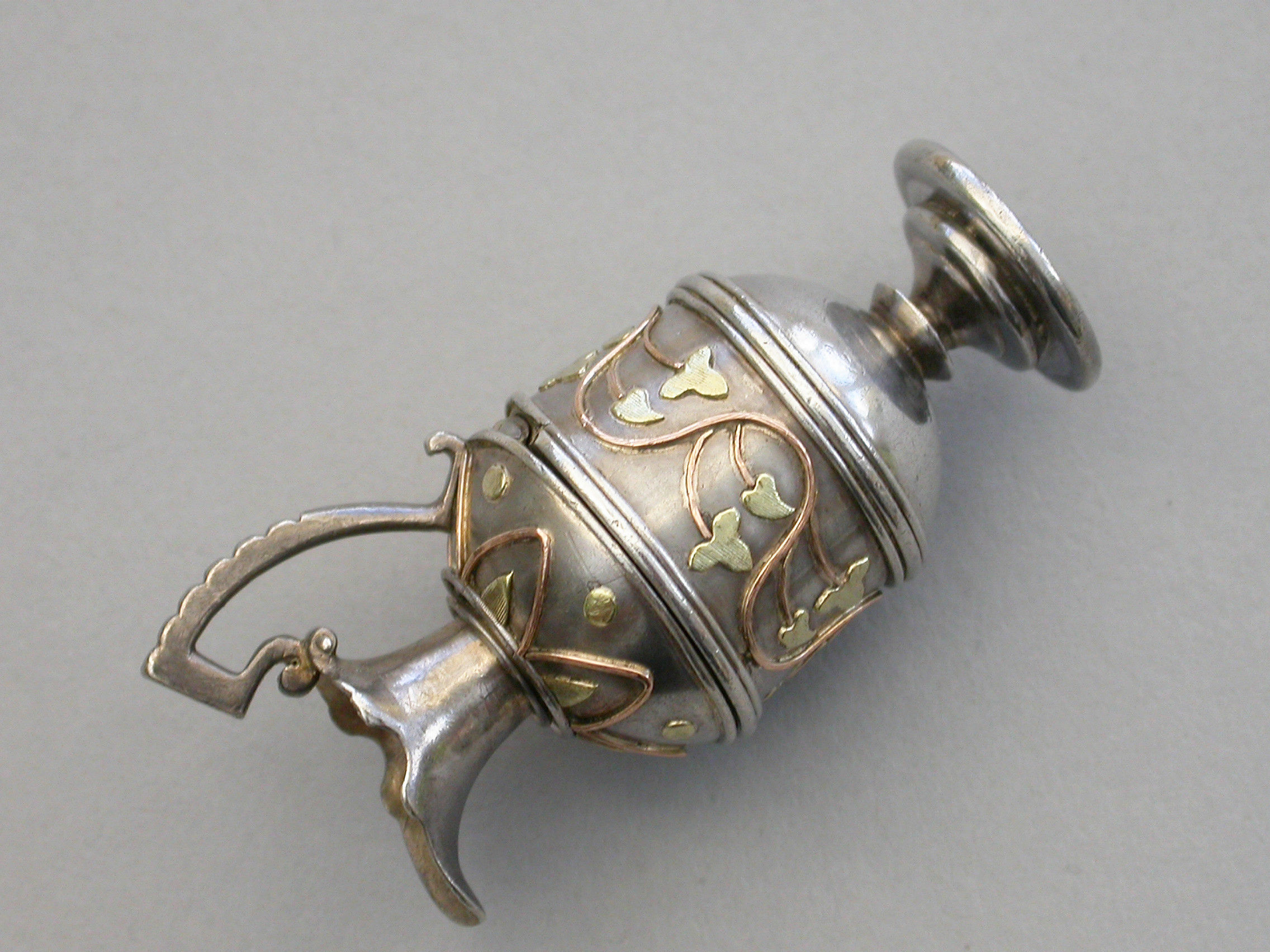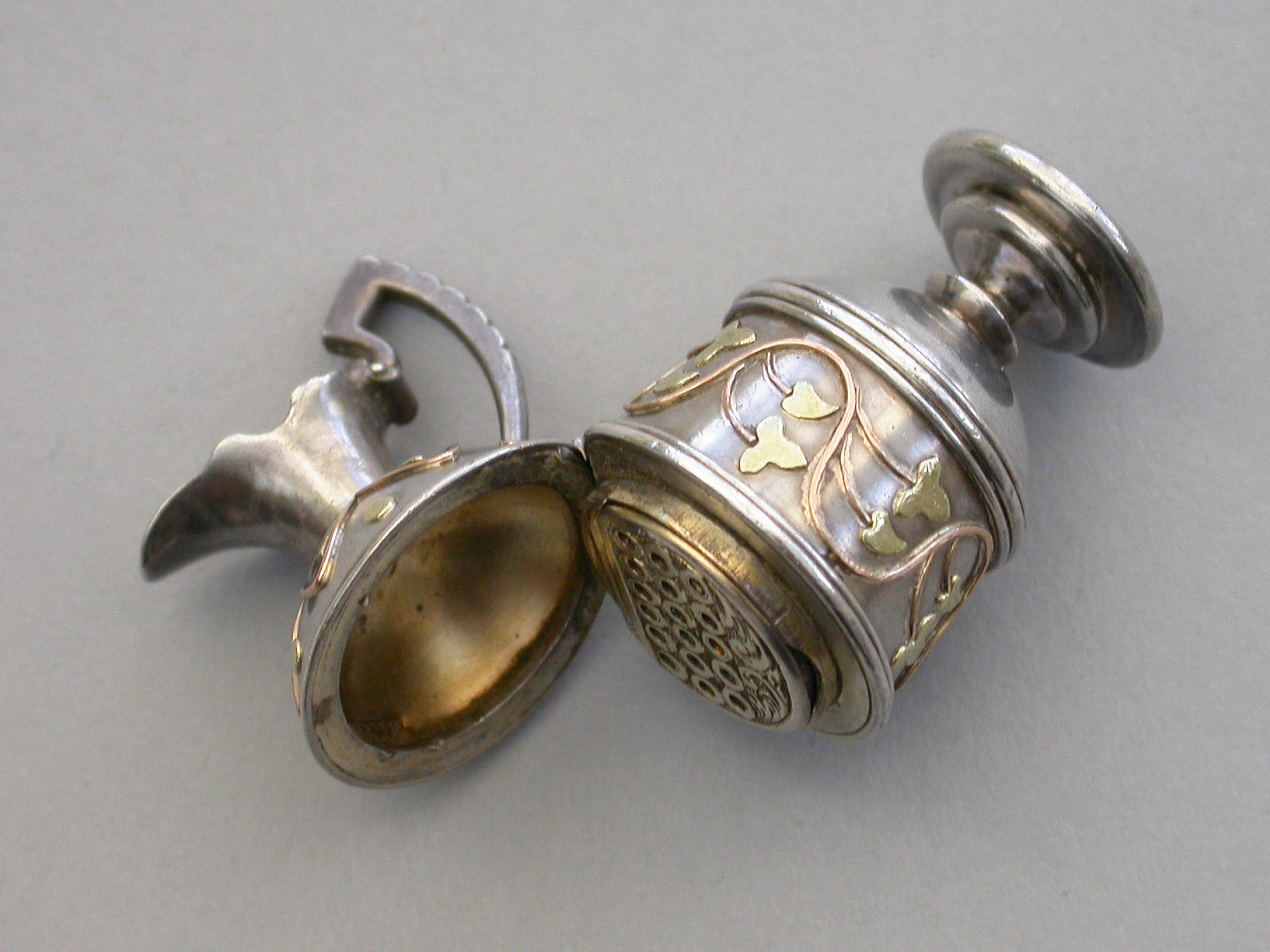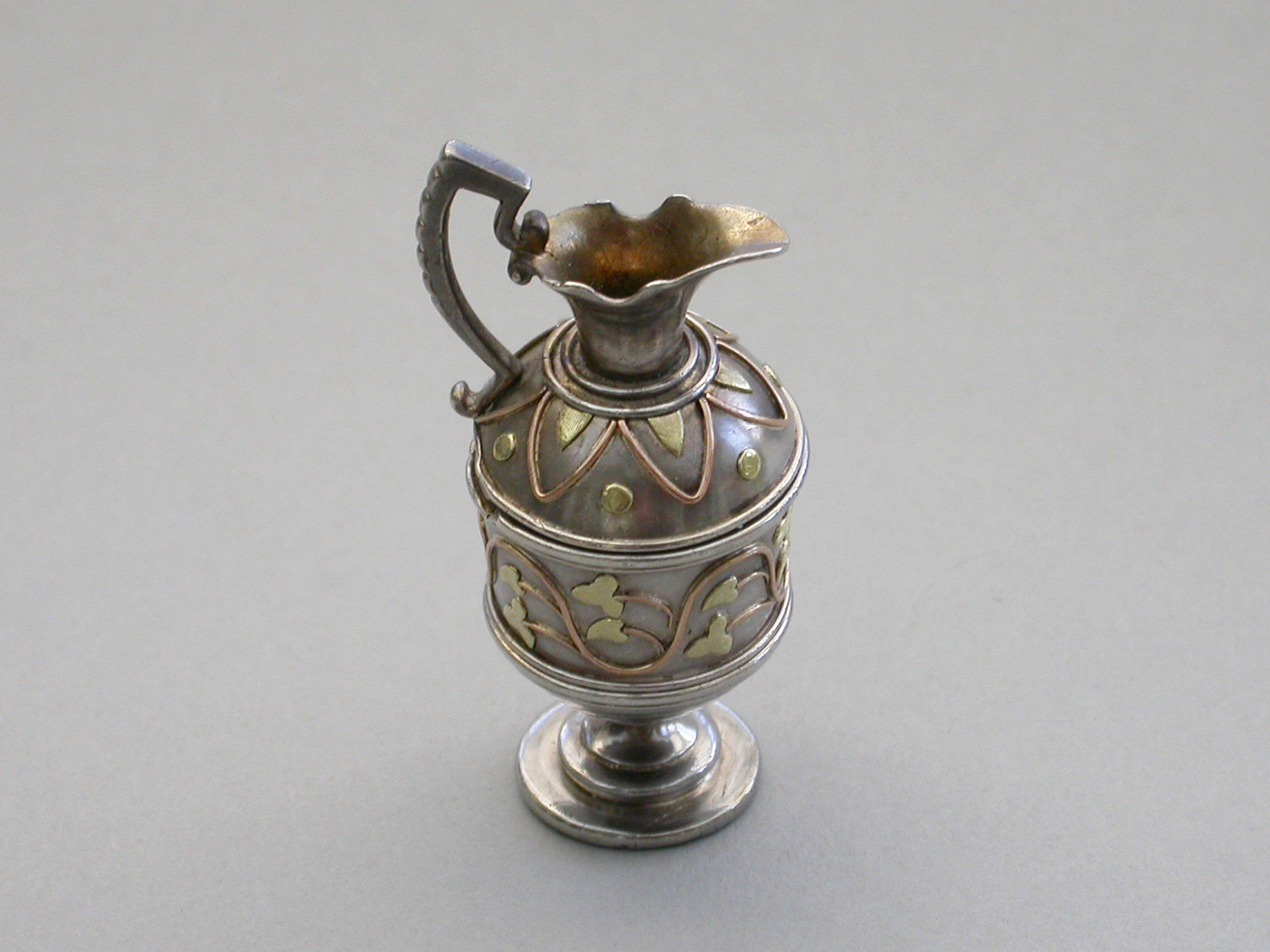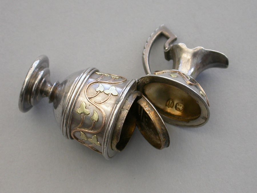 A very fine and rare Victorian novelty silver and 2-colour gold Vinaigrette made in the form of a Roman Wine Ewer, of small size and opening at the shoulder, with 2-colour gold decoration applied as an undulating foliate stem around the body and an echoing geometric pattern around the lid. The interior hinged silver gilt grille with three rows of six holes and some scrolling below.