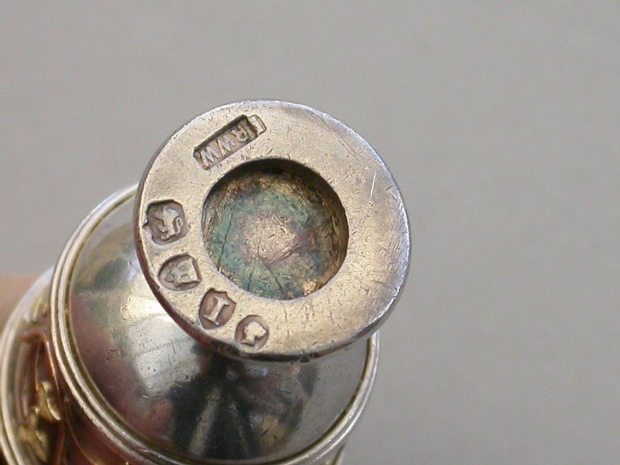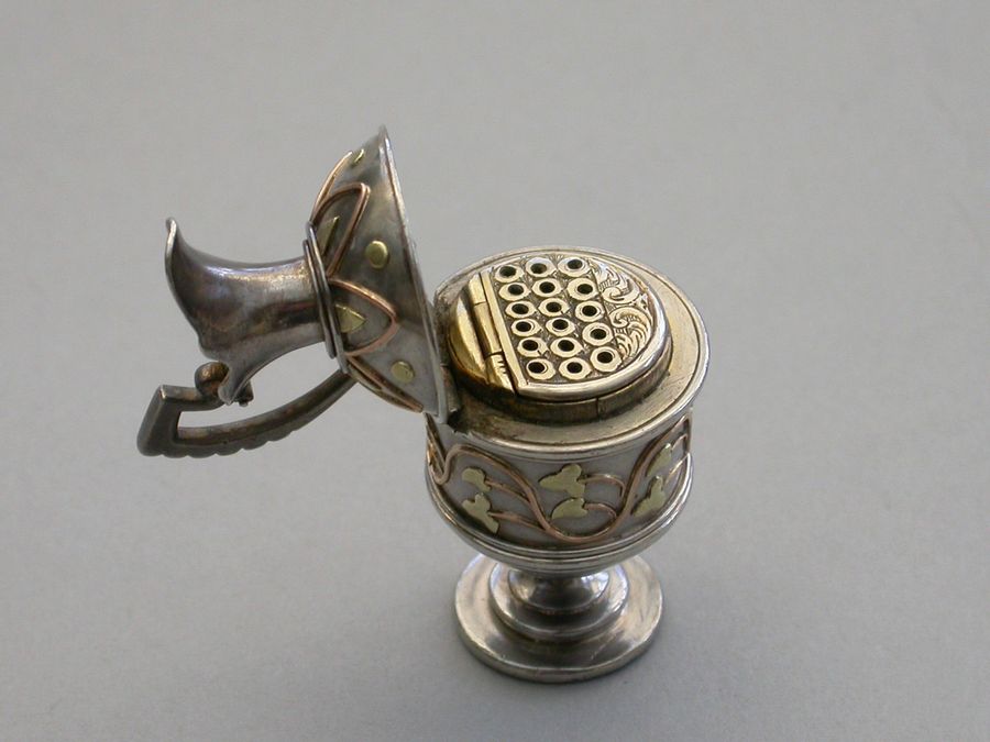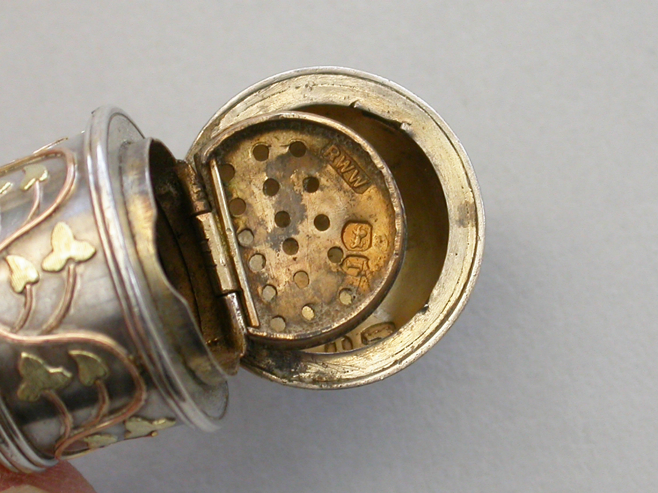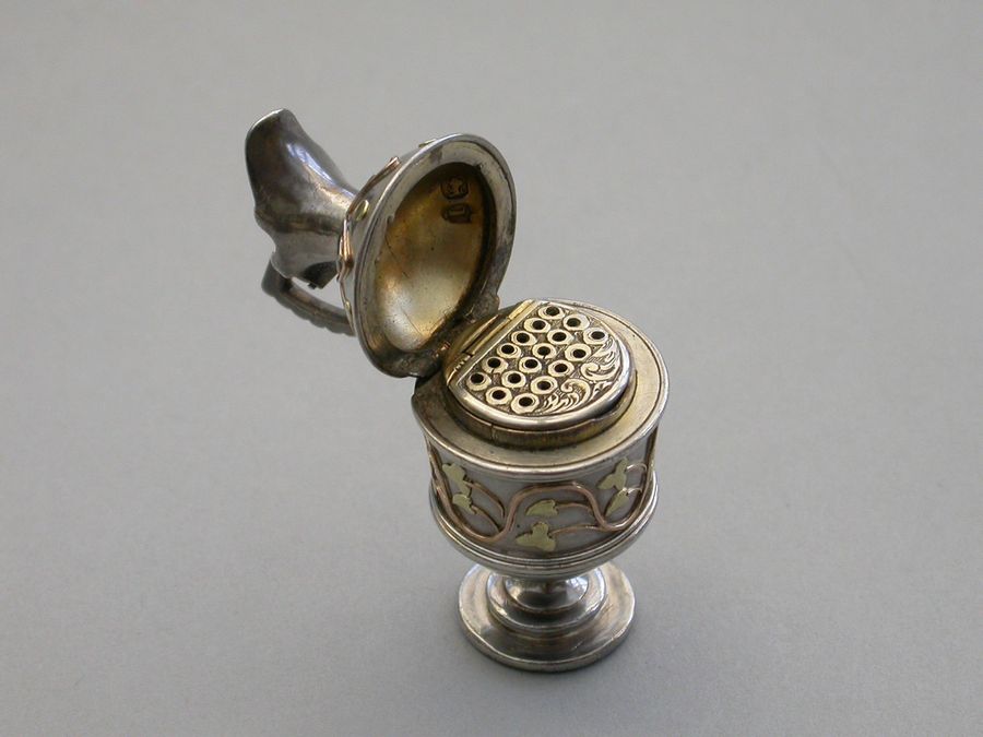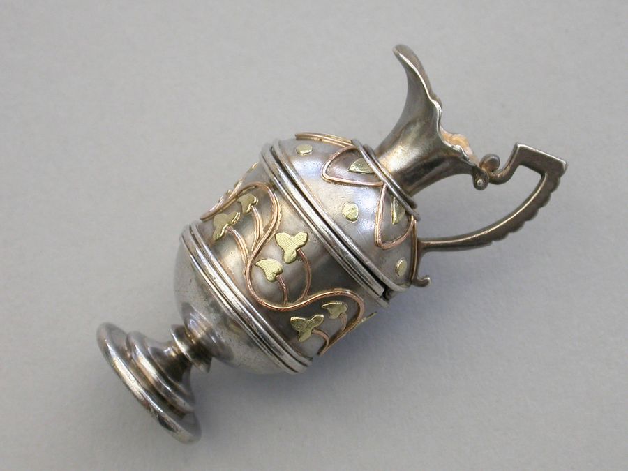 A very fine and rare Victorian novelty silver and 2-colour gold Vinaigrette made in the form of a Roman Wine Ewer, of small size and opening at the shoulder, with 2-colour gold decoration applied as an undulating foliate stem around the body and an echoing geometric pattern around the lid. The interior hinged silver gilt grille with three rows of six holes and some scrolling below.