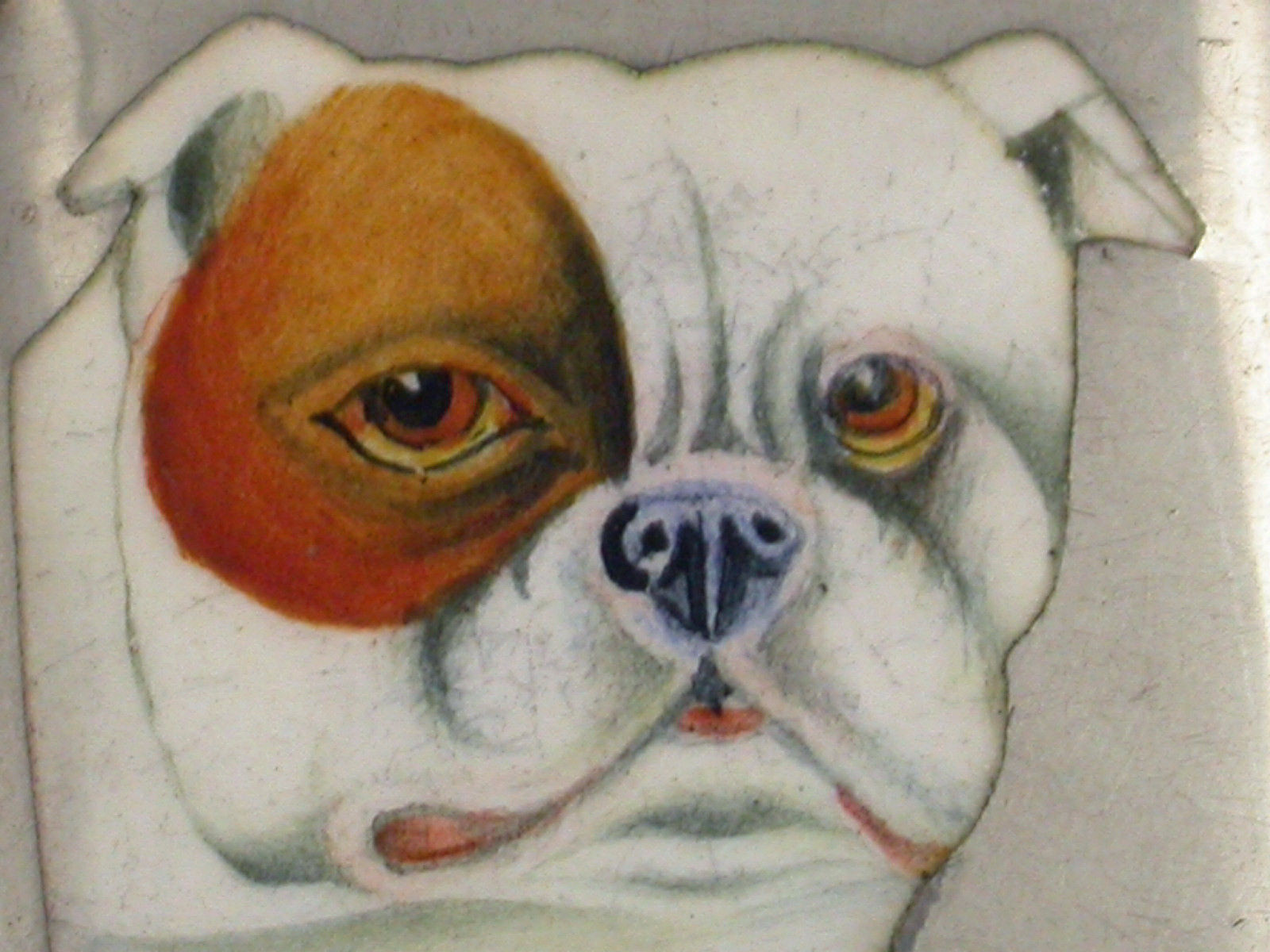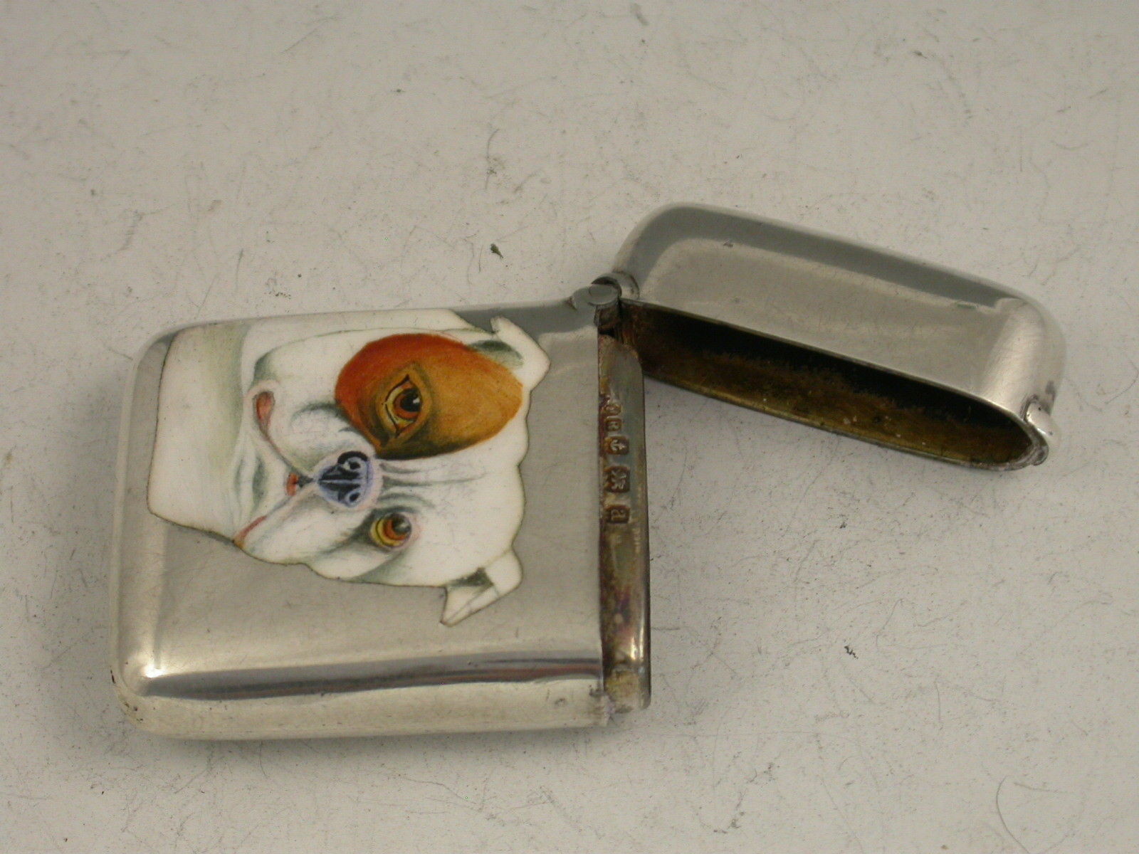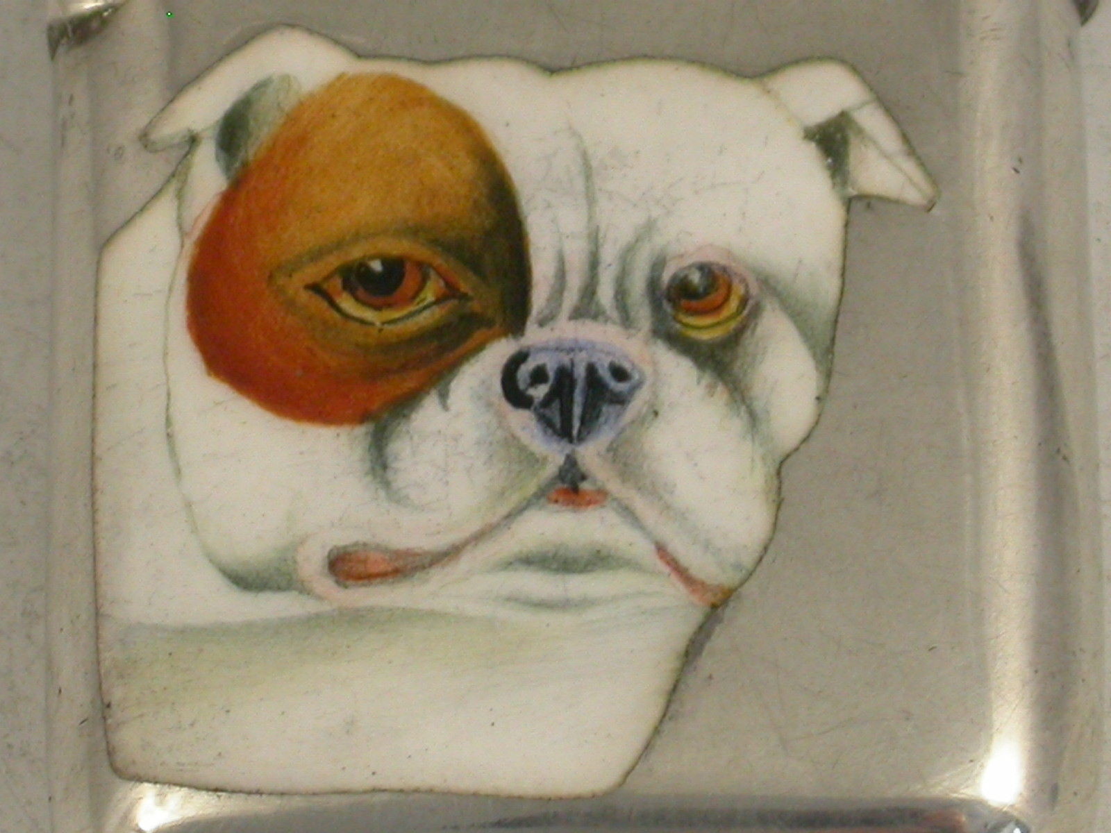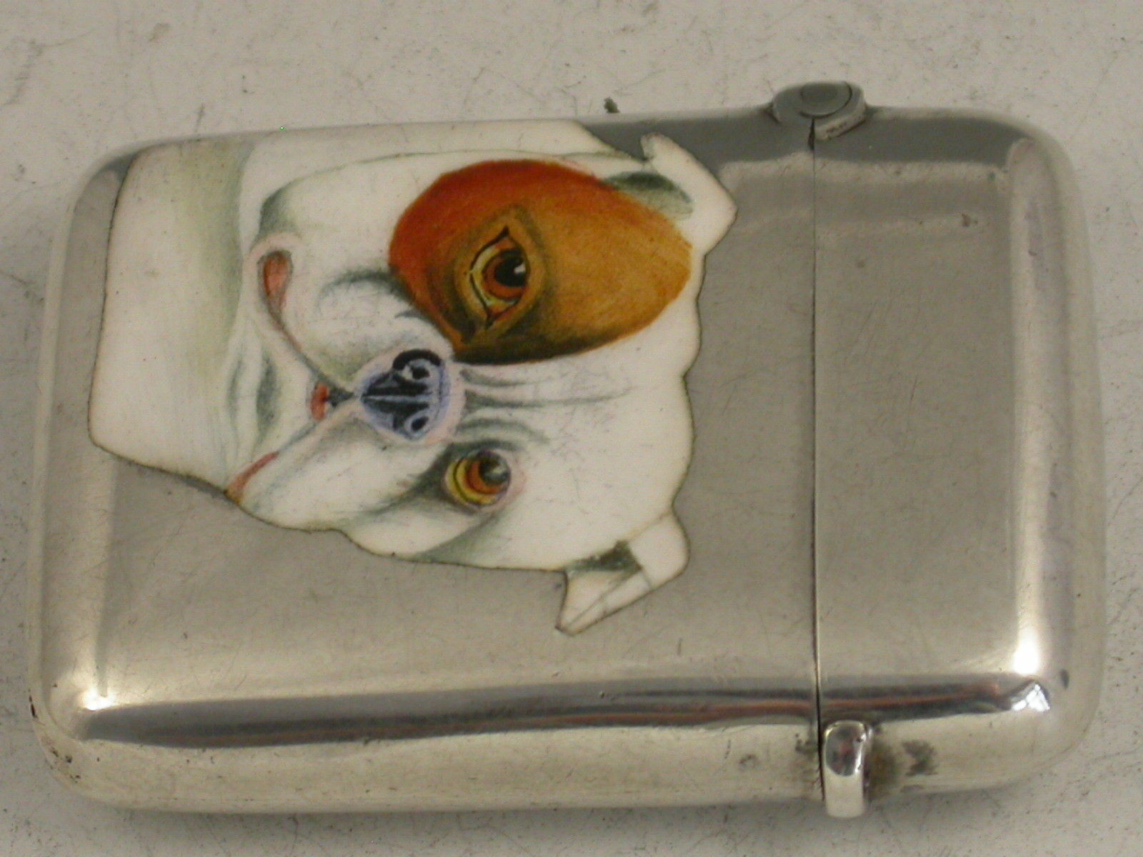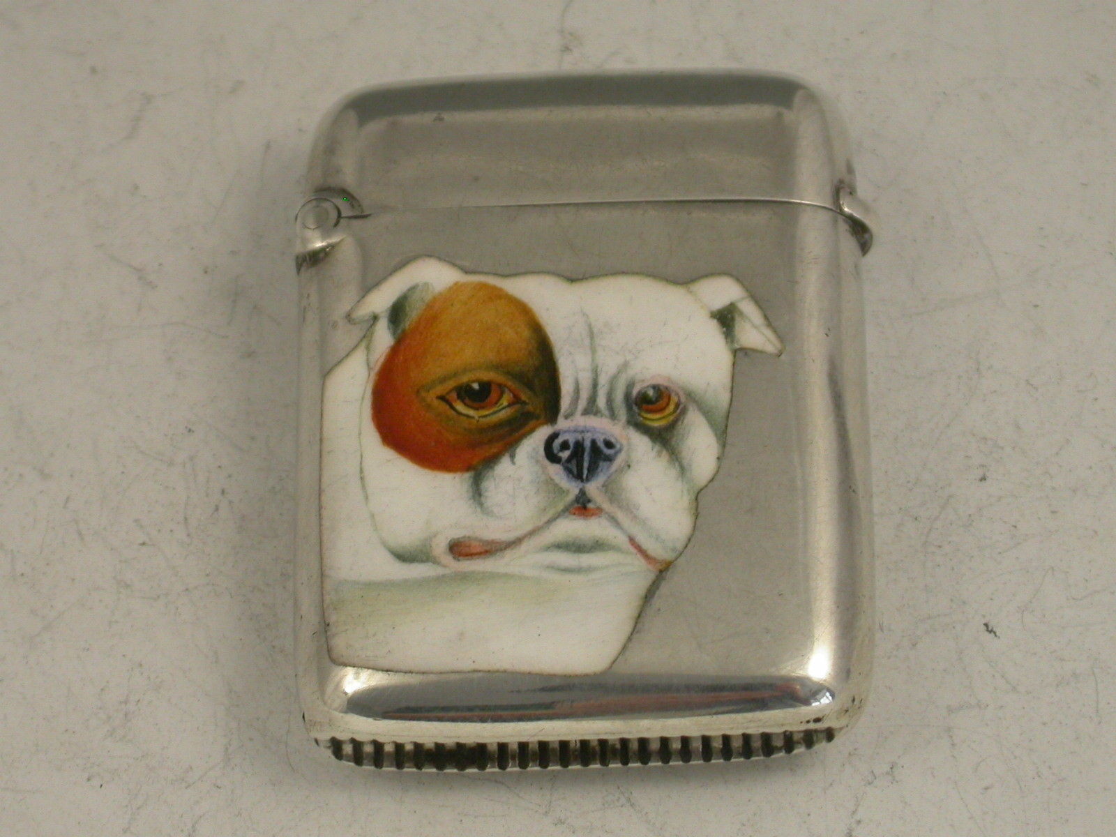 A fine quality late Victorian silver and enamel Vesta Case of rounded rectangular form with hinged flip top lid, the face enamelled with a portrait of a British Bulldog.
