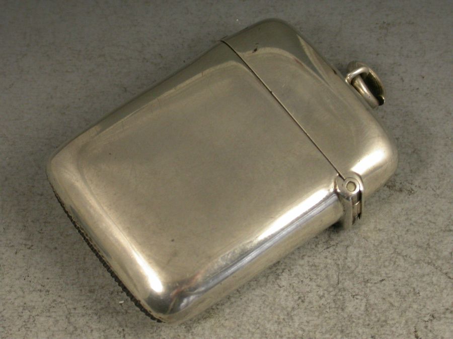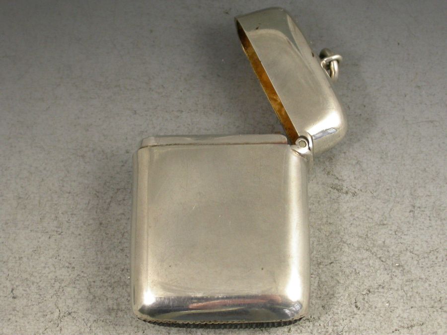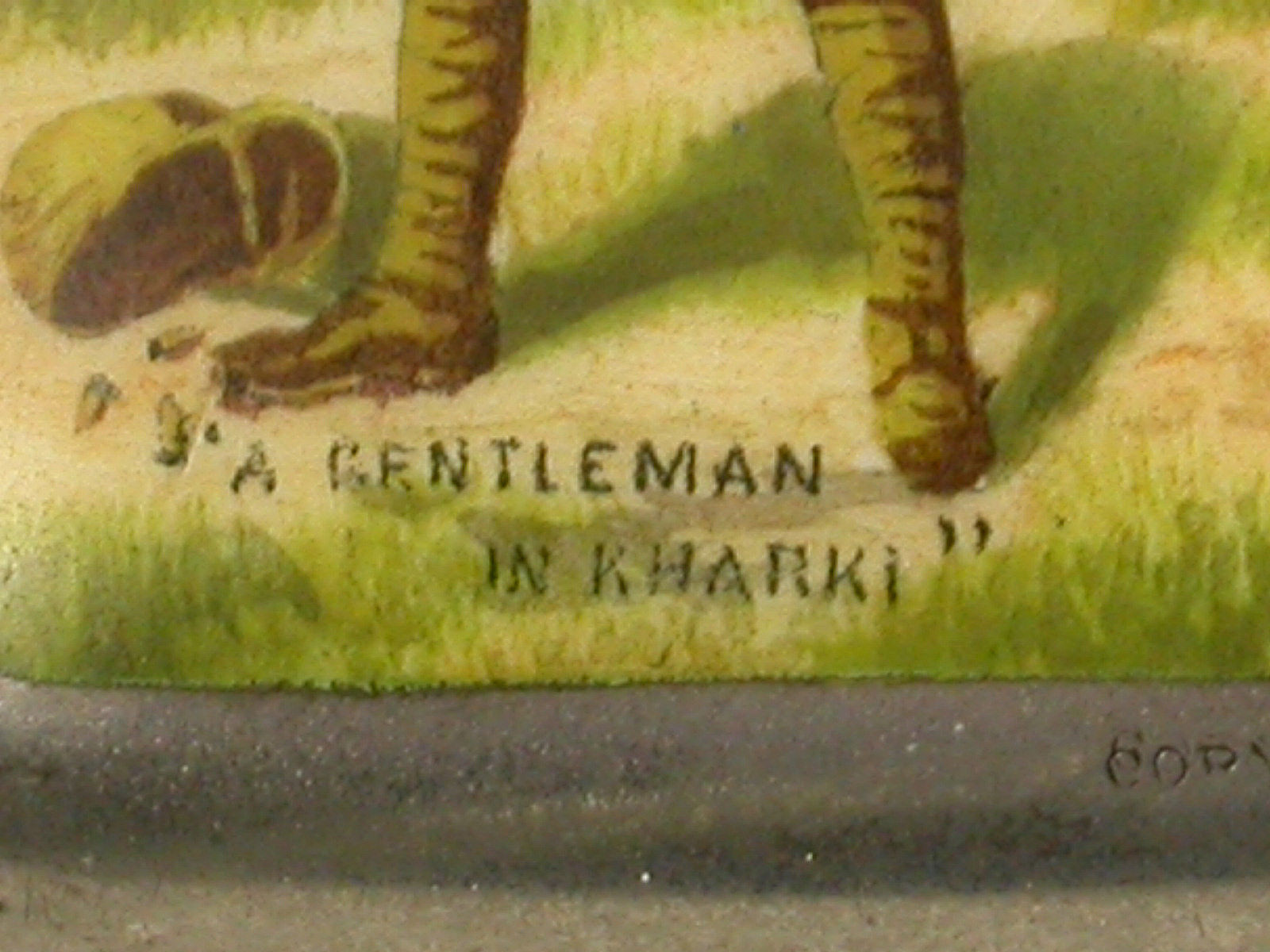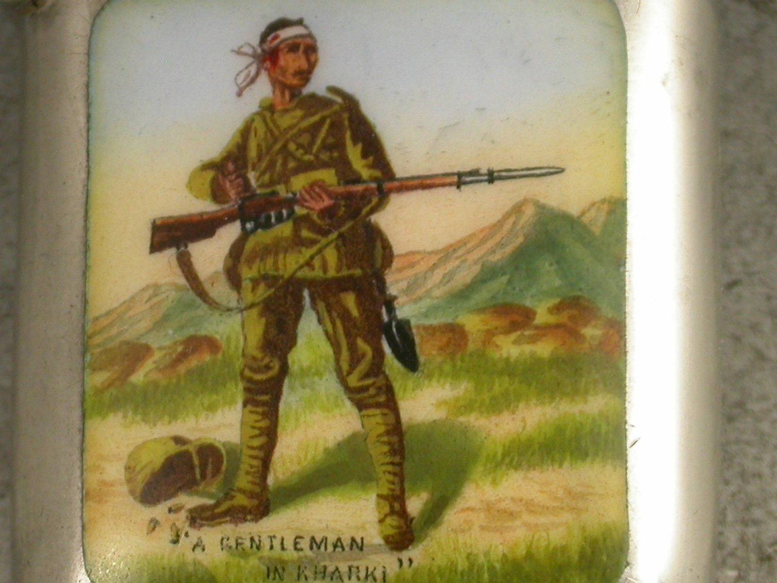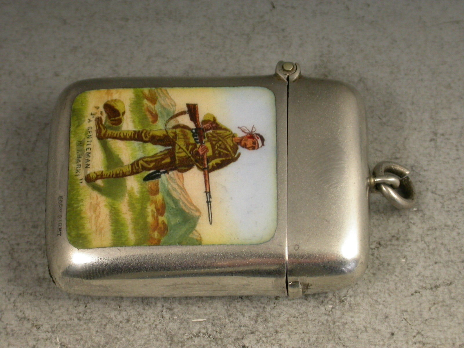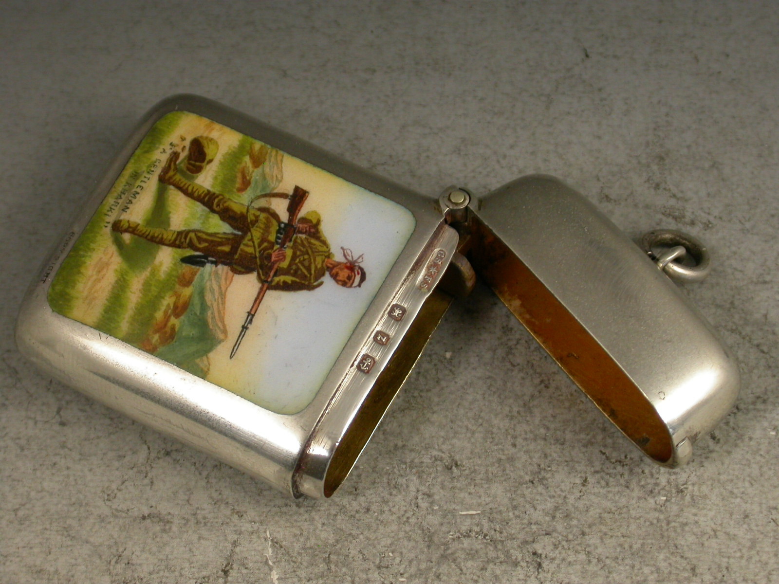 A good Victorian silver and enamel Vesta Case of rounded rectangular form with hinged flip top lid and attached suspension ring, the front with an enameled panel depicting ""A Gentleman in Khaki"", a wounded soldier from the Boer War carrying his rifle. Also stamped ""Copyright"" to the case. A 'Gentleman in Khaki' comes from a line in the Rudyard Kipling poem 'The Absent Minded Beggar'.