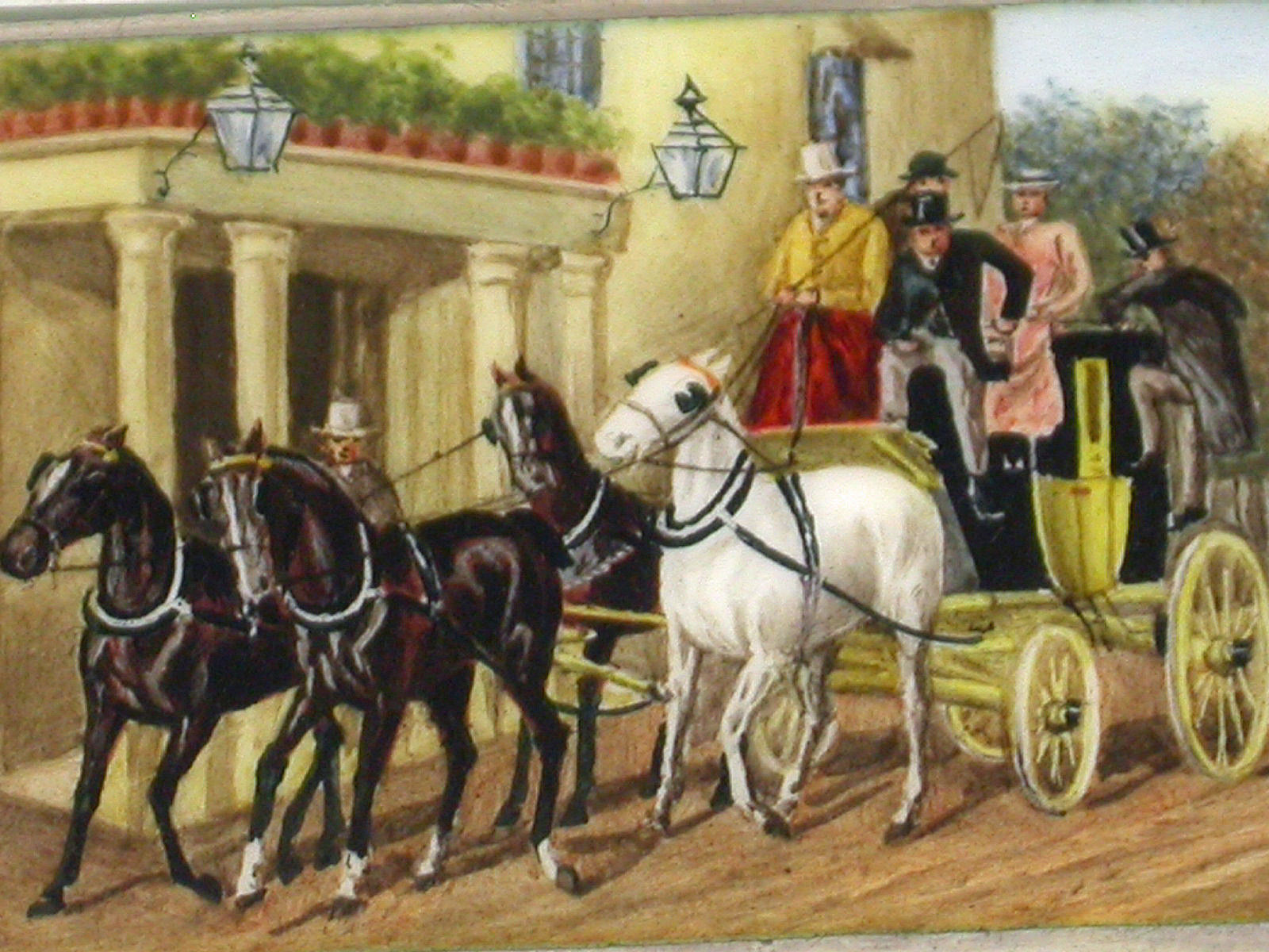 A very fine Victorian silver Vesta Case of rectangular form with flat hinged flip-top lid, the face enamelled with a scene depicting a horse drawn carriage arriving outside of a large house.