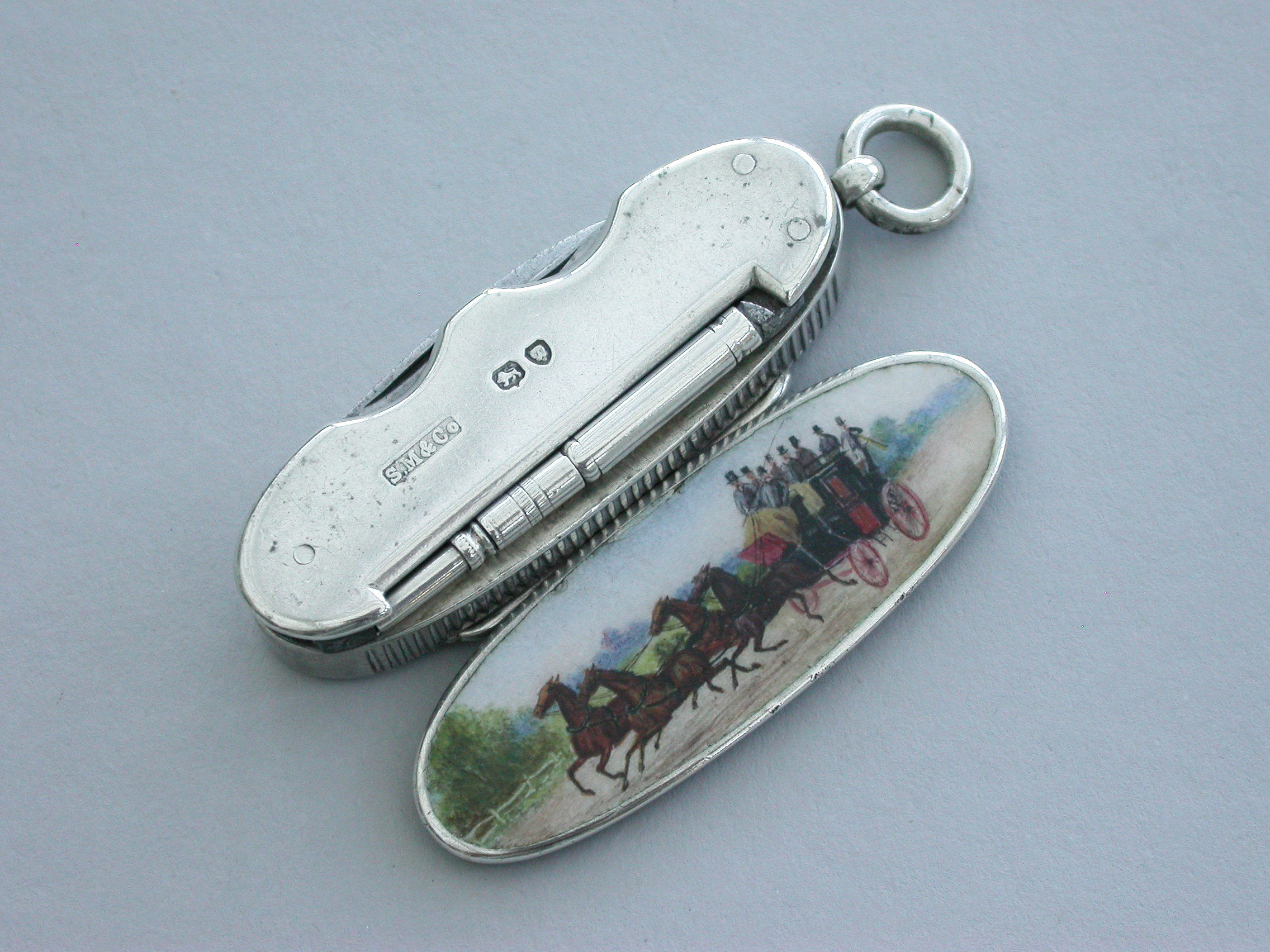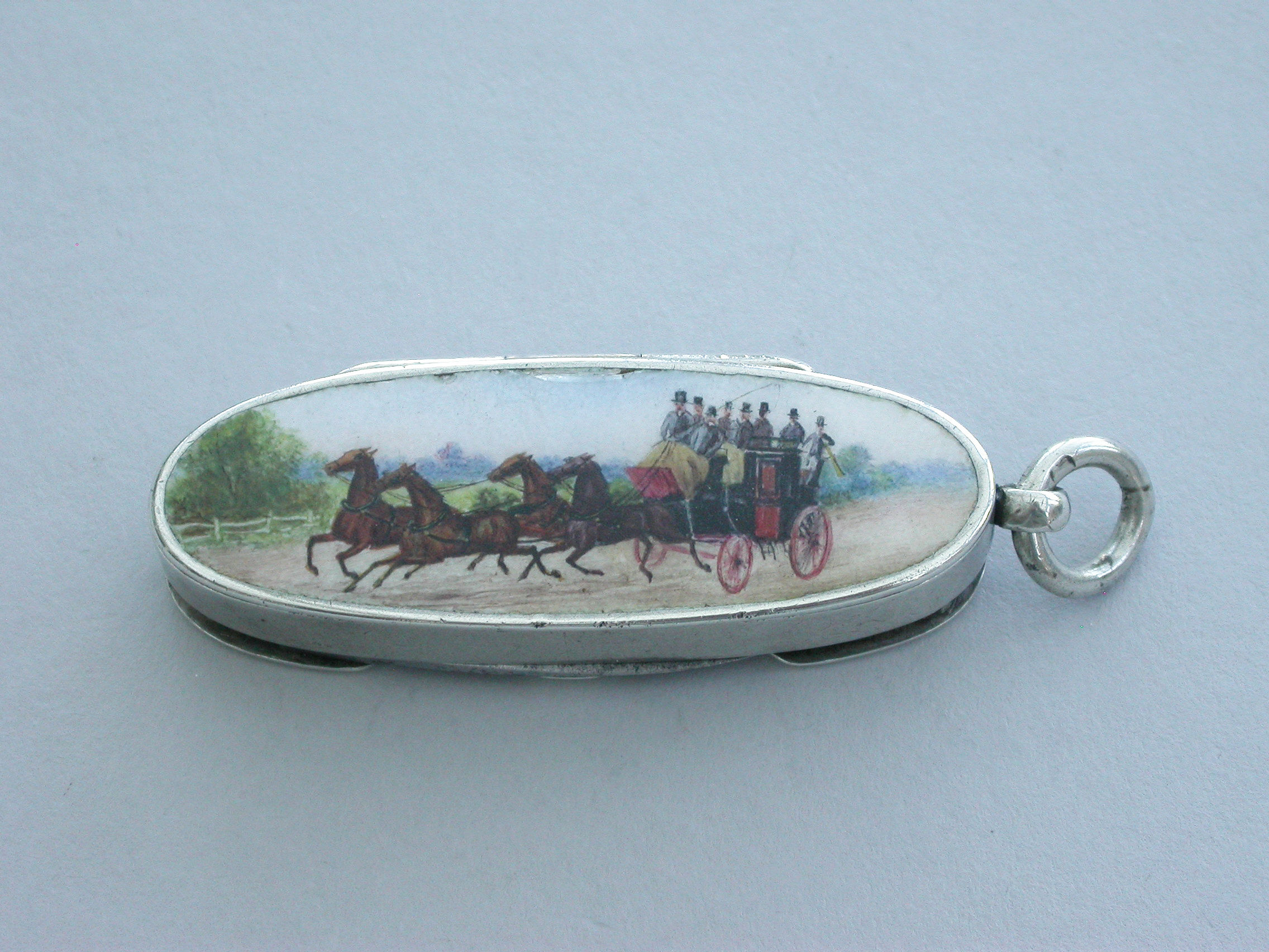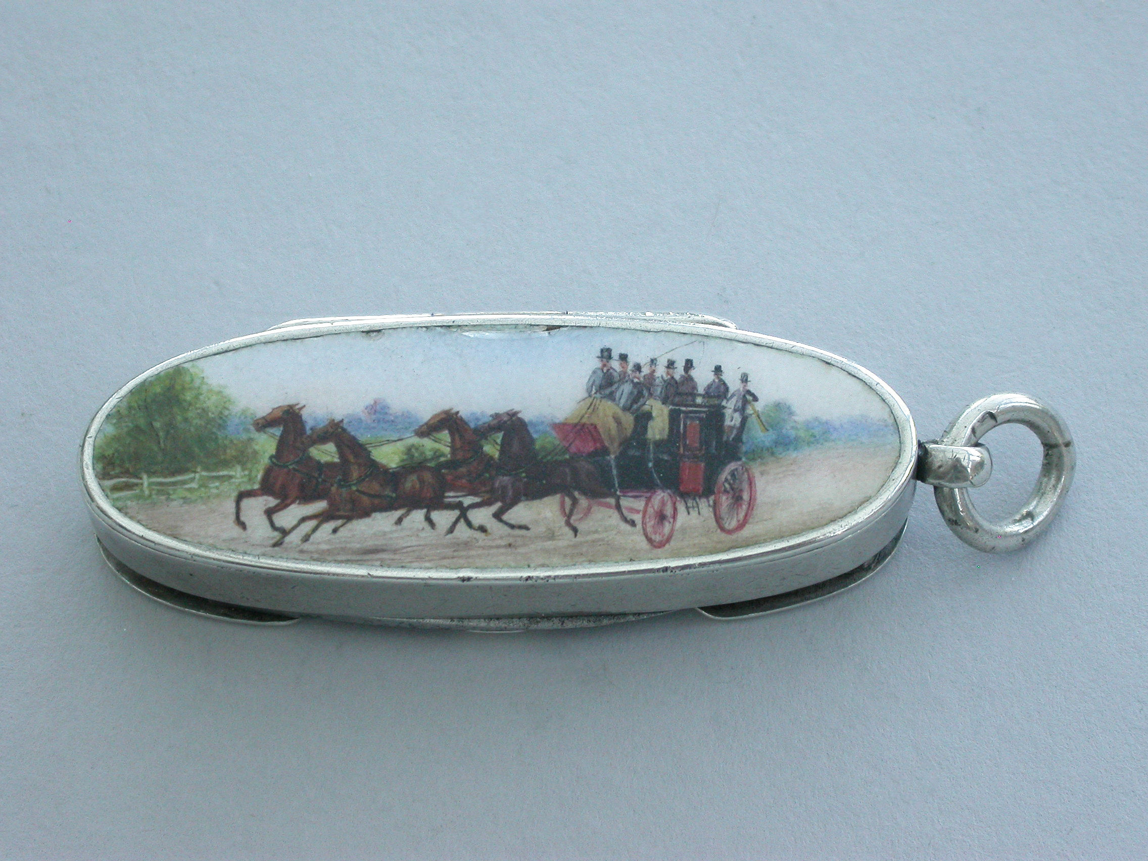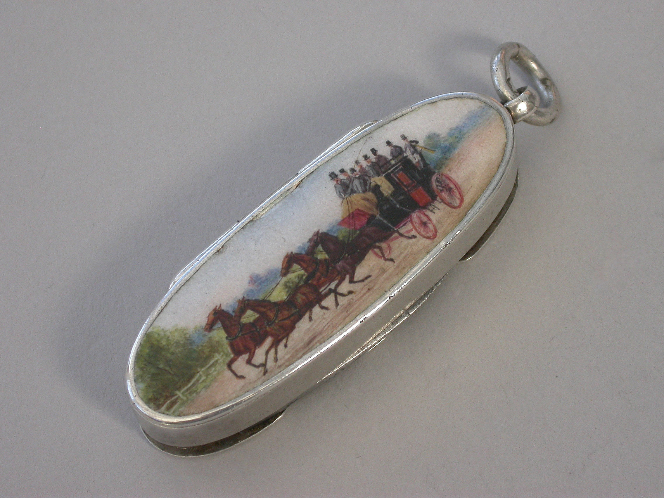 A fine and rare Victorian silver and enamel combination Vesta Case / Pencil / Pen Knife, of rounded oblong form with attached suspension ring, the base enamelled with a coaching scene, two fold-out steel blades and a propelling pencil. Silver gilt interior.