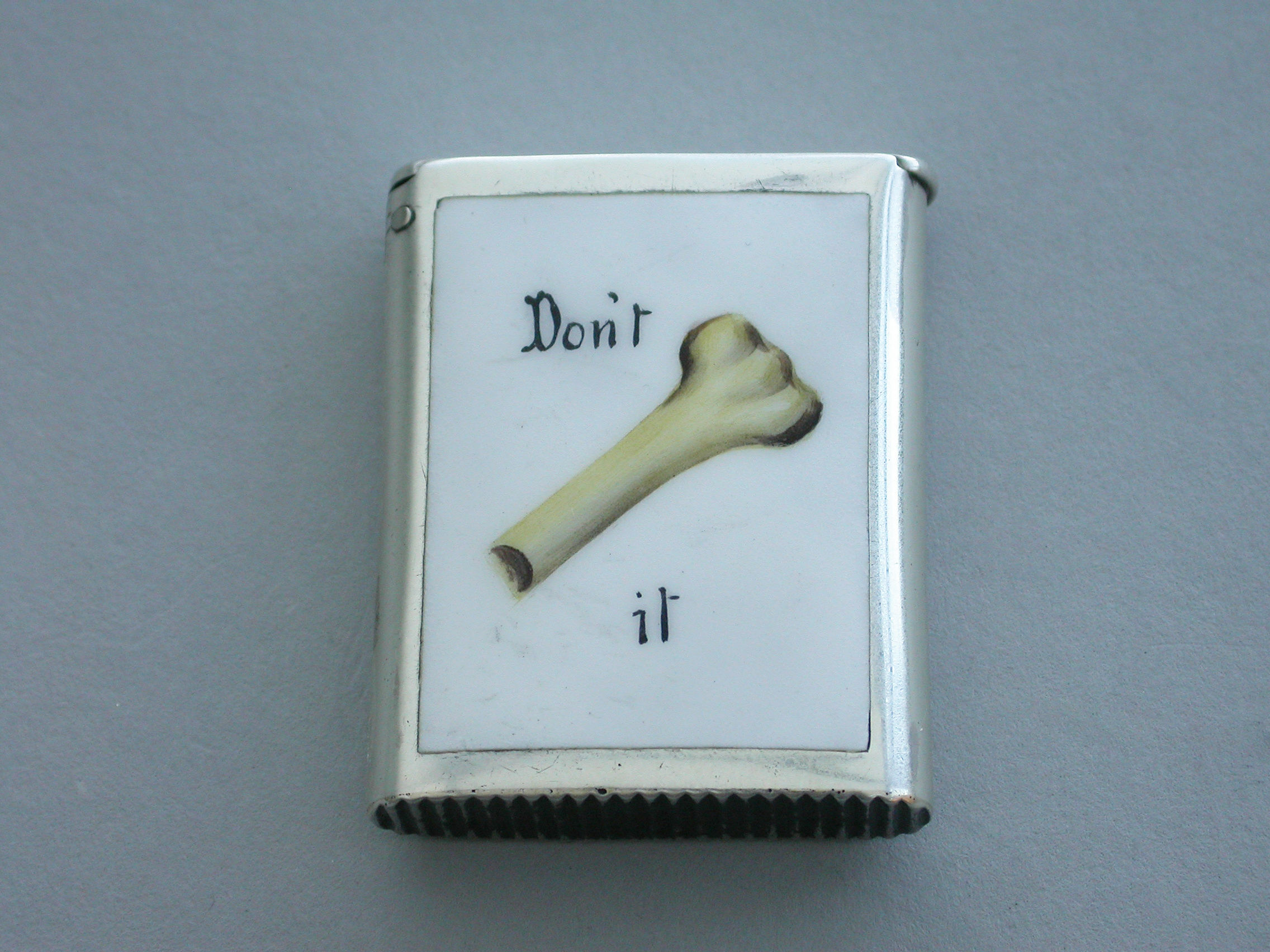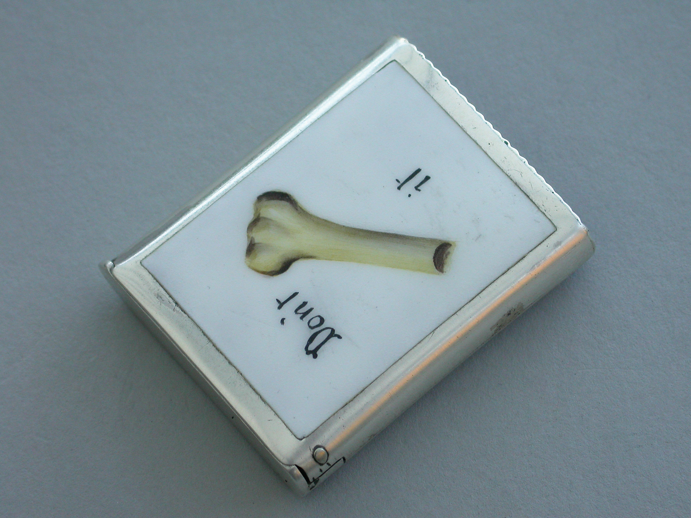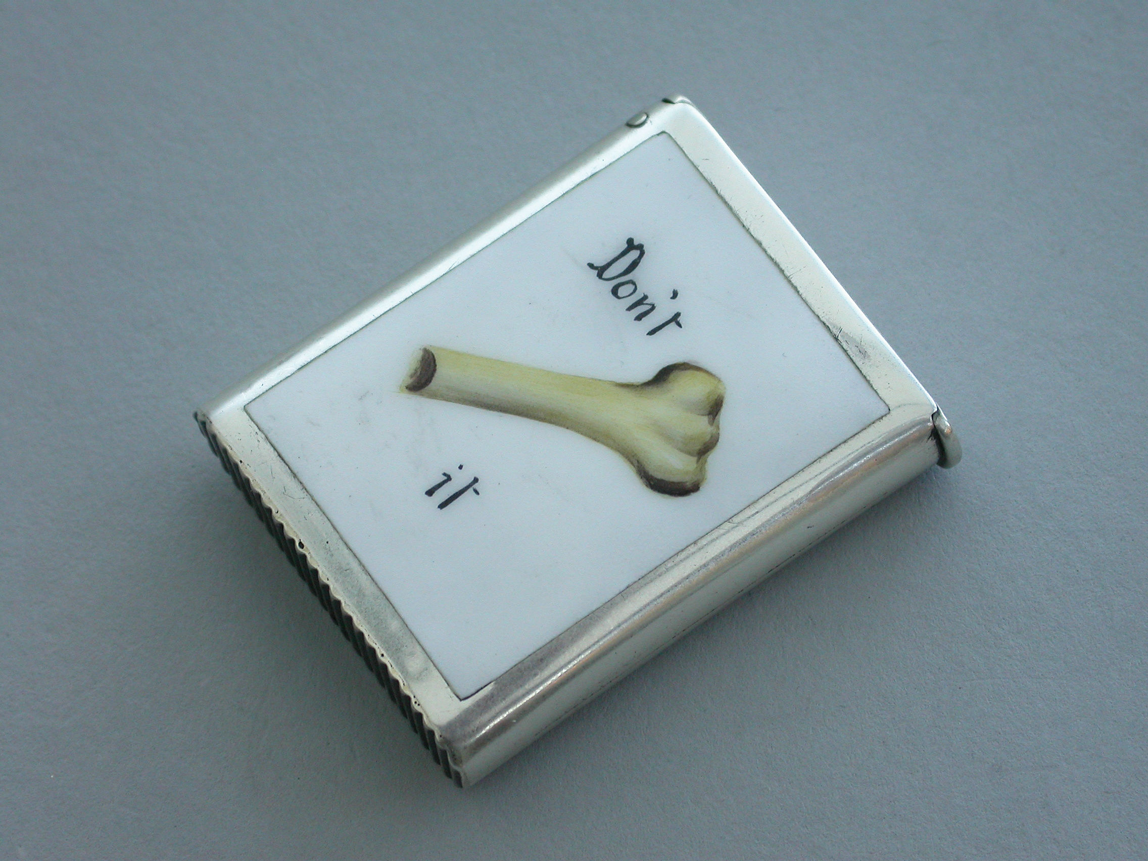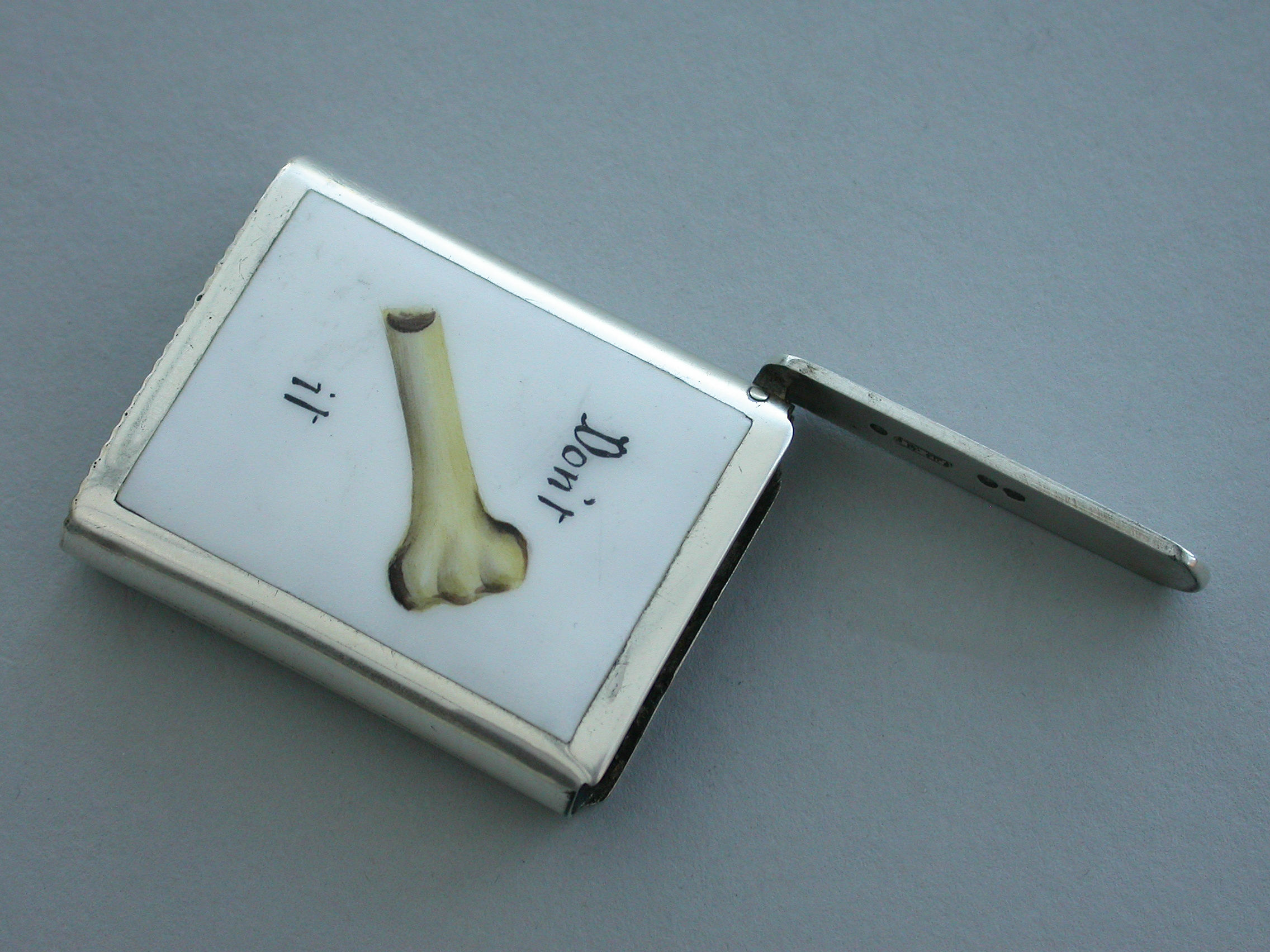 An interesting Victorian silver and enamel ""Riddle"" Vesta Case of plain rectangular form with sprung flat-top hinged lid, the face inset with white enamel panel and the words 'Don't and It' either side of half a bone - ""Don't Half Bone It"