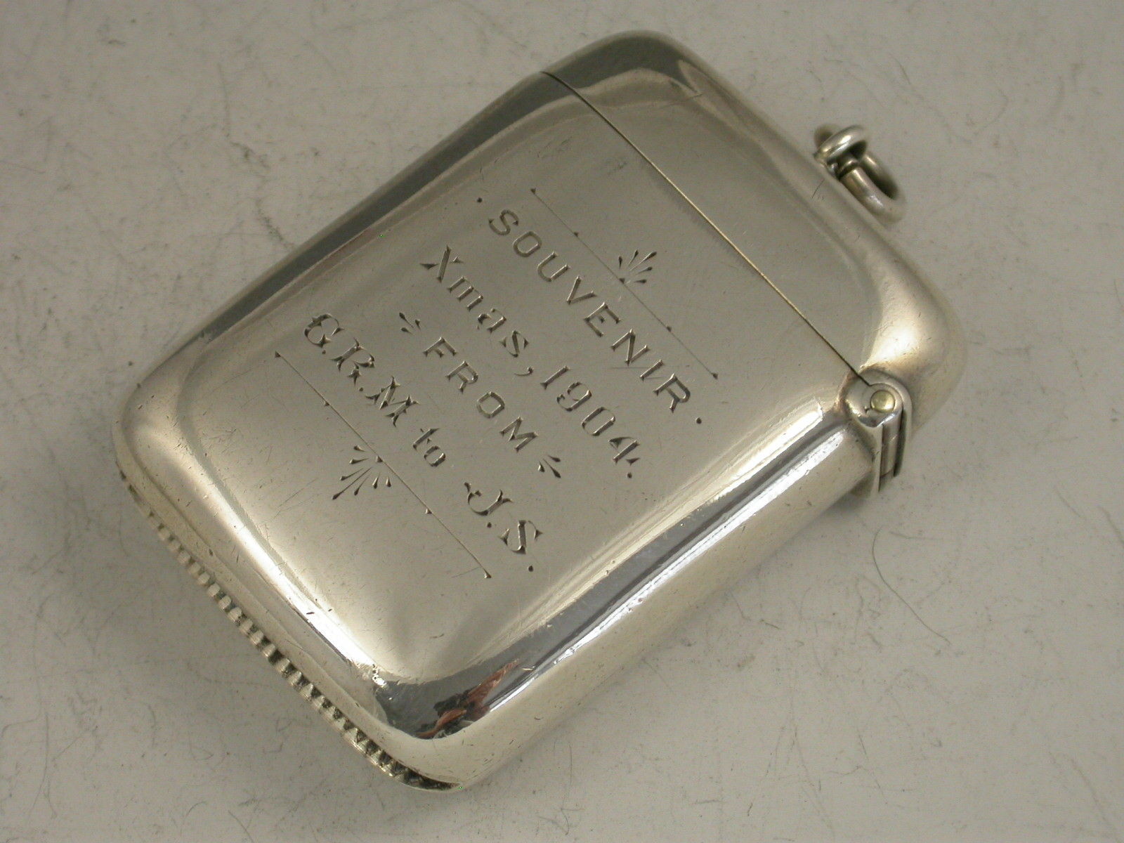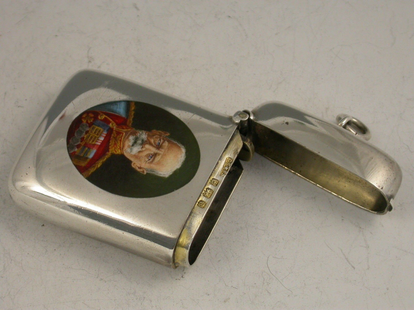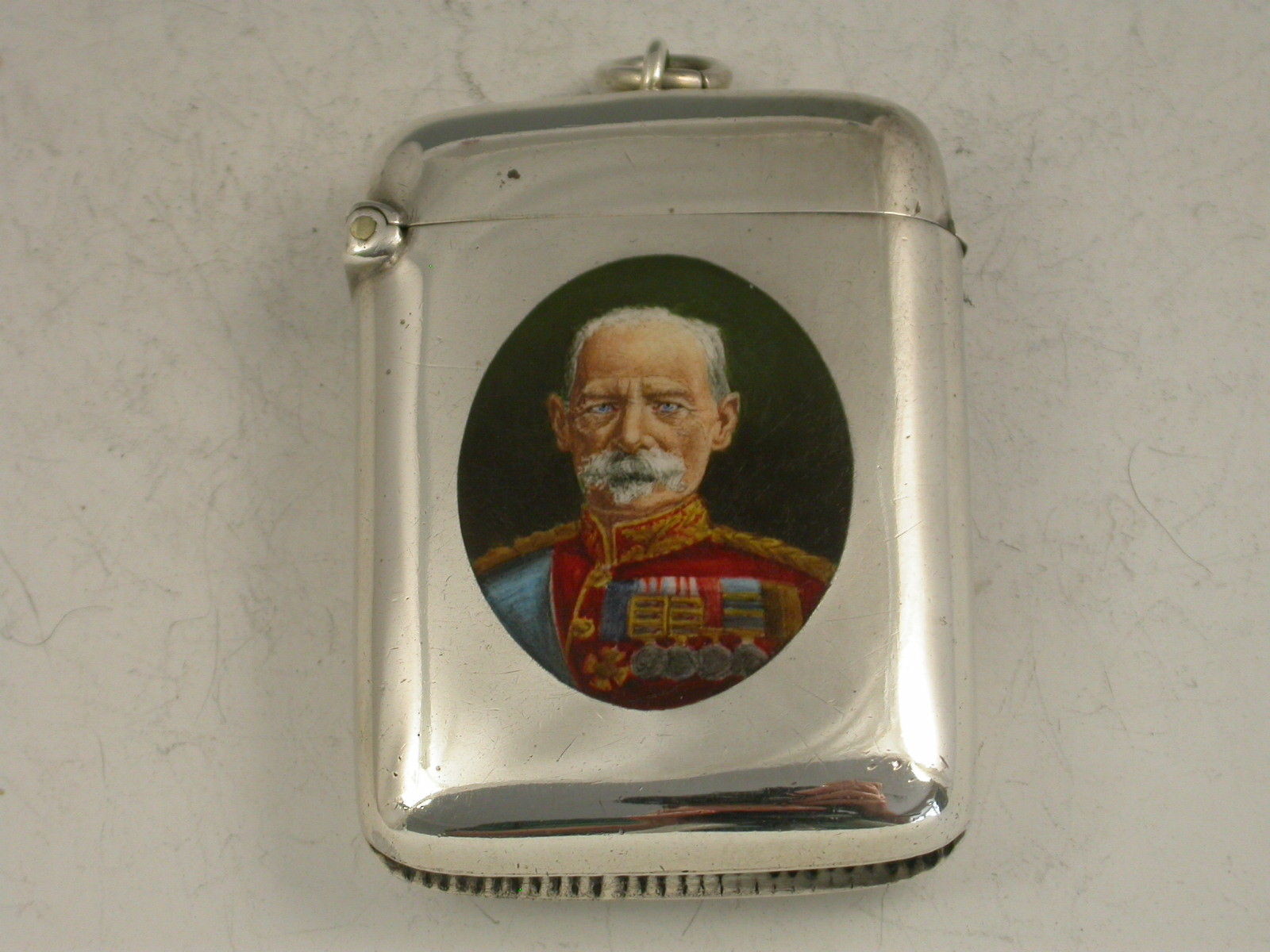 A very fine and rare Victorian silver and enamel Vesta Case of rounded rectangular form with hinged flip top lid, the face with an oval inset panel enamelled with a portrait of Field Marshall The Earl Roberts. The reverse with presentation inscription.