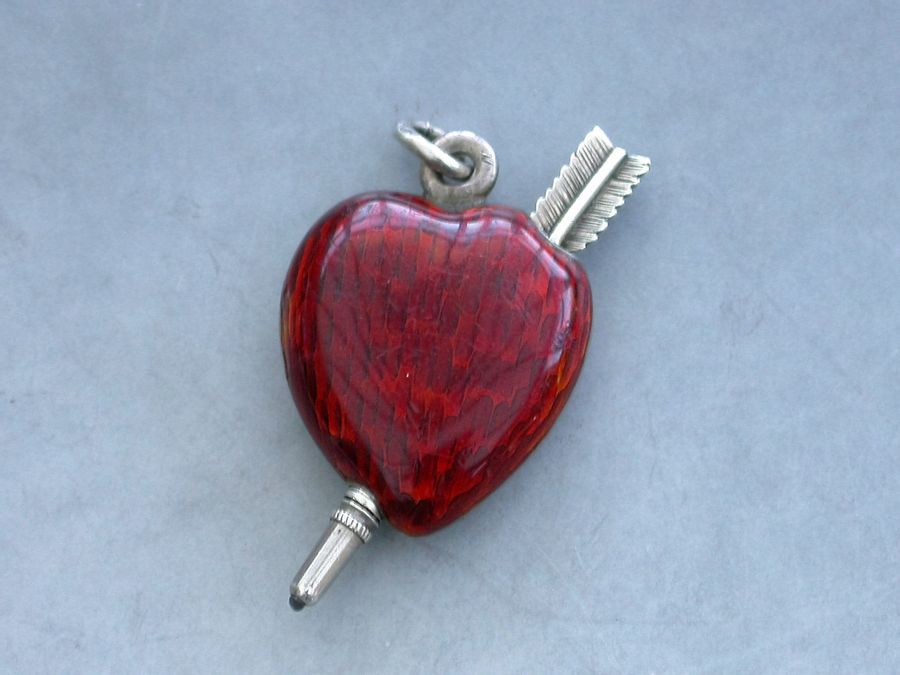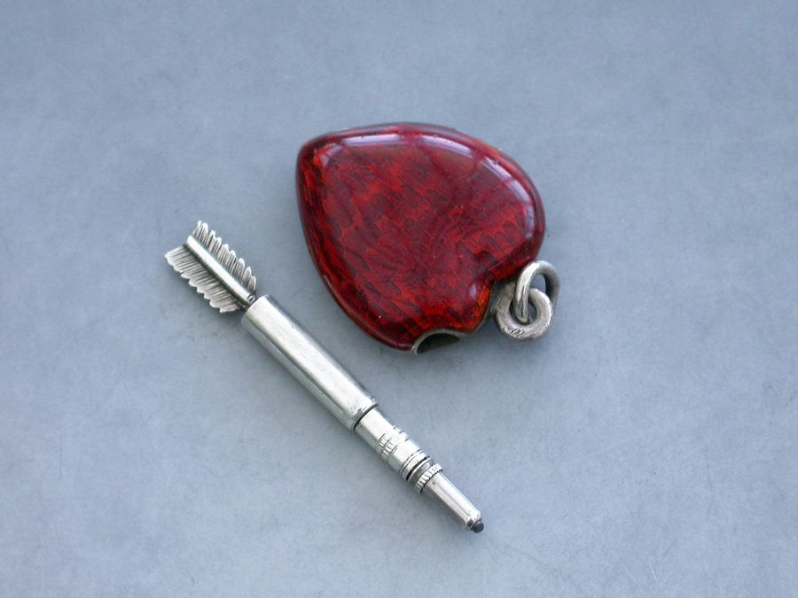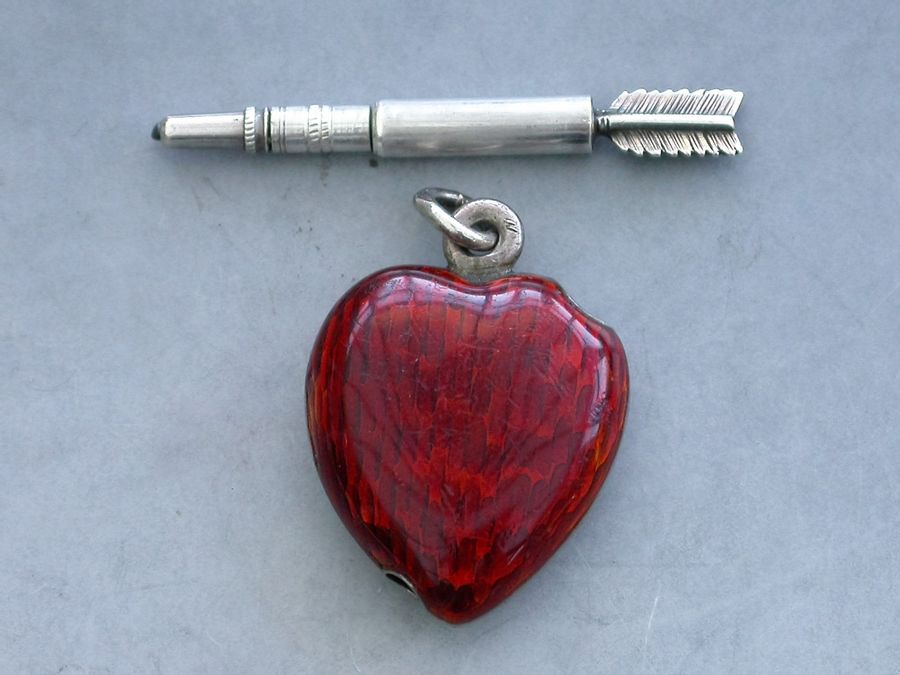 A Victorian silver and red guilloche enamel heart shaped pendant with attached suspension ring, pierced by an arrow shaped silver propelling pencil. The silver stamped with the registered design number 226357, dating it to c1894.