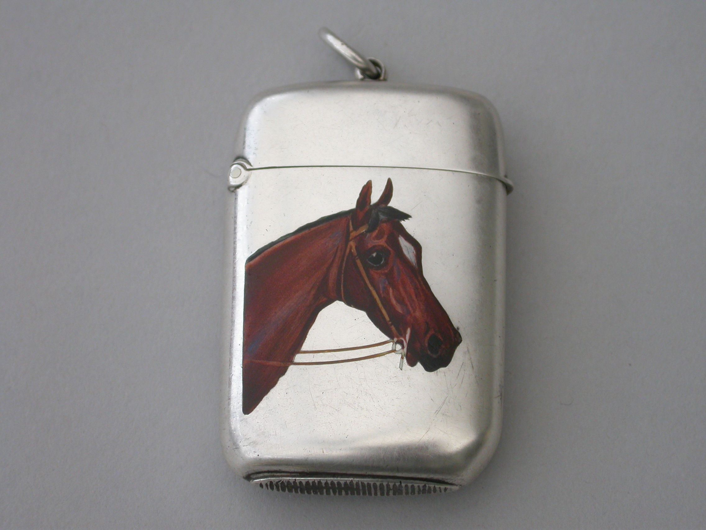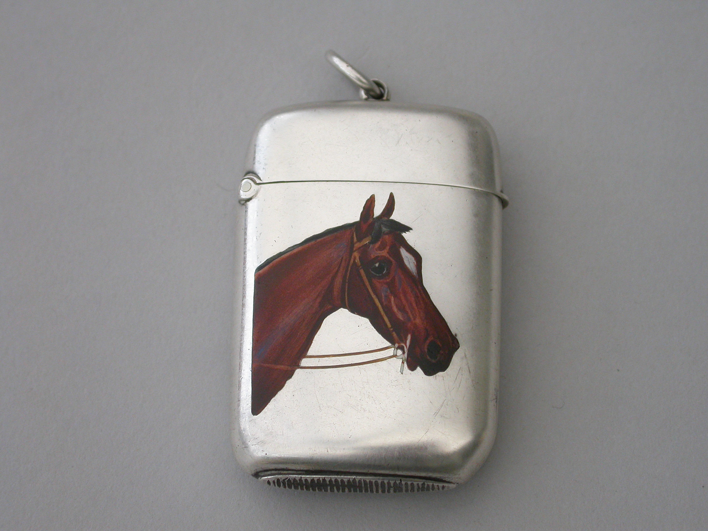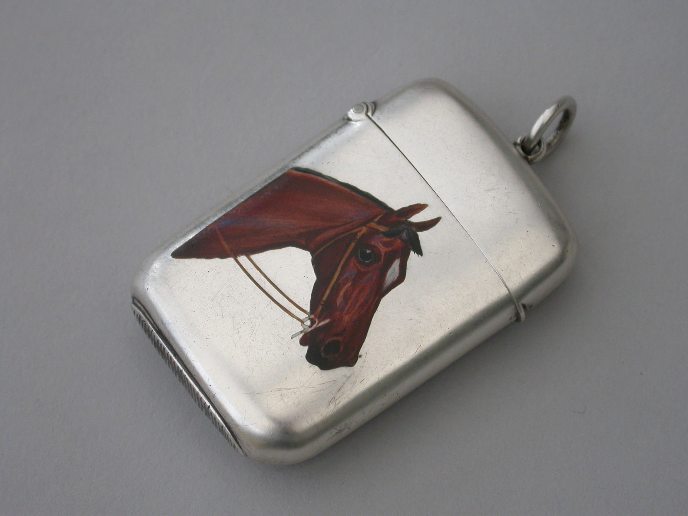 A good quality Victorian silver and enamel Vesta Case of rounded rectangular form with sprung hinged lid and attached suspension ring, the face finely enameled with a depiction of a Thoroughbred Horses Head. The reverse engraved with contemporary initials.