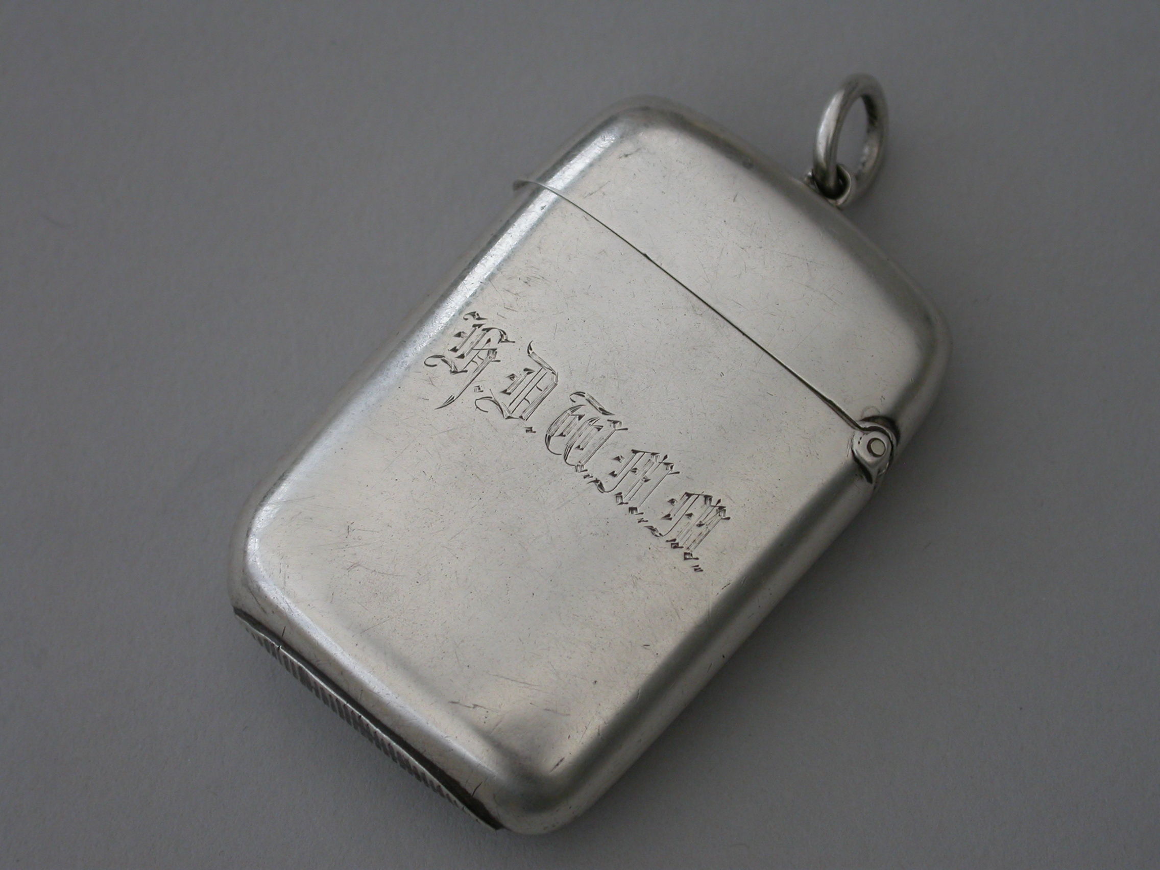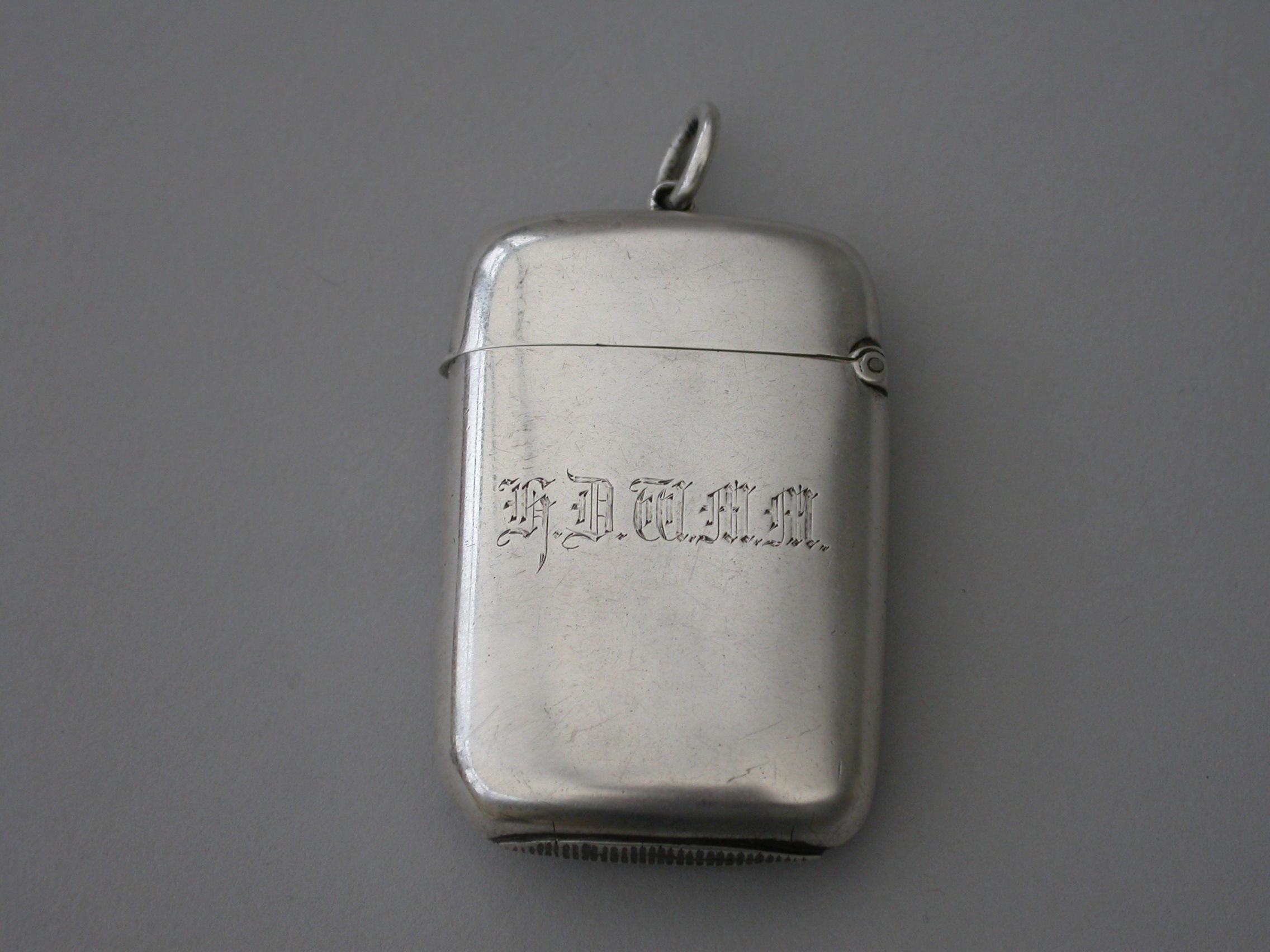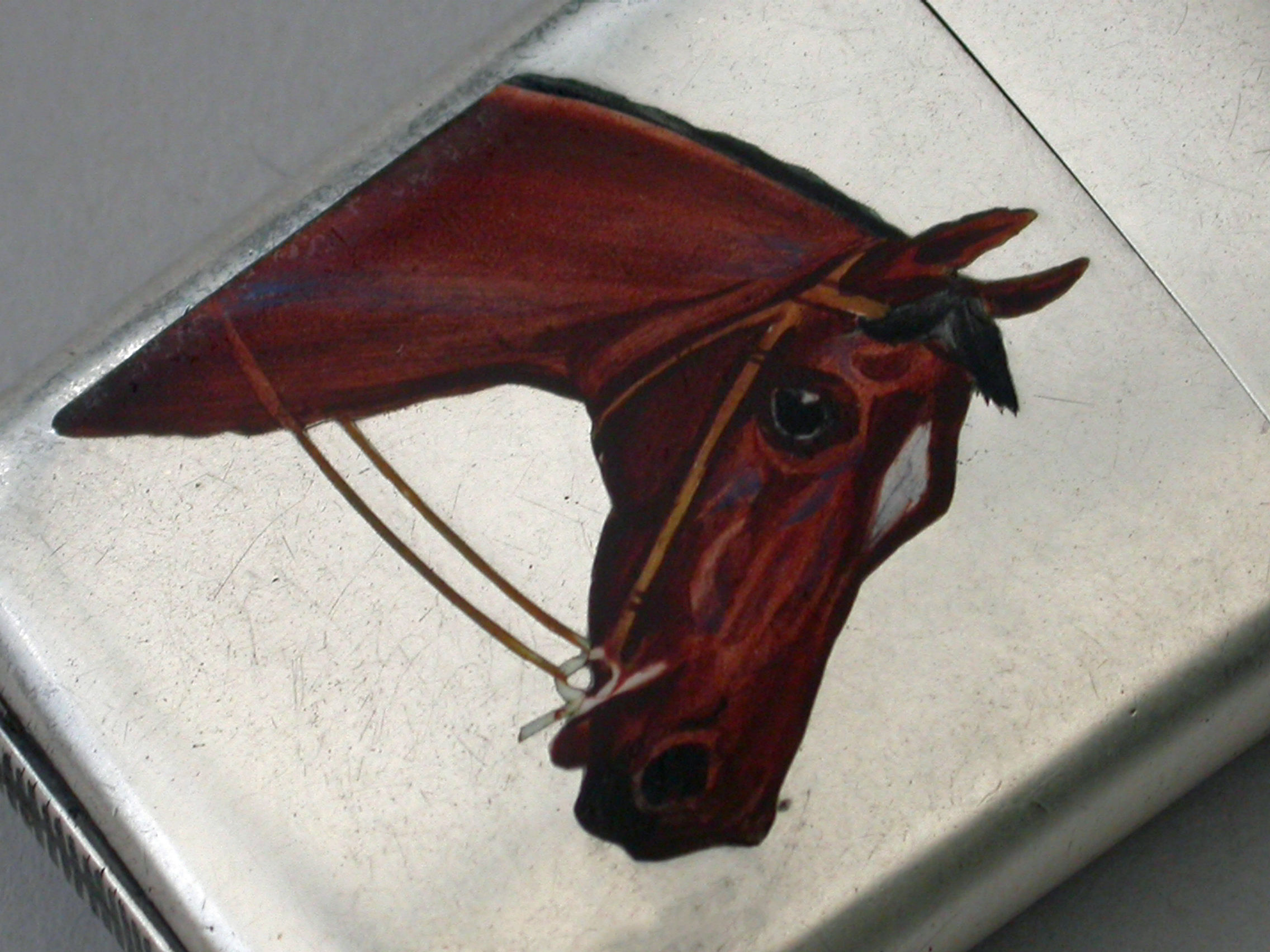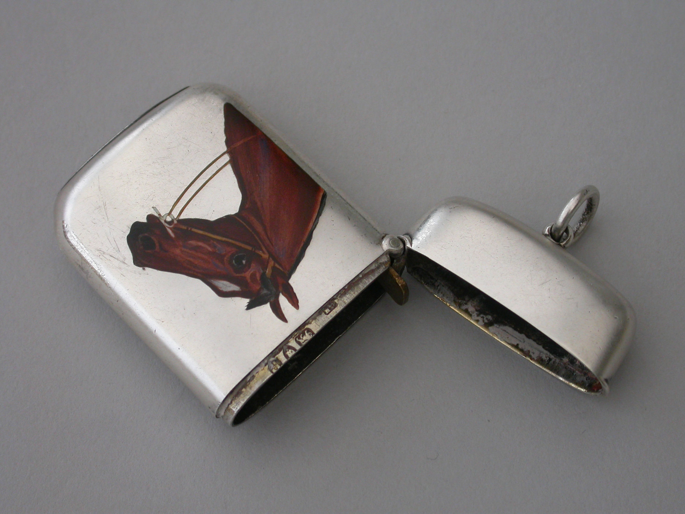 A good quality Victorian silver and enamel Vesta Case of rounded rectangular form with sprung hinged lid and attached suspension ring, the face finely enameled with a depiction of a Thoroughbred Horses Head. The reverse engraved with contemporary initials.