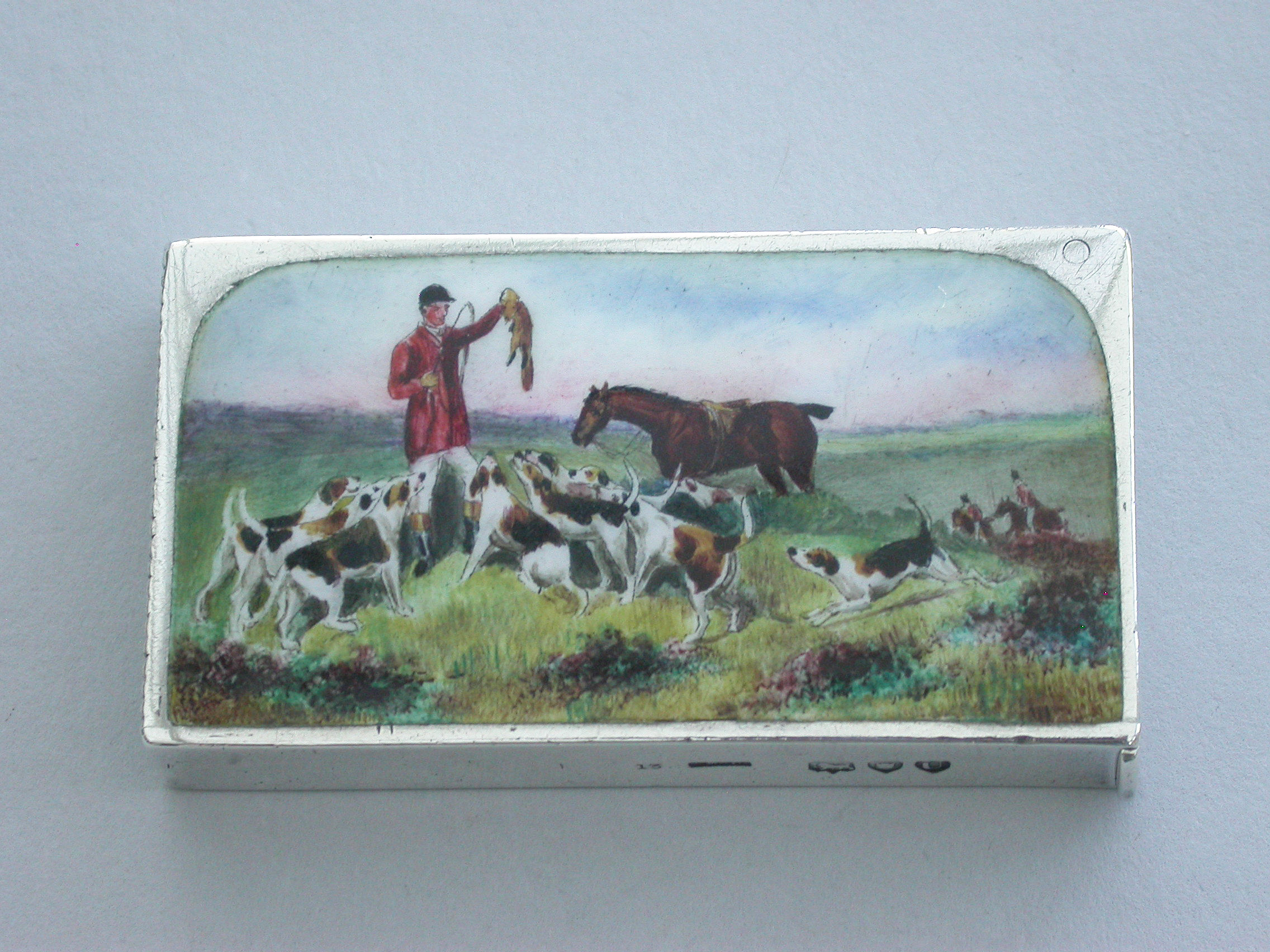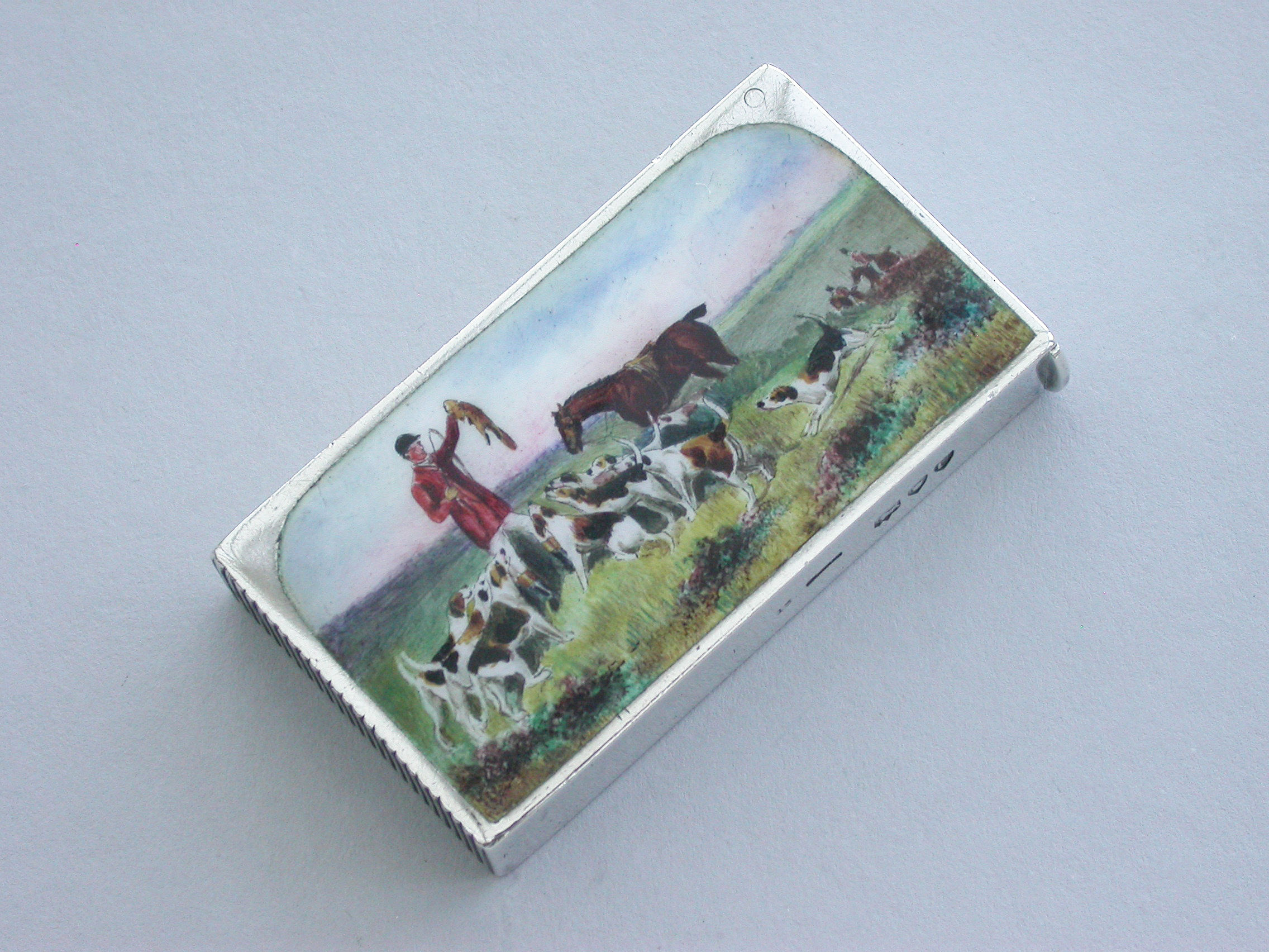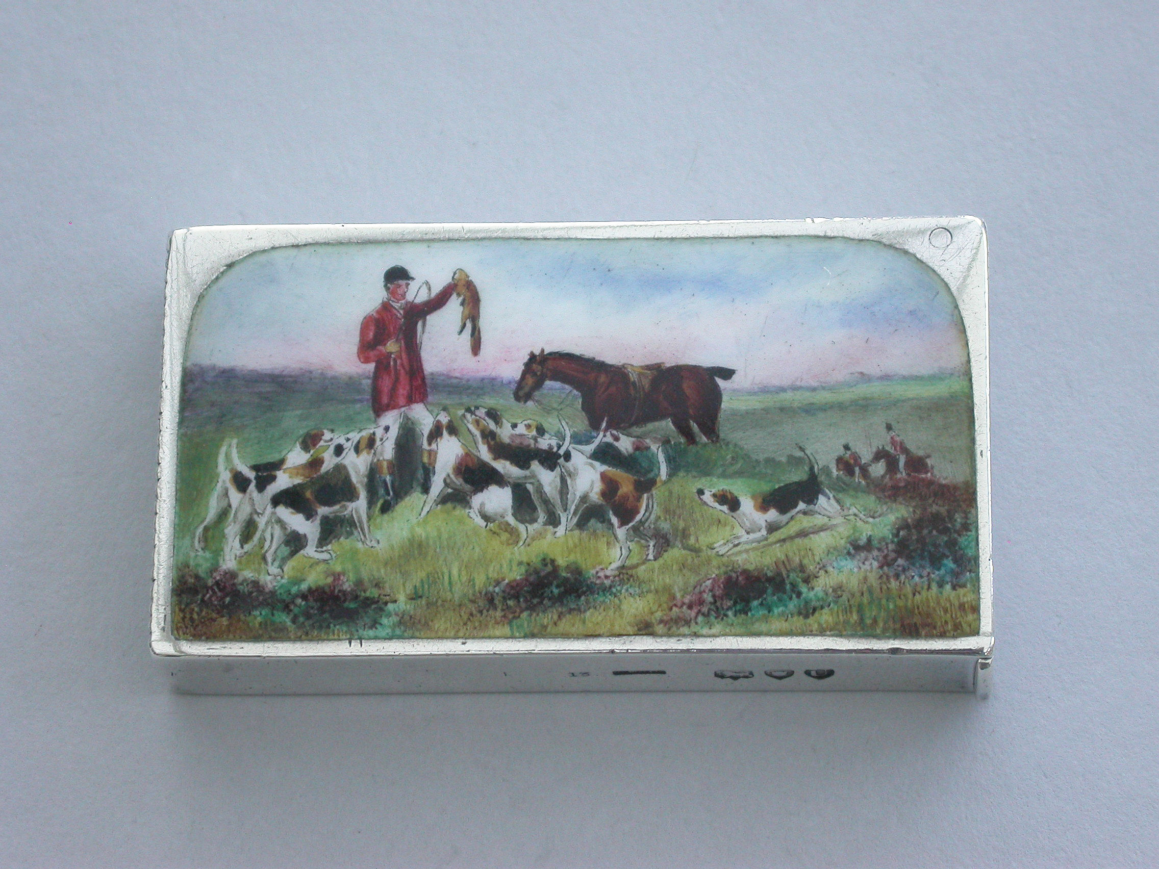 A fine and rare Victorian silver and enamel Vesta Case of flat-top rectangular form, the face enamelled with a scene of a fox hunter and his hounds at ""The Kill"".