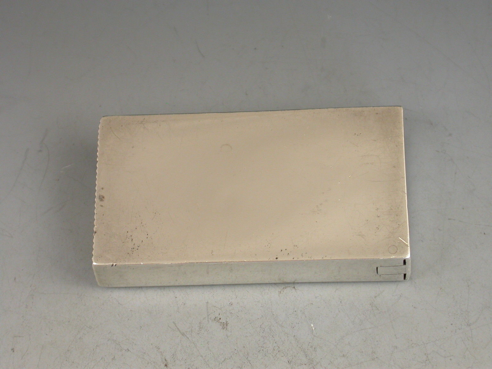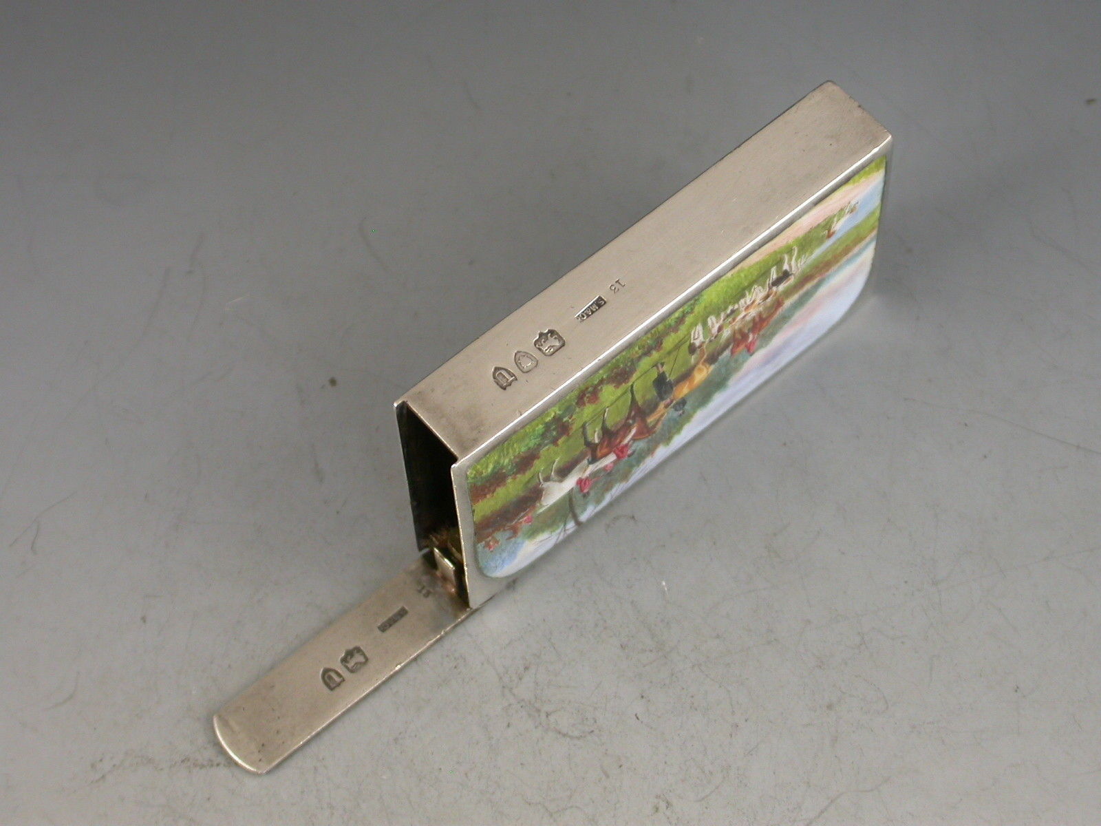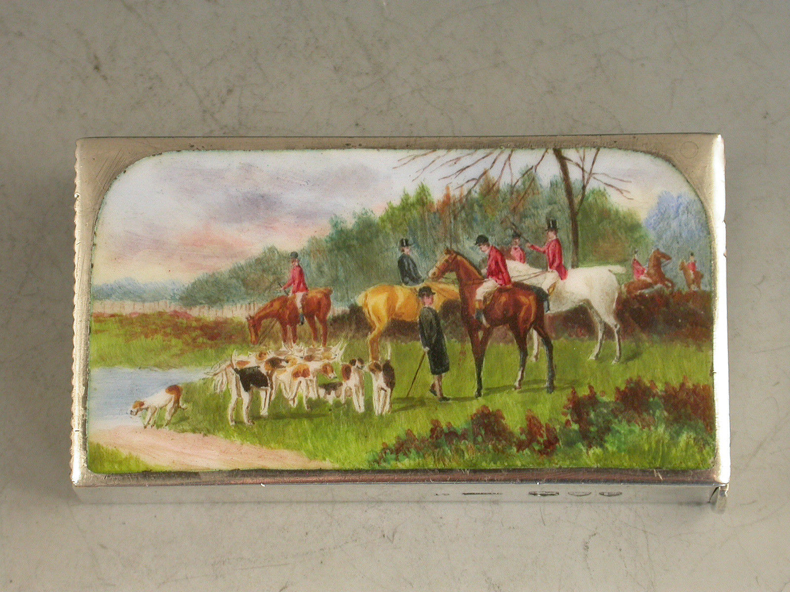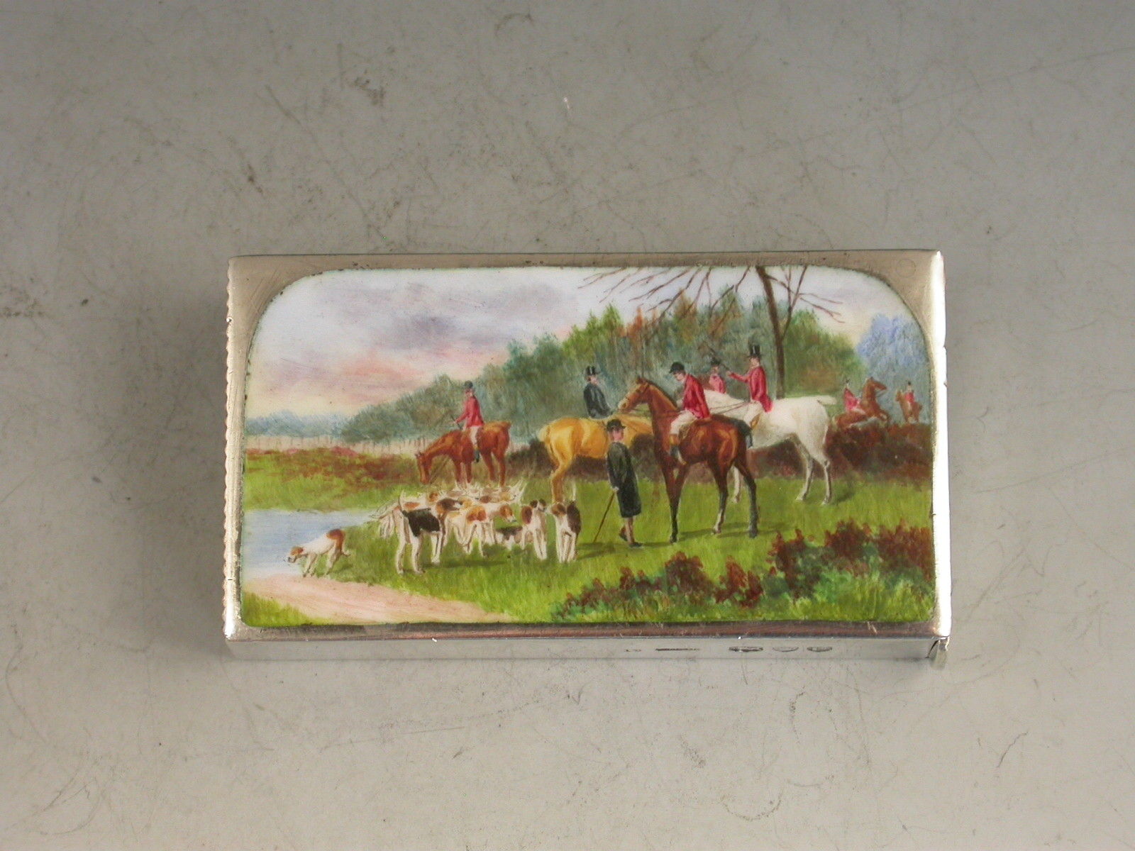 A very fine Victorian silver Vesta Case of plain rectangular form with flip-top sprung hinged lid, the face finely enamelled with a hunting scene. Striker to base.