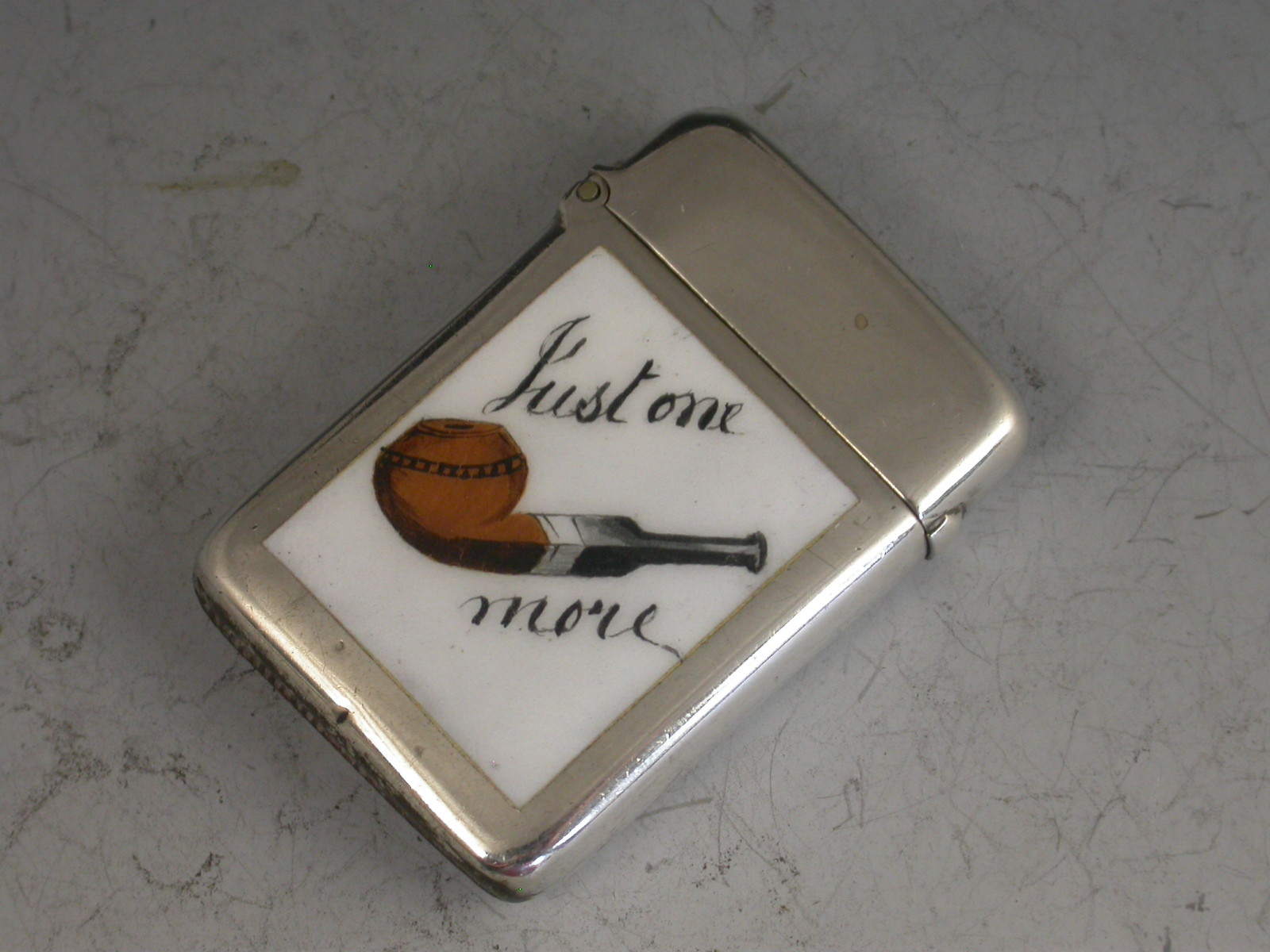 A good Victorian silver and enamel Vesta Case of rounded rectangualr form with hinged flip-top lid, the face inset with an enamel panel depicting a pipe and the text ""Just One More"".