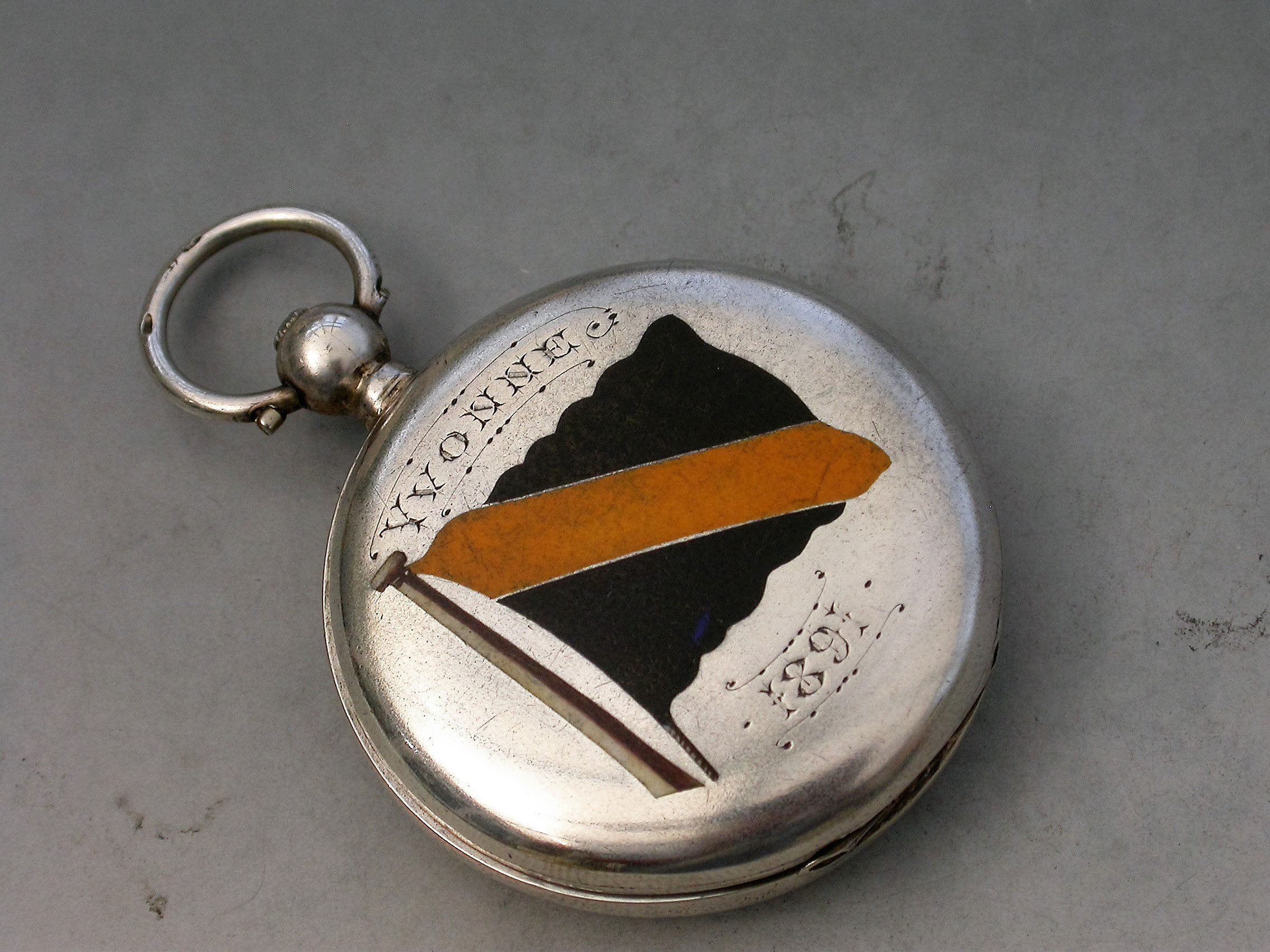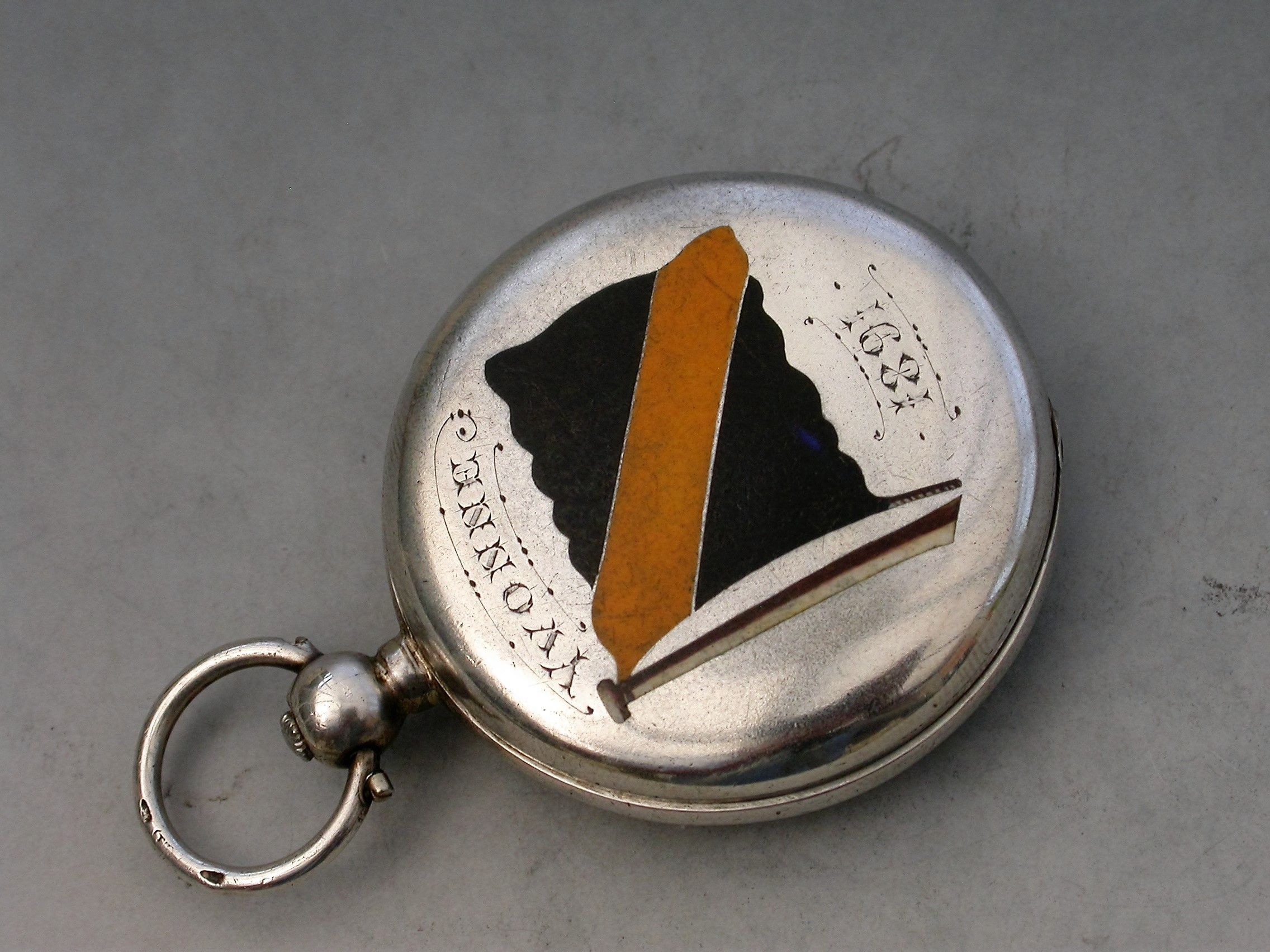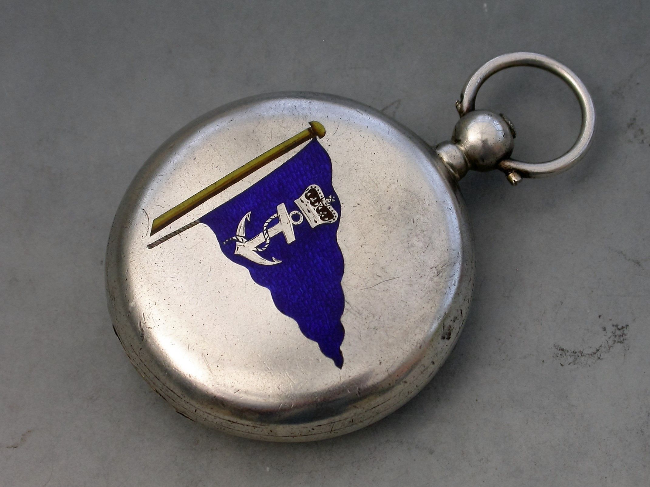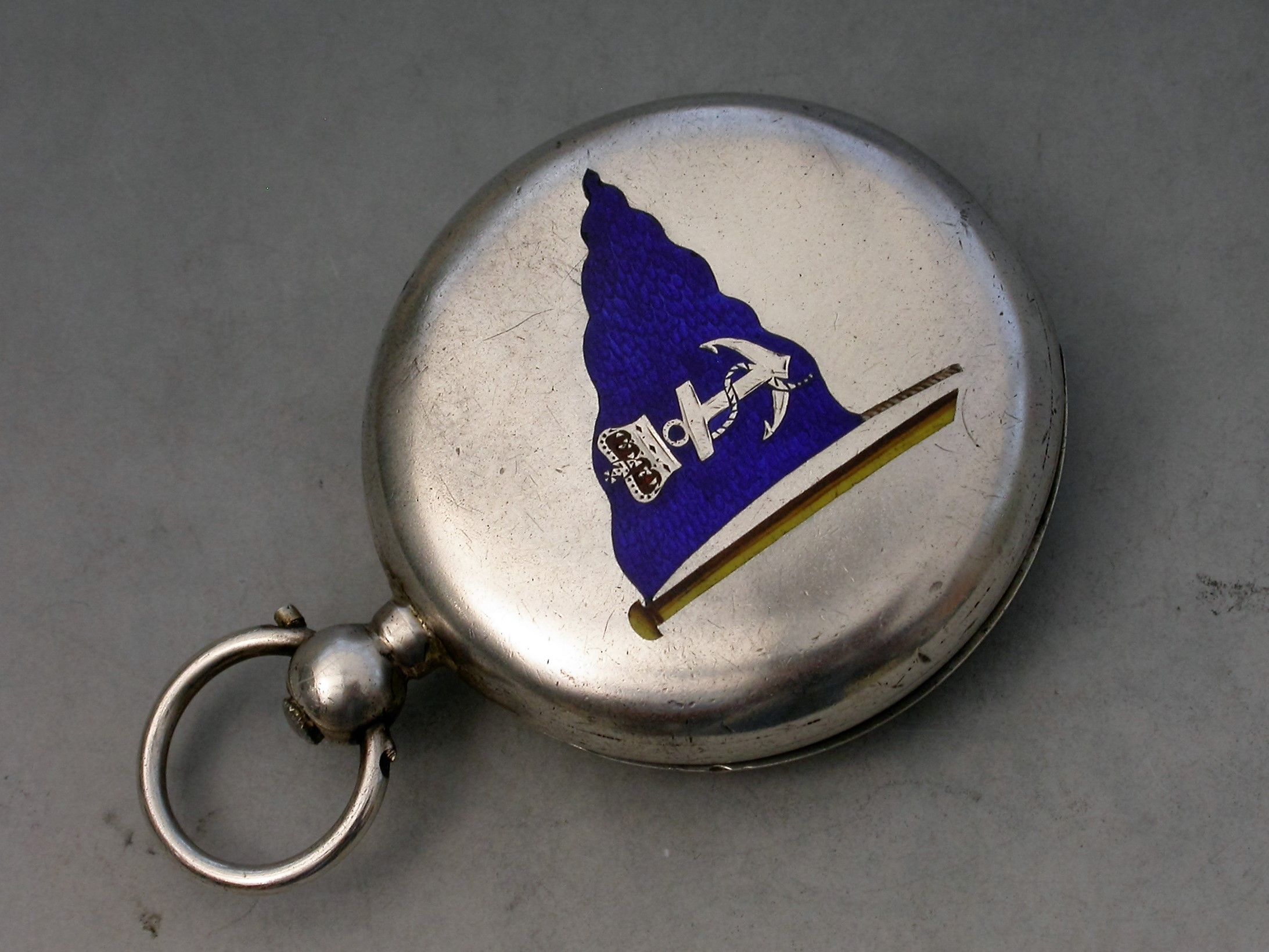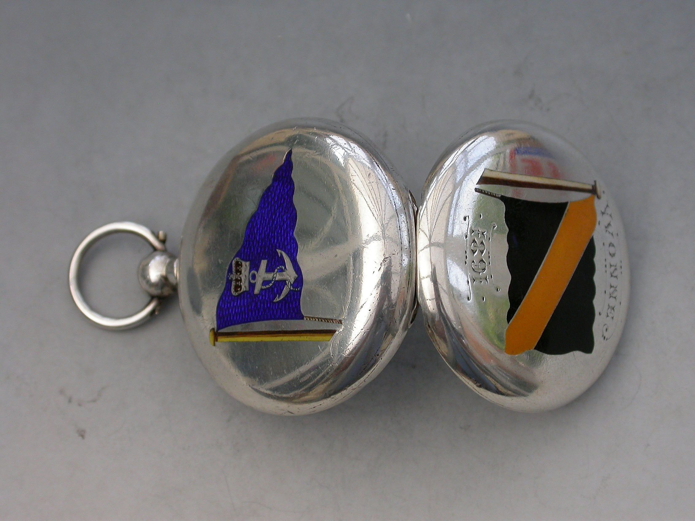 A Victorian silver and enamel Pocket Compass, the cover with a black and yellow enamel flag on a mast, engraved Yvonne 1891. The back with a blue enamel burgee decorated with a foulded anchor and a Royal coronet, the spring cover opening to reveal a compass.