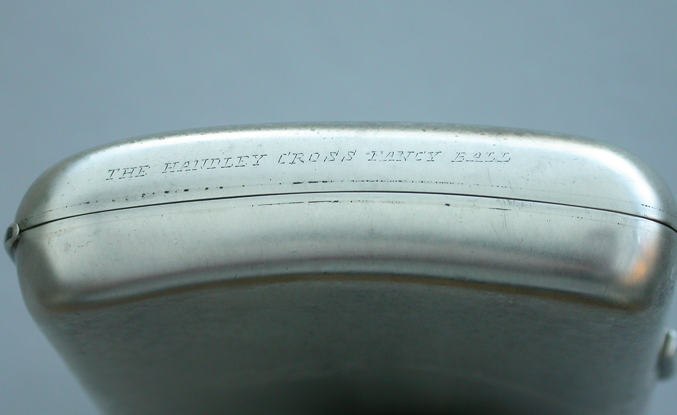 An extremely rare Victorian silver and enamel Cigarette Case of curved rounded rectangular form with push-button sprung opening mechanism. The cover enamelled with a depiction of Mr Jorrock's at the Handley Cross fancy ball (after the original John Leech illustration for Robert Surtees book - ""Handley Cross, or Mr Jorrock's Hunt""). The silver gilt interior with two sprung hinged retaining arms. The end of the case engraved - The Handley Cross Fancy Ball.
