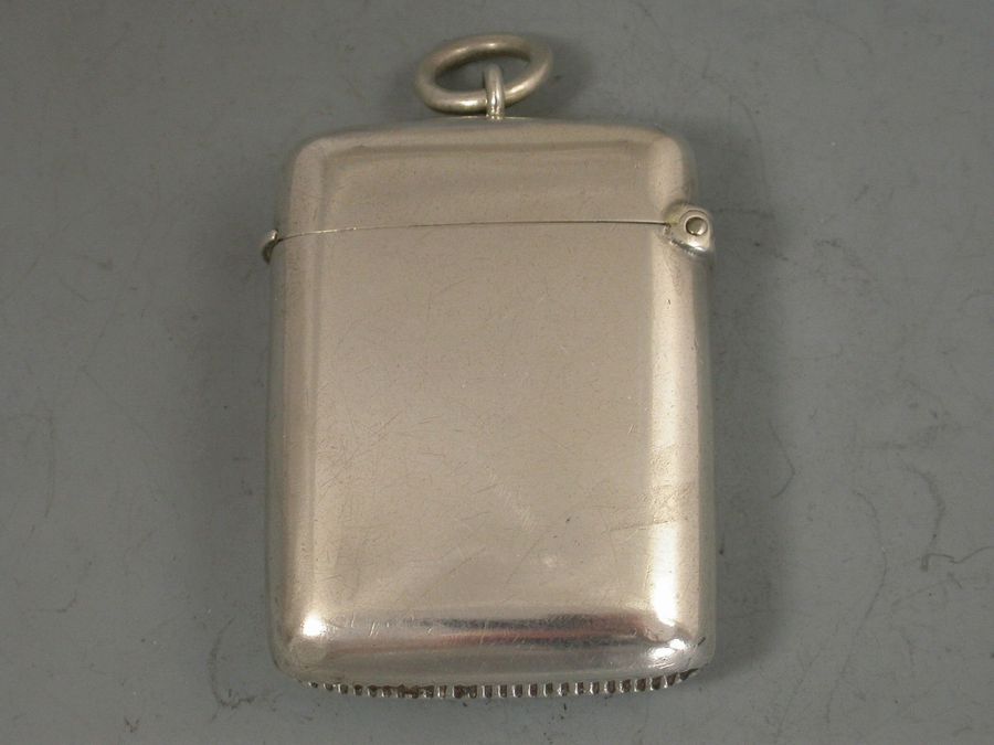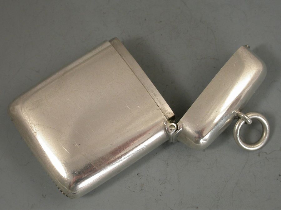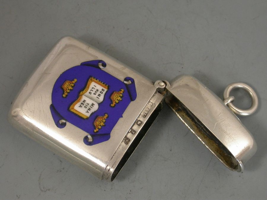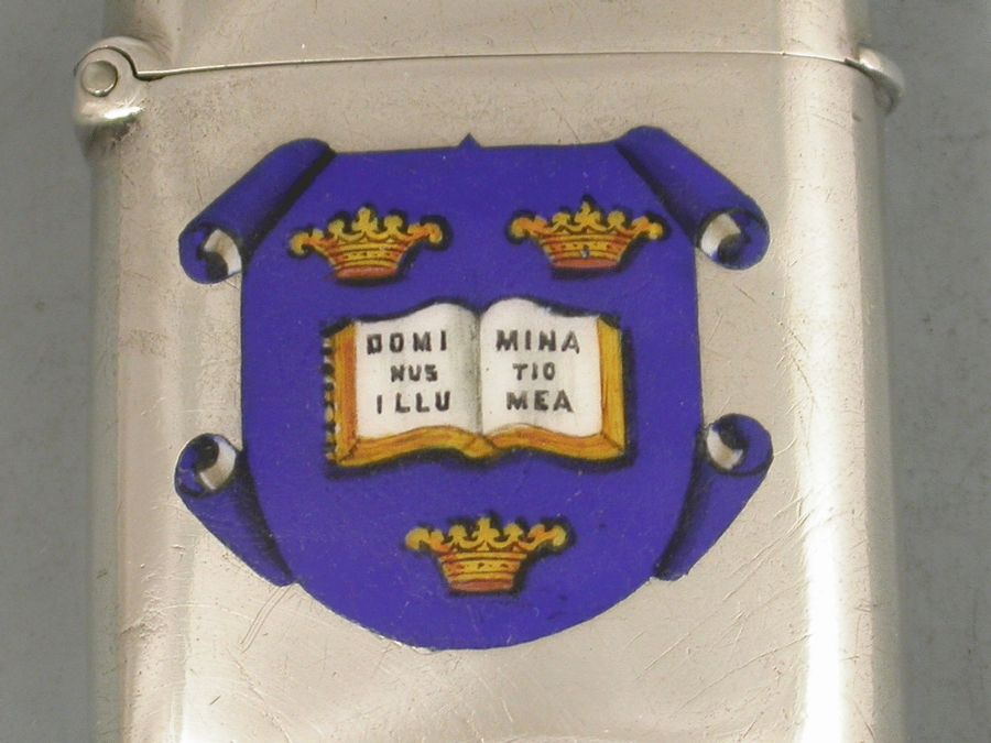 A fine Victorian silver Vesta Case of rounded rectangular form with attached suspension ring and hinged flip-top lid, the face enamelled with the Coat of Arms of Oxford University.