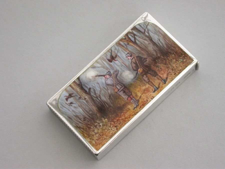 An extremely rare Victorian silver and enamel Vesta Case of flat-top rectangular form with sprung hinged lid, the face enamelled with two gentleman pheasant shooting in a woodland scene.