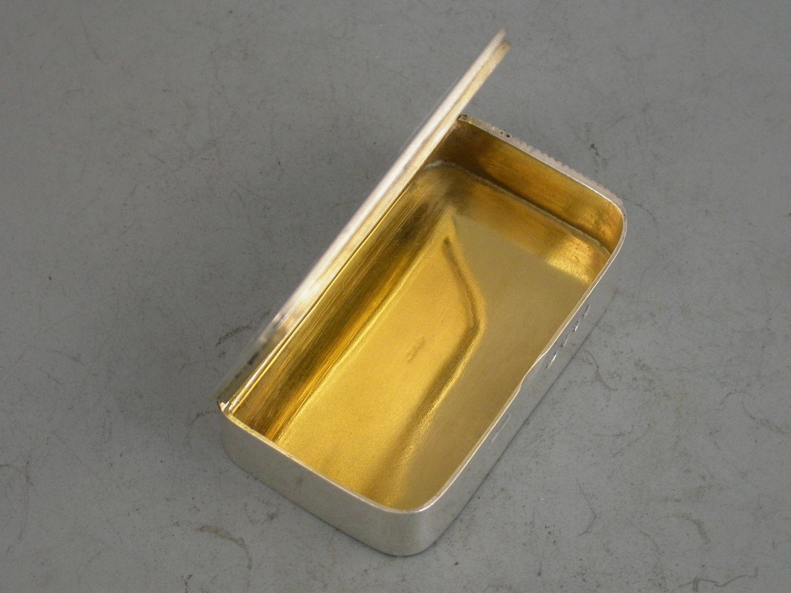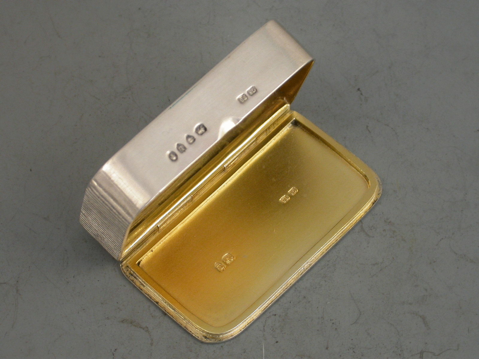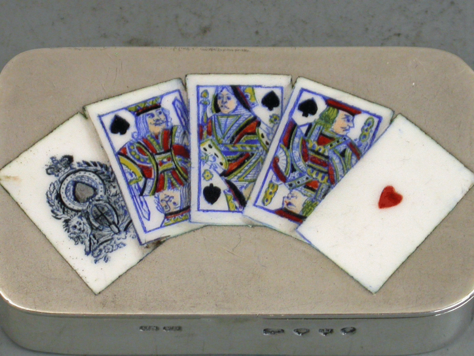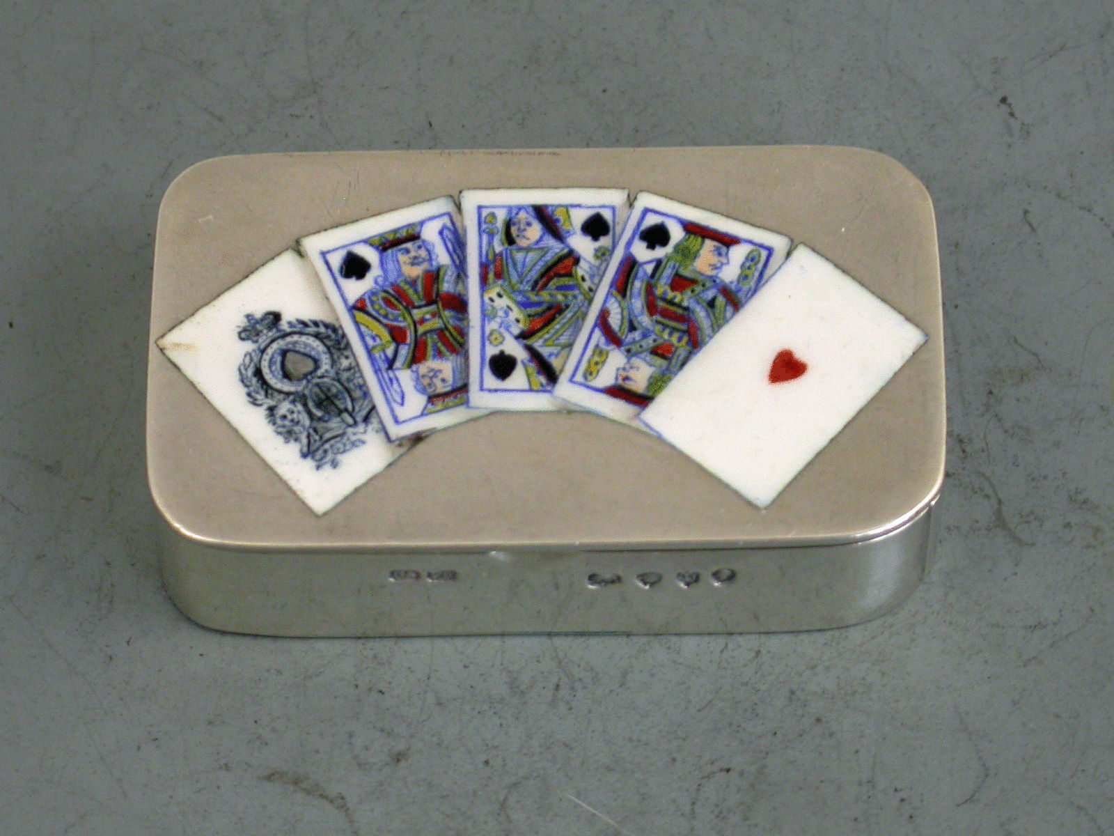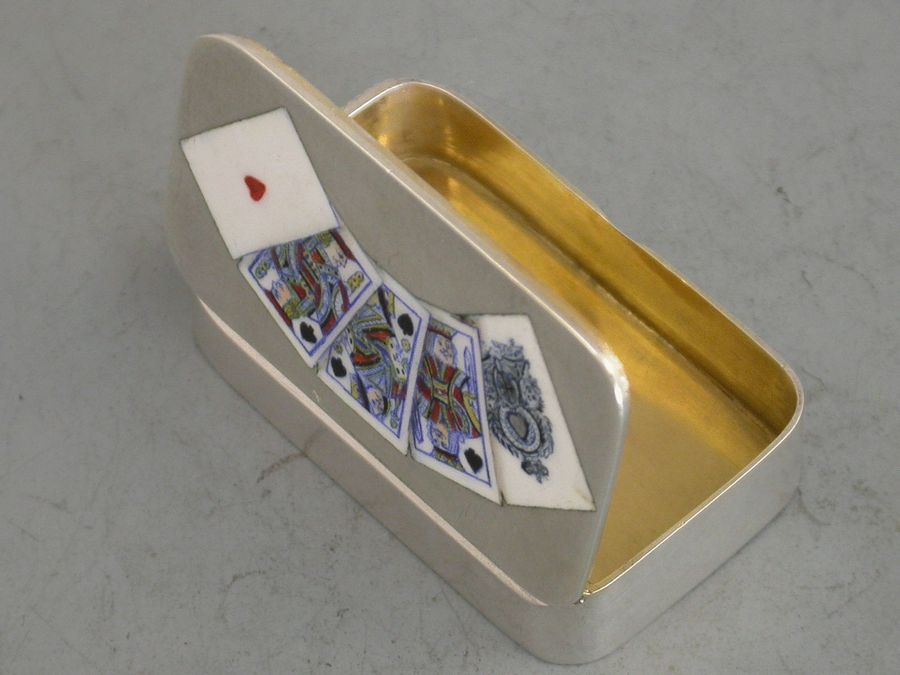 A fine quality Victorian silver Vesta Case of rounded rectangular form, the striker to one end, the lid enamelled with five playing cards: the Ace, King, Queen and Jack of Spades and the Ace of Hearts. The hinged cover opening to reveal the silver gilt interior.