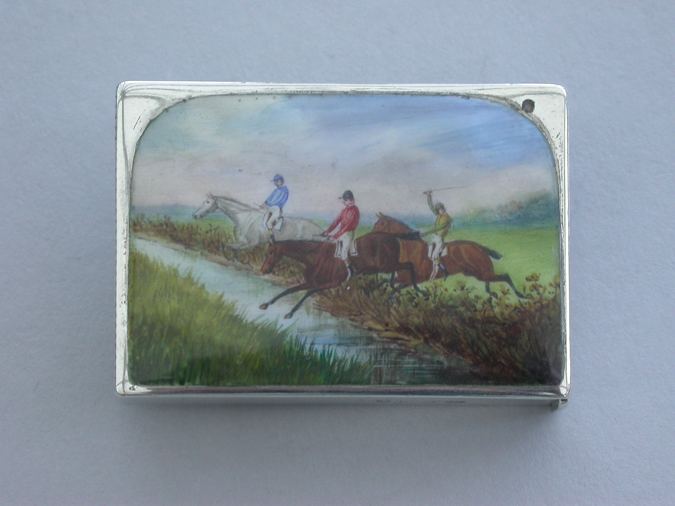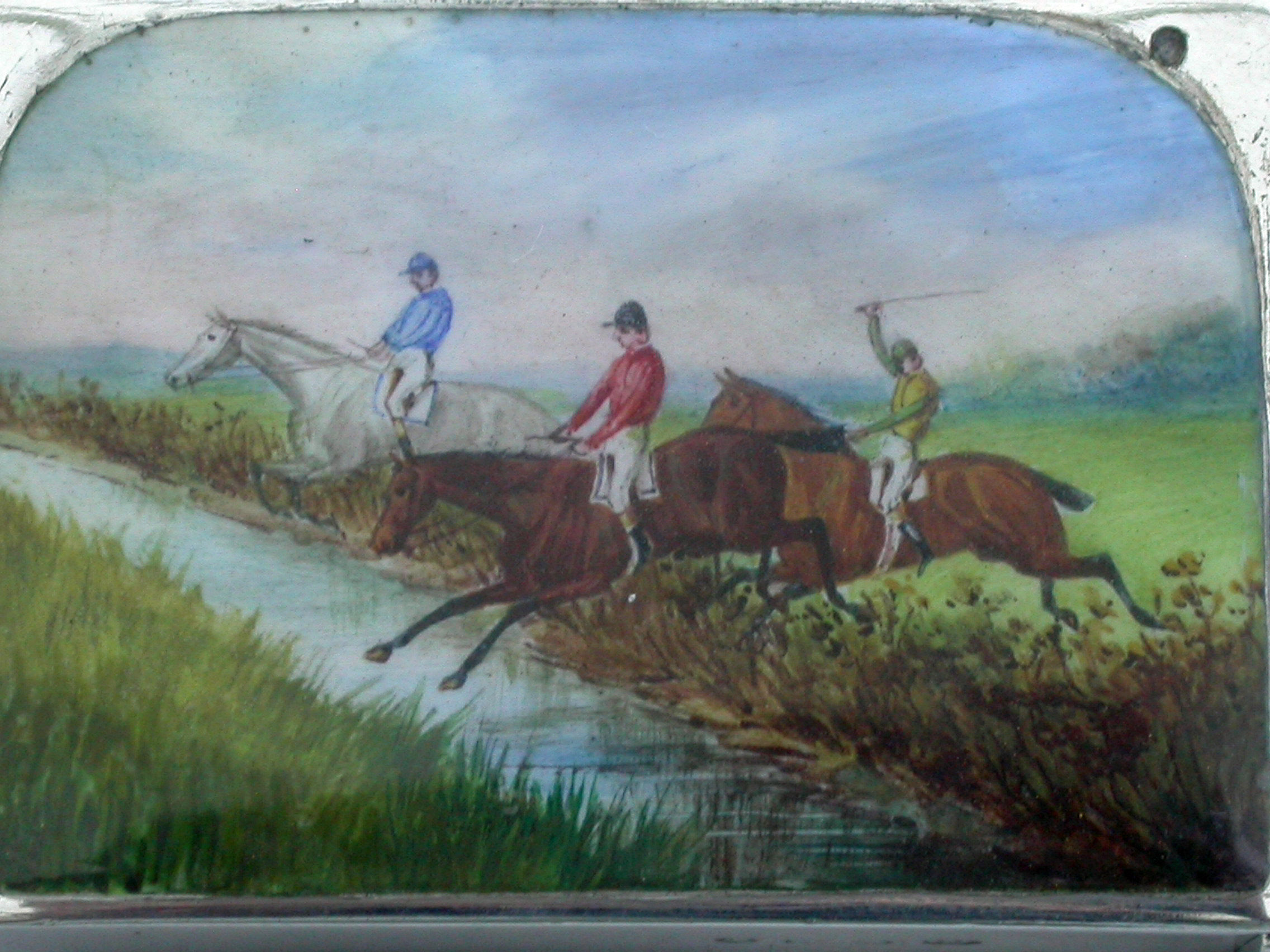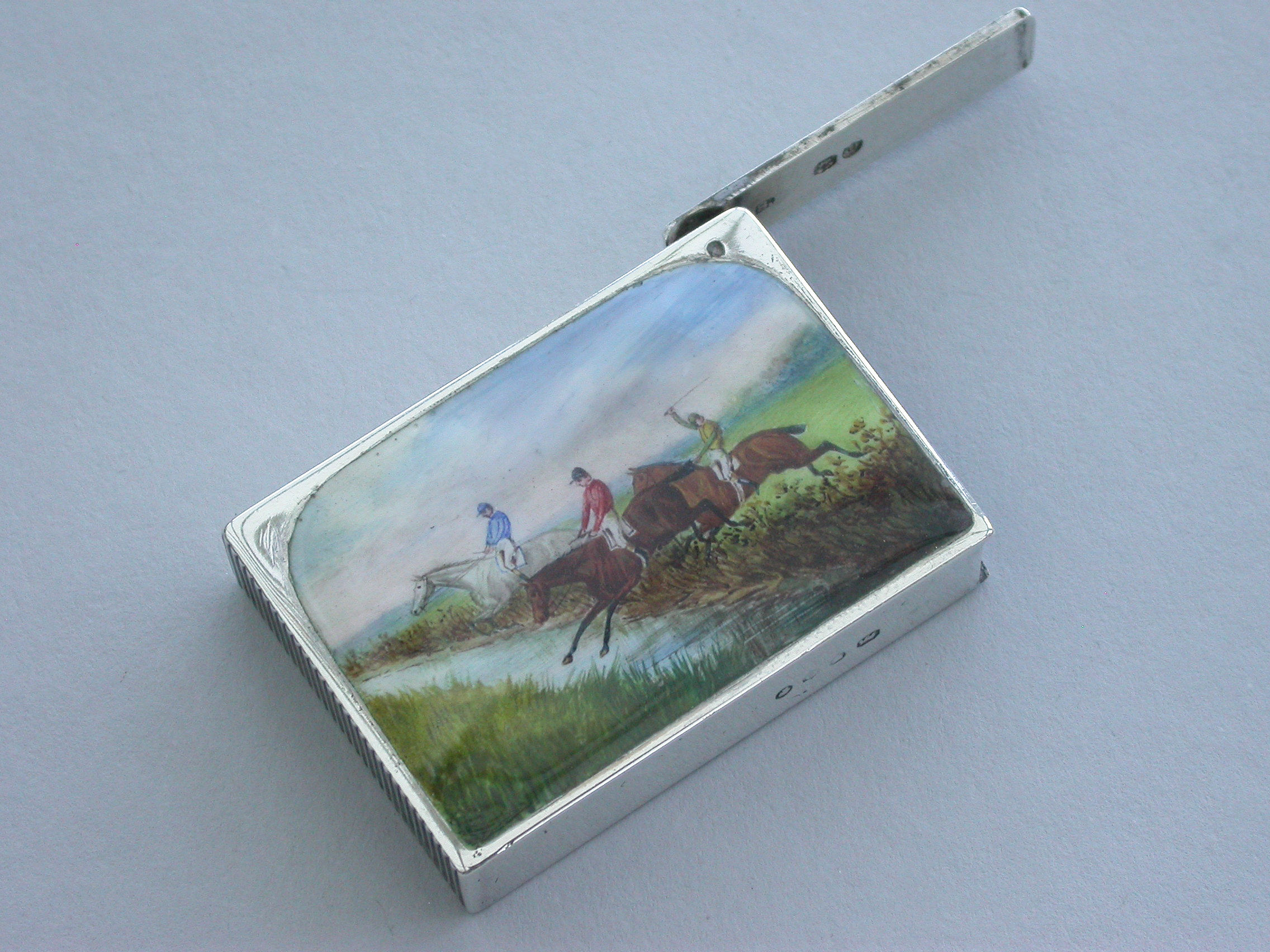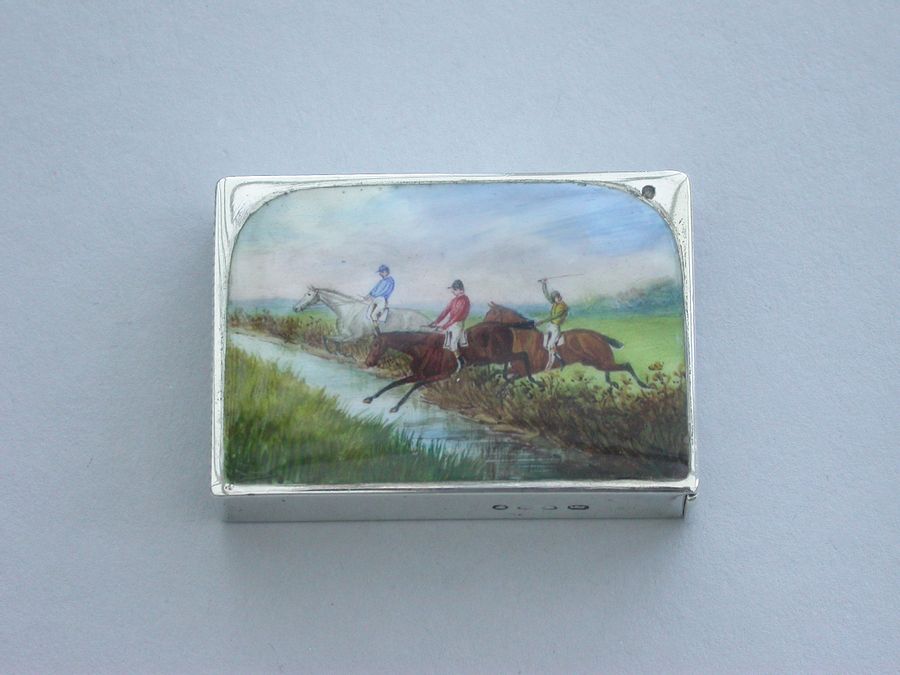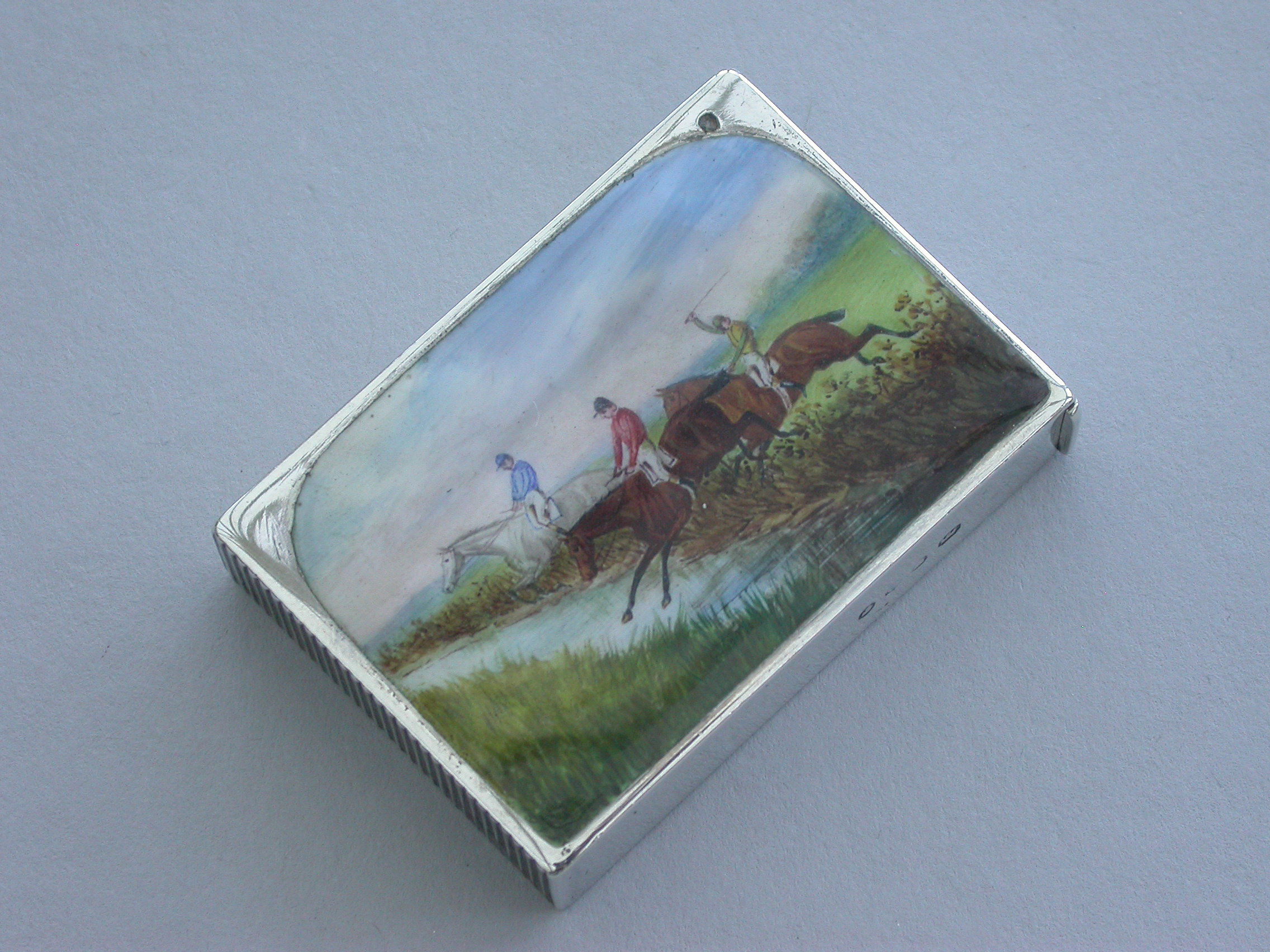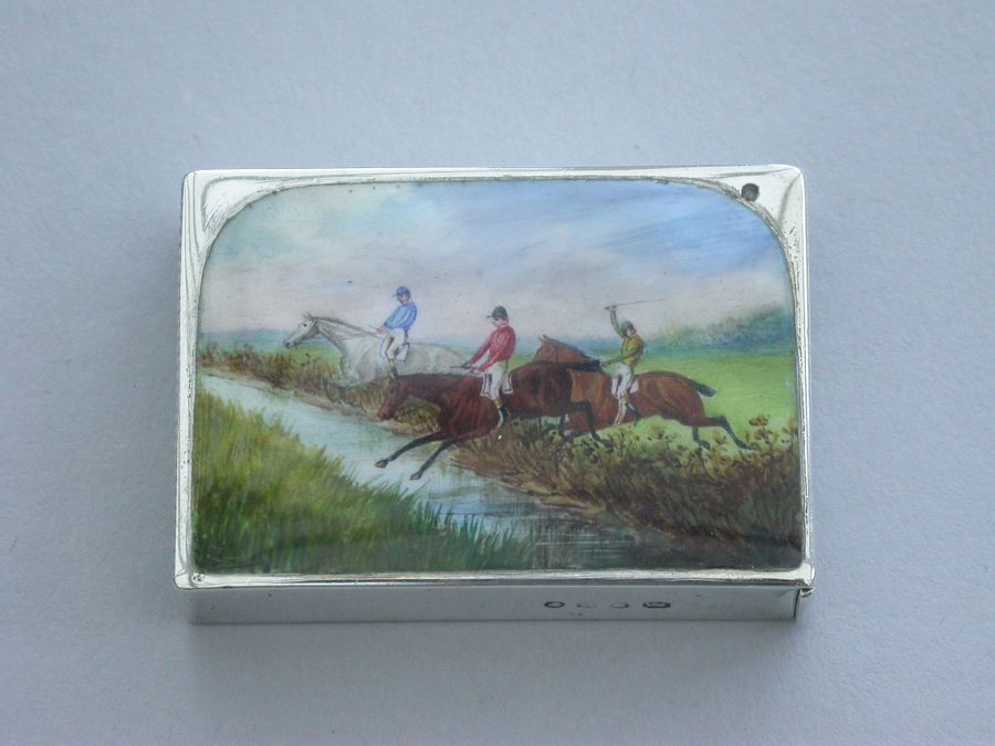 A fine and rare Victorian silver and enamel Vesta Case of rectangular flat-top form, the face enamelled with a ""Point-to-Point"" racing scene depicting three horses taking a water jump.