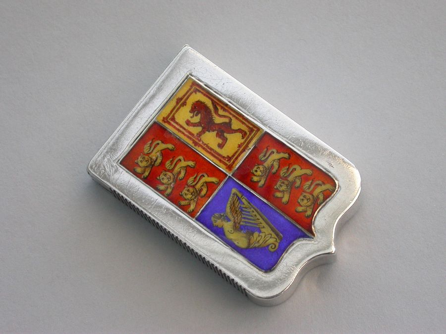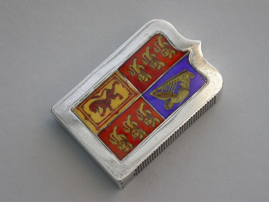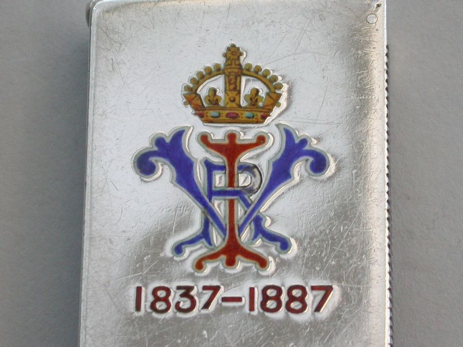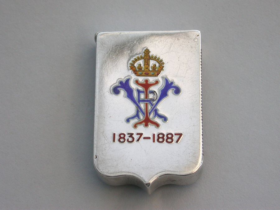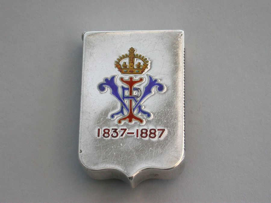 A fine quality and rare Victorian silver and enamel Vesta Case, of shield shape with sprung flat-top hinged lid, made to commemorate the Golden Jubilee of queen Victoria, the face enamelled with the Royal Standard flag and the reverse with queens Victoria's cypher and Royal Crown above the dates 1837 - 1887.