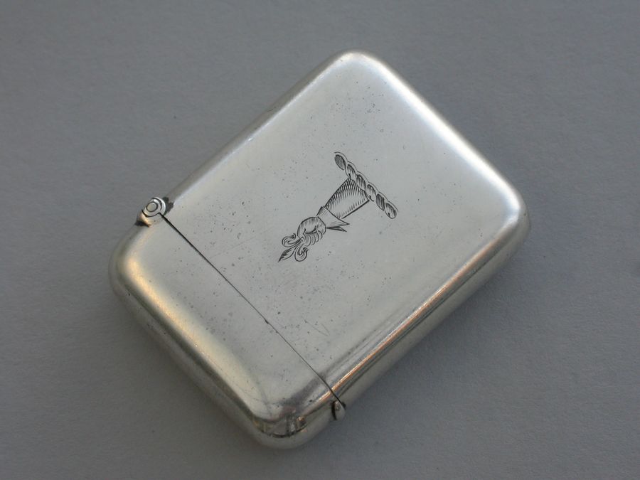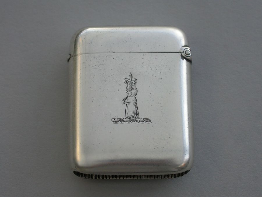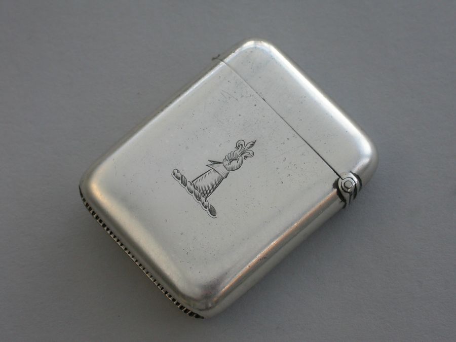 A rare late Victorian silver and enamel Vesta Case of rounded rectangular form with sprung hinged lid. The face with inset enamel panel depicting The Royal Standard Flag. The reverse engraved with a contemporary crest.