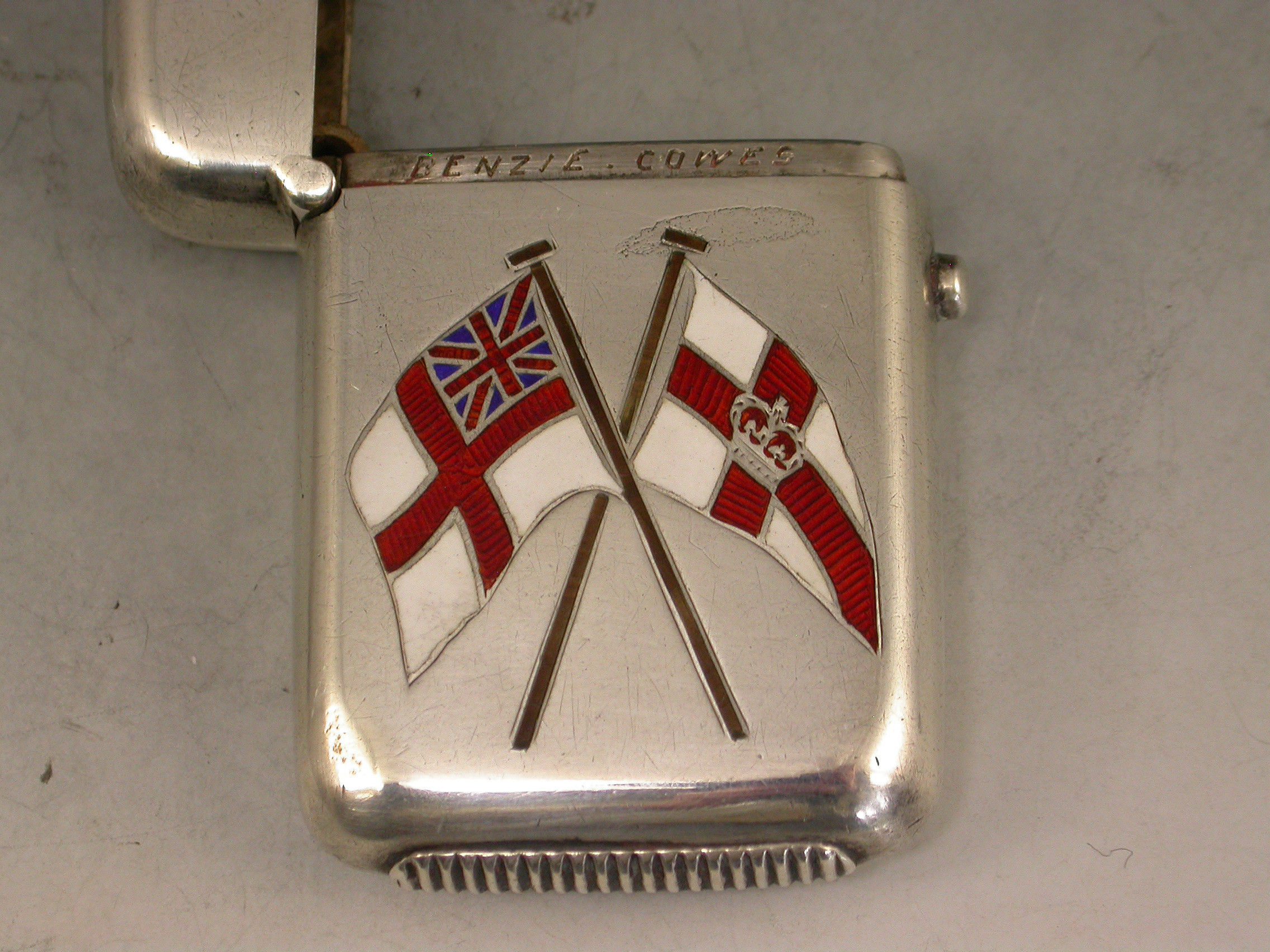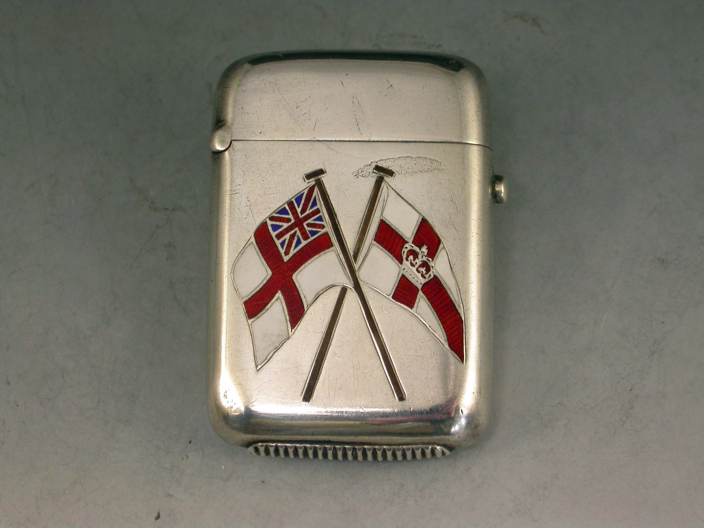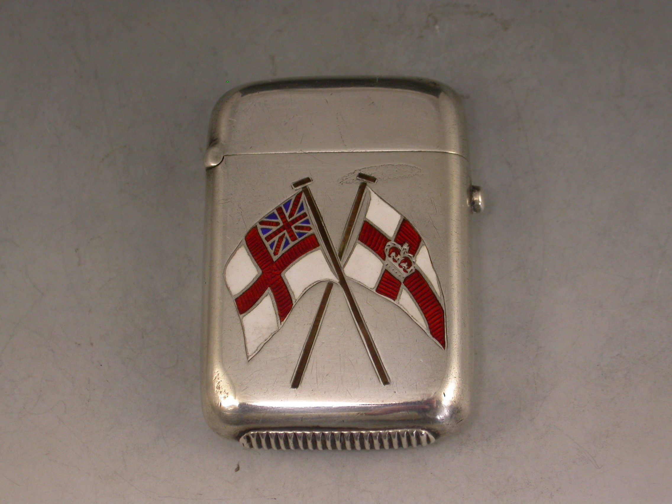 A rare Victorian silver and enamel Vesta Case of rounded rectangular form with push button sprung opening mechanism, the face enamelled with the White Ensign and the Burgee of the Royal Yacht Squadron.