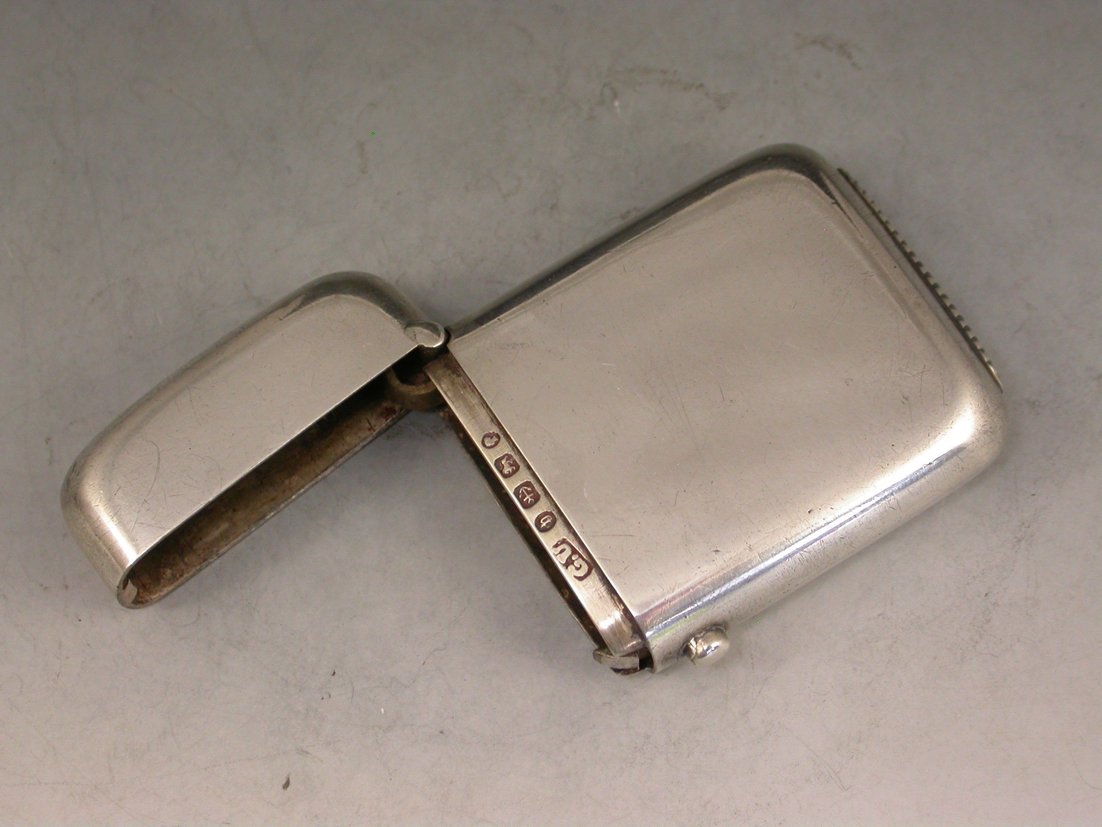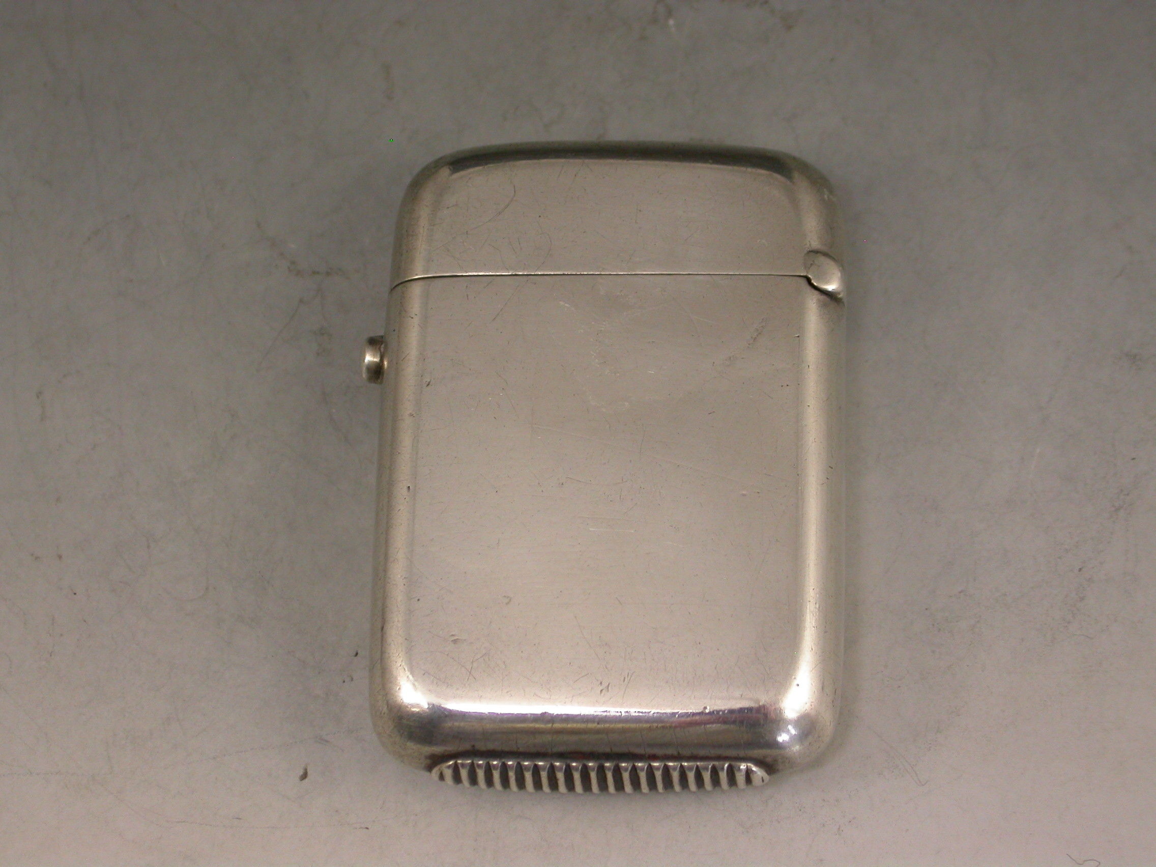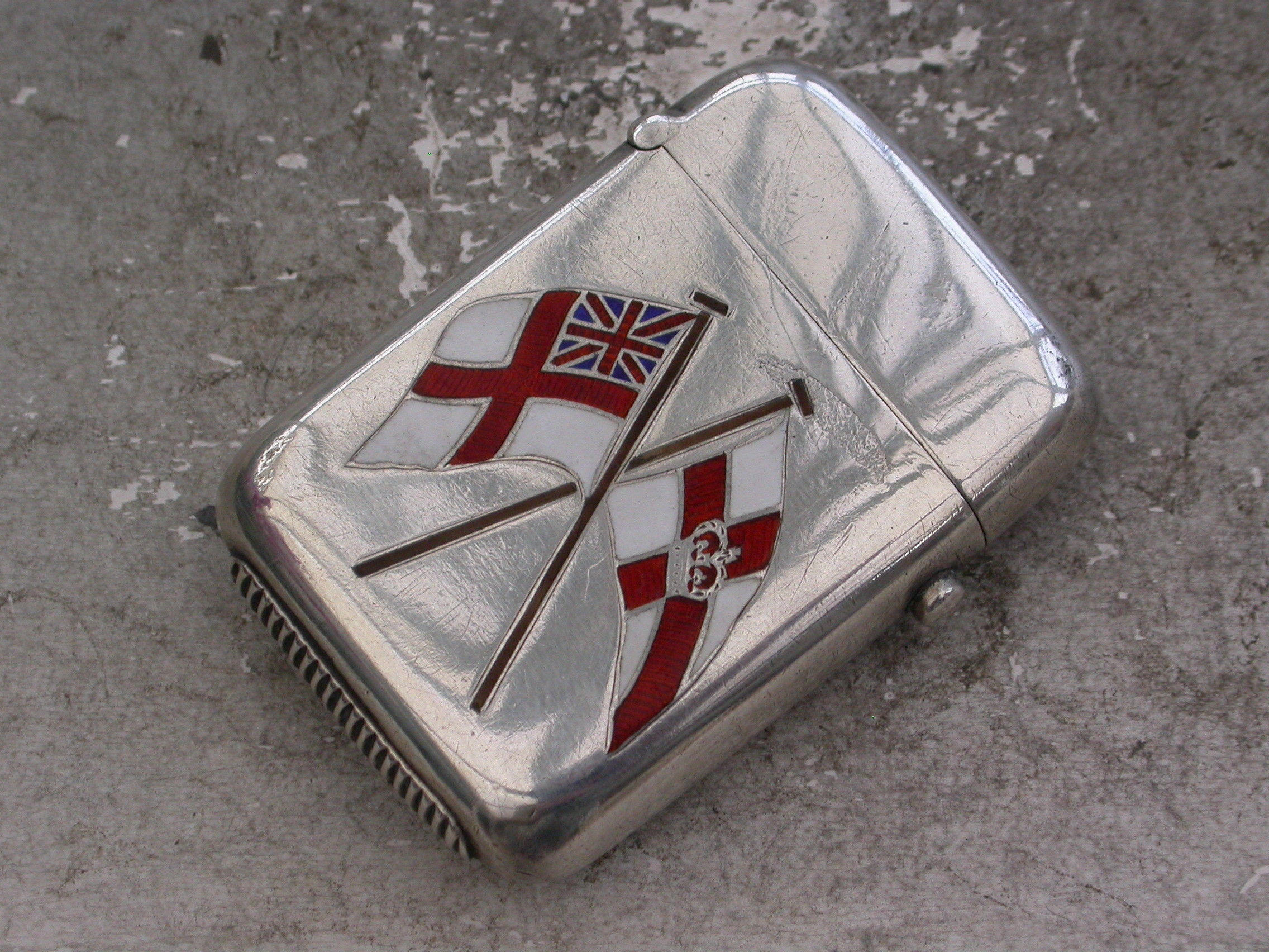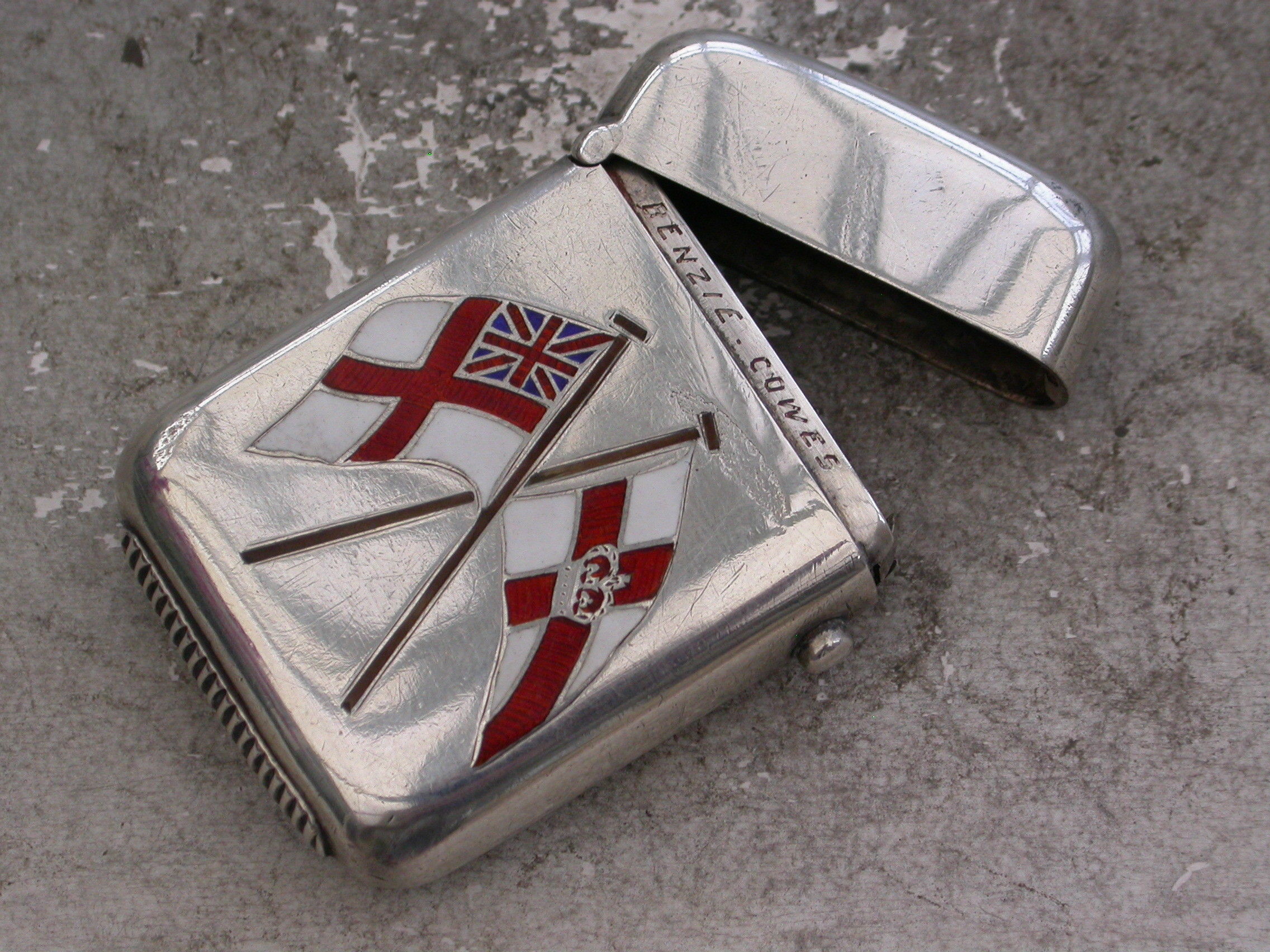 A rare Victorian silver and enamel Vesta Case of rounded rectangular form with push button sprung opening mechanism, the face enamelled with the White Ensign and the Burgee of the Royal Yacht Squadron.
