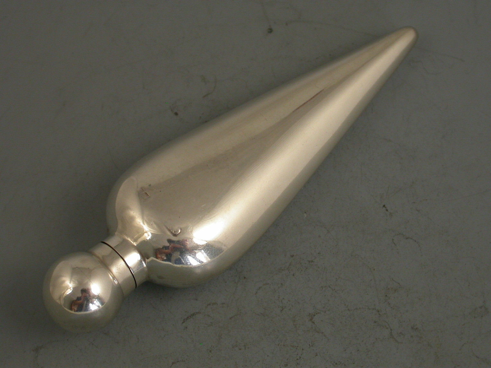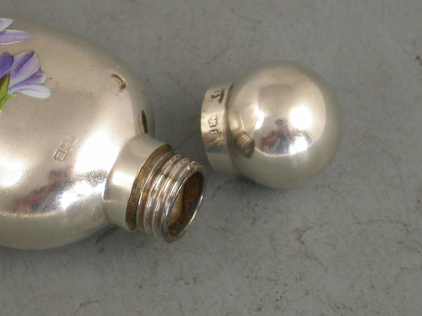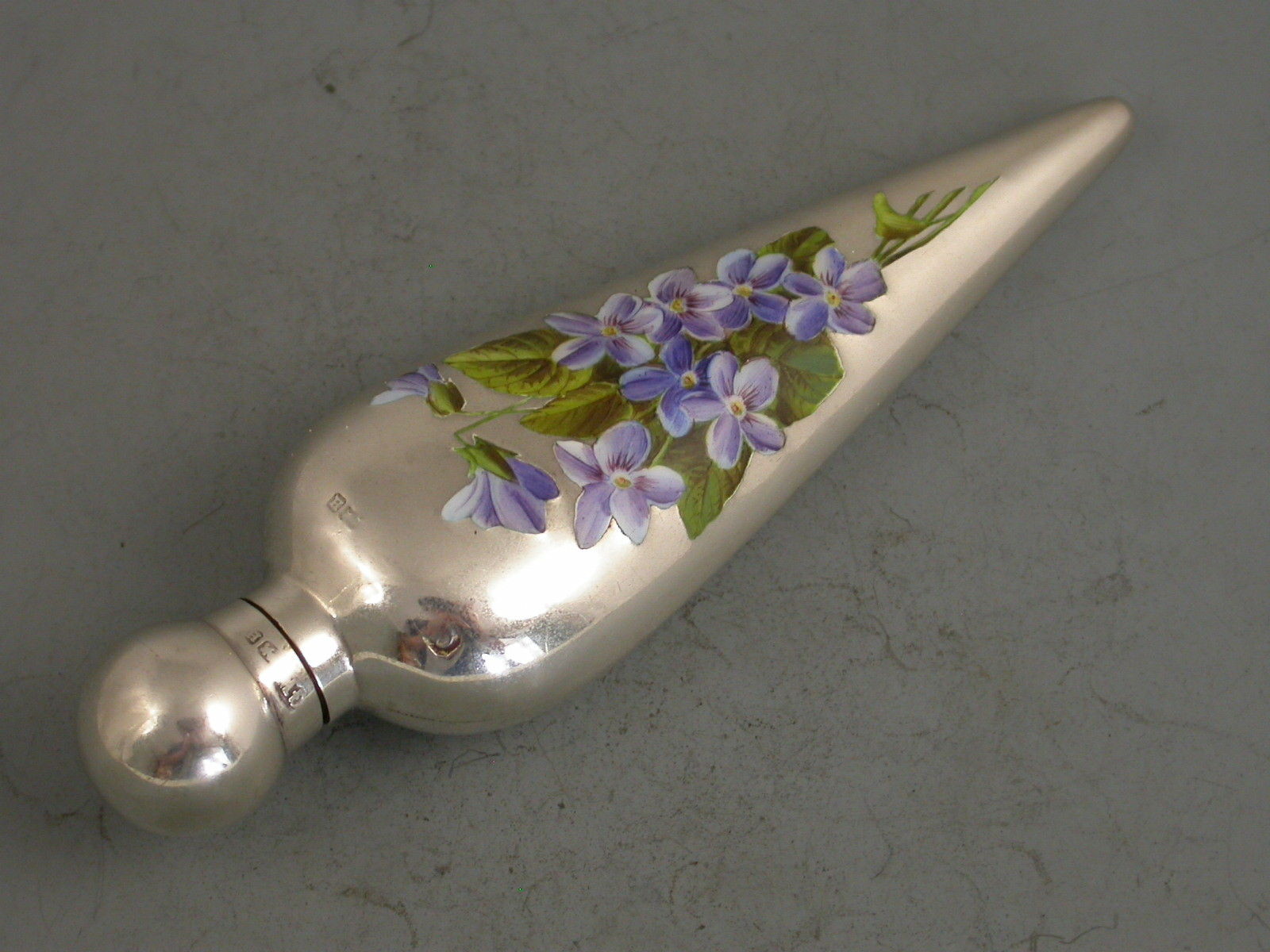 A fine Victorian silver and Enamel Scent Flask of conical form with bulbous screw off silver lid, the body with enamelled decoration depicting violets.