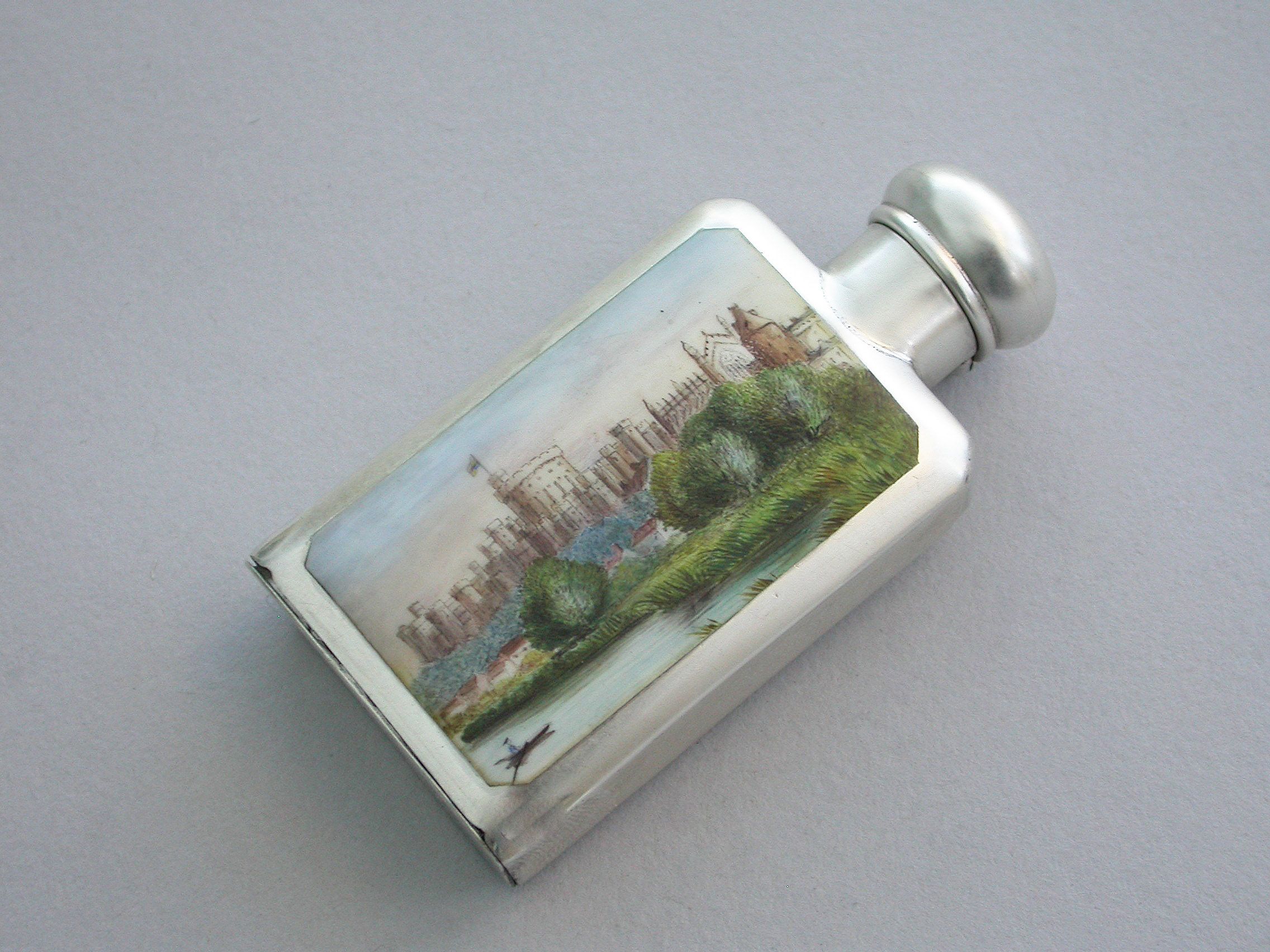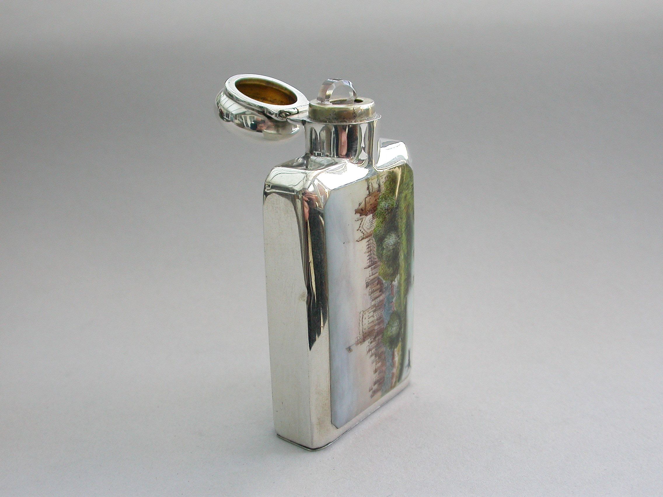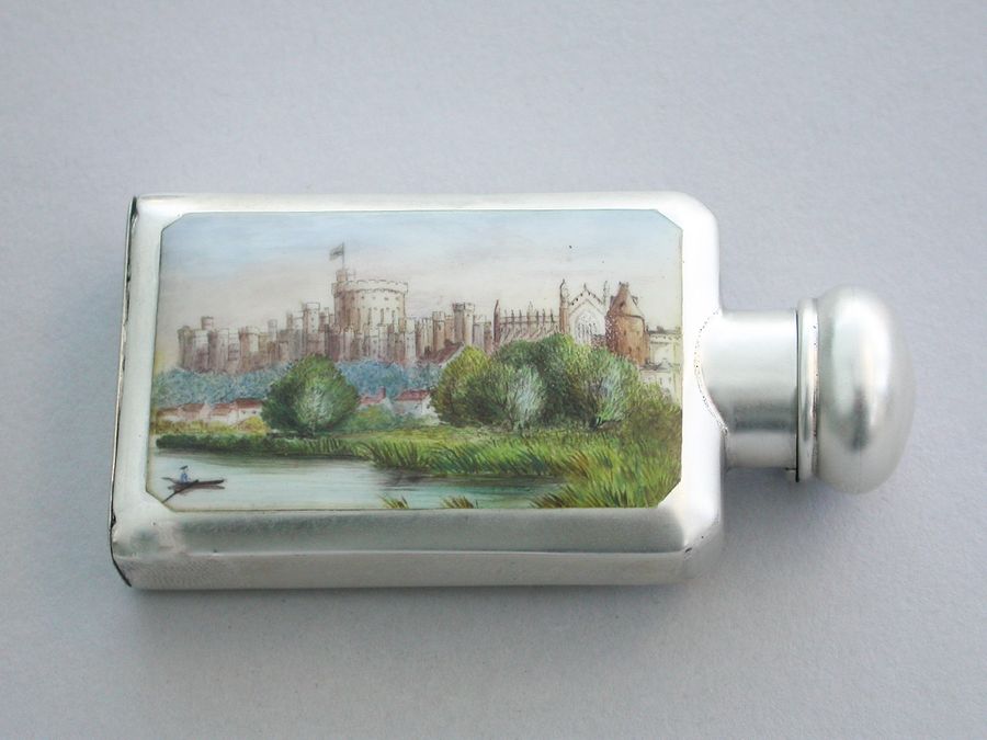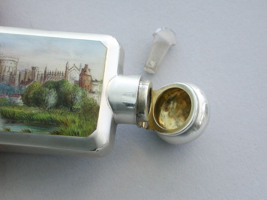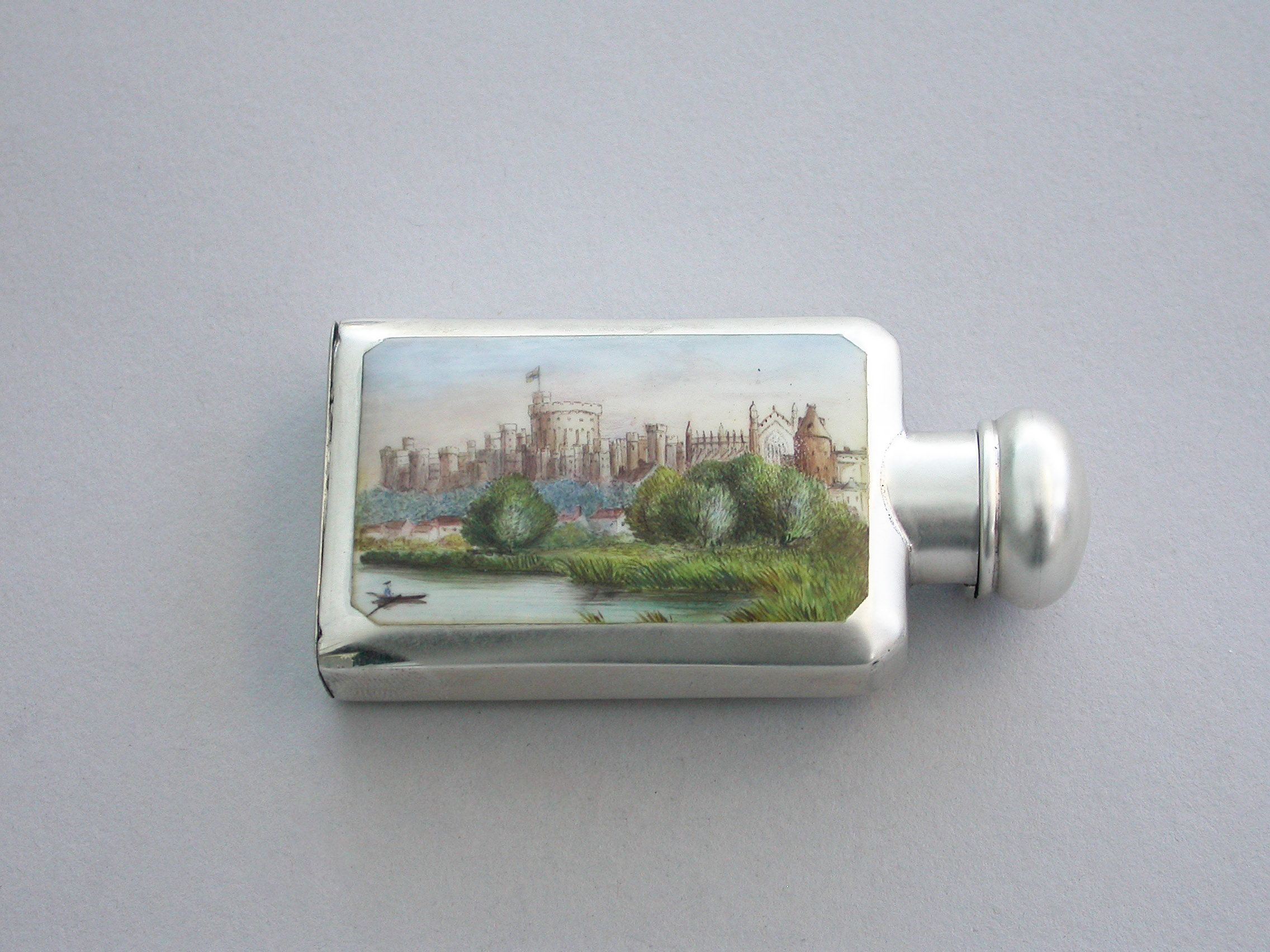 A fine late Victorian glass lined silver Scent Bottle of shaped rectangular form with beveled edges and hinged circular domed cover, silver gilt interior with glass stopper. The face enamelled with a panel depicting Windsor Castle from across the River Thames.