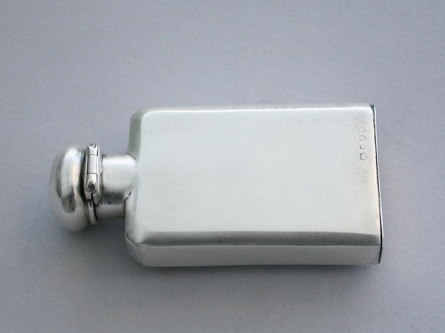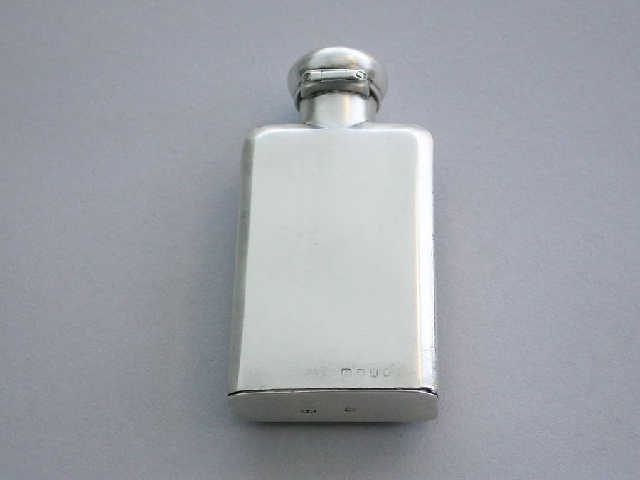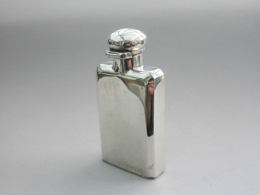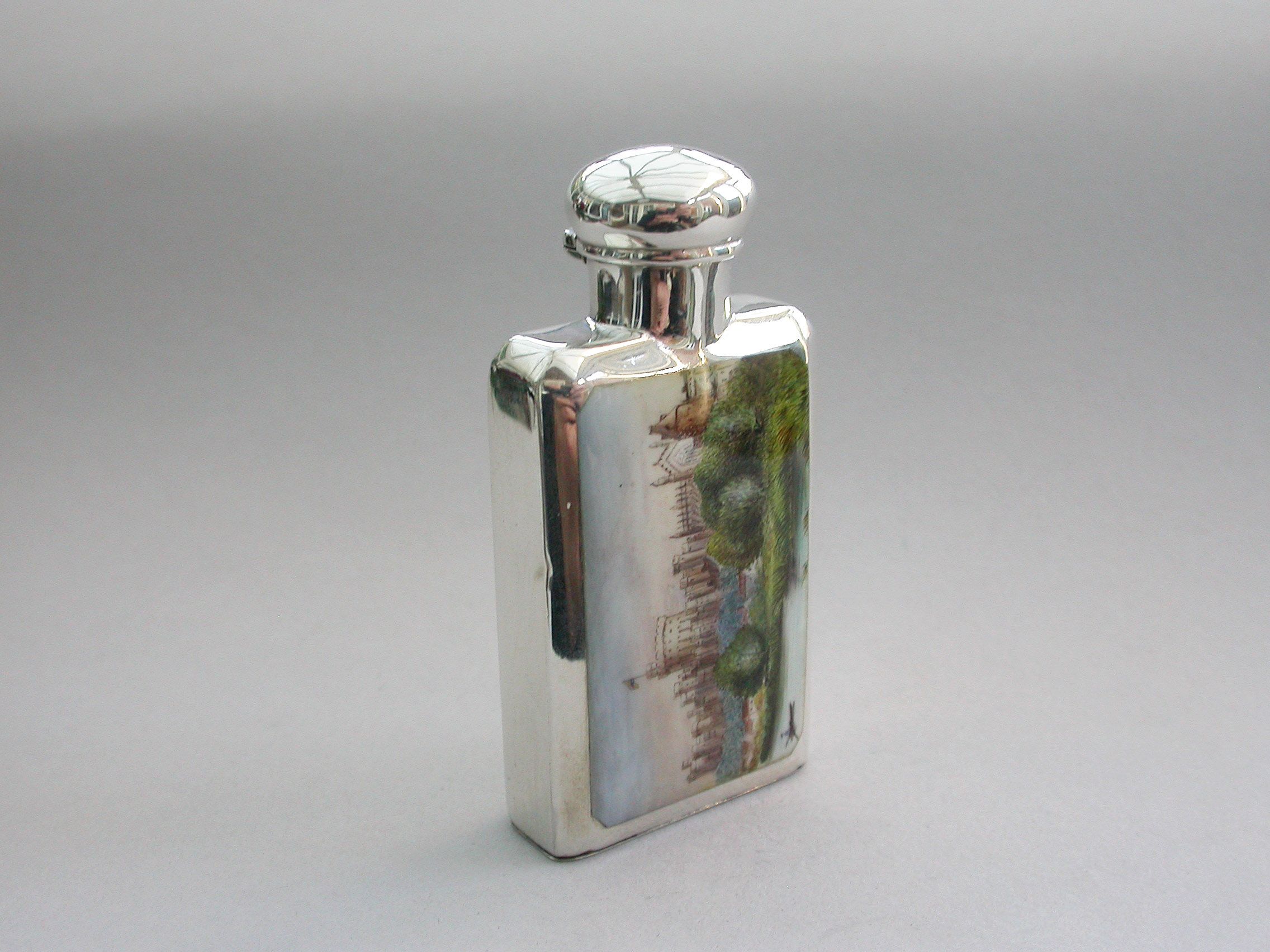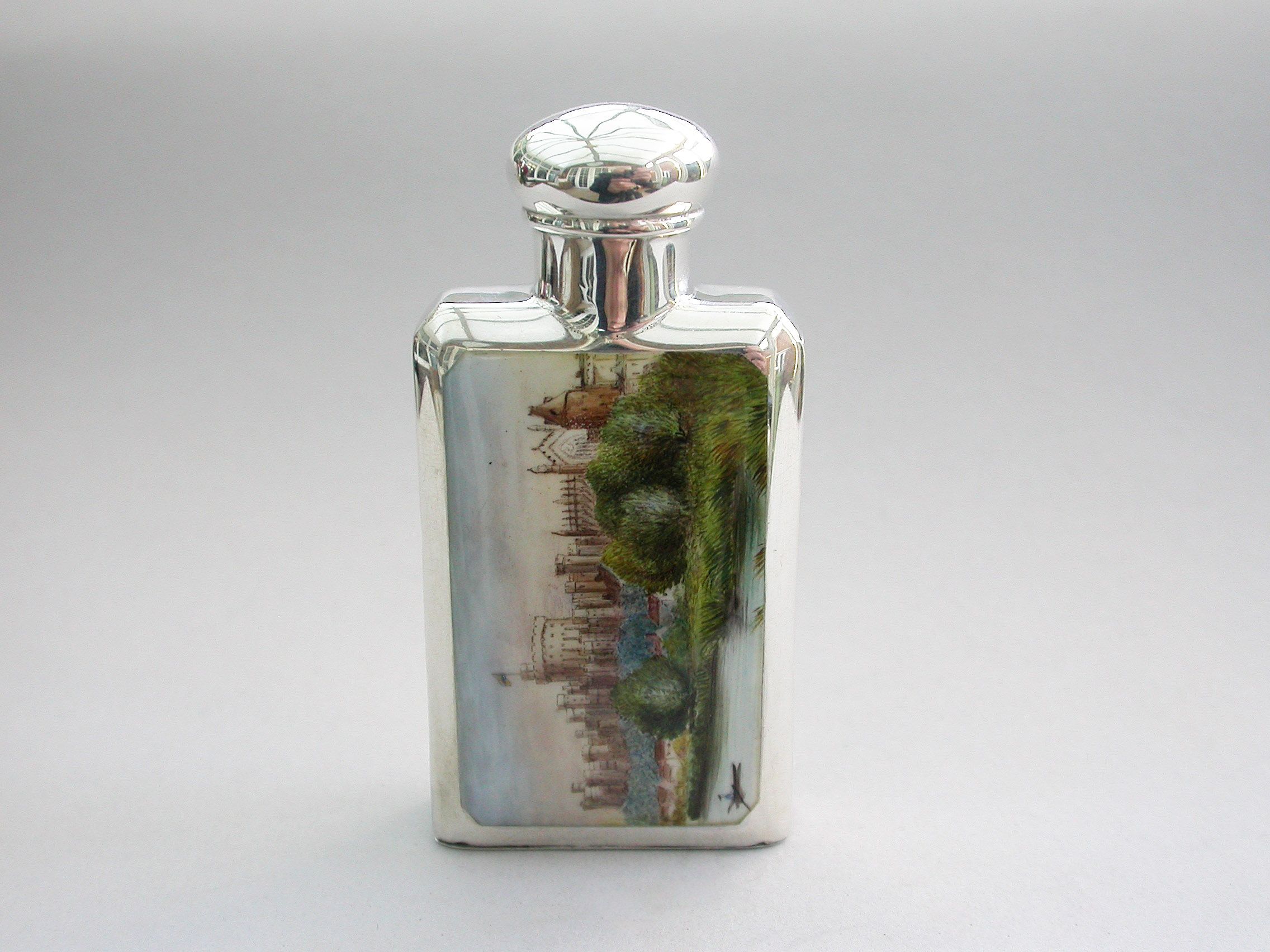A fine late Victorian glass lined silver Scent Bottle of shaped rectangular form with beveled edges and hinged circular domed cover, silver gilt interior with glass stopper. The face enamelled with a panel depicting Windsor Castle from across the River Thames.