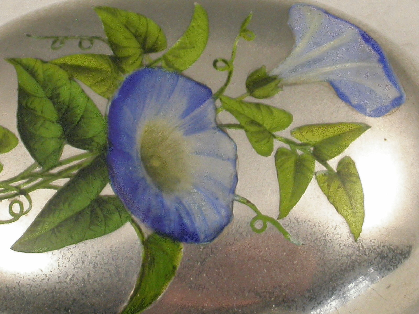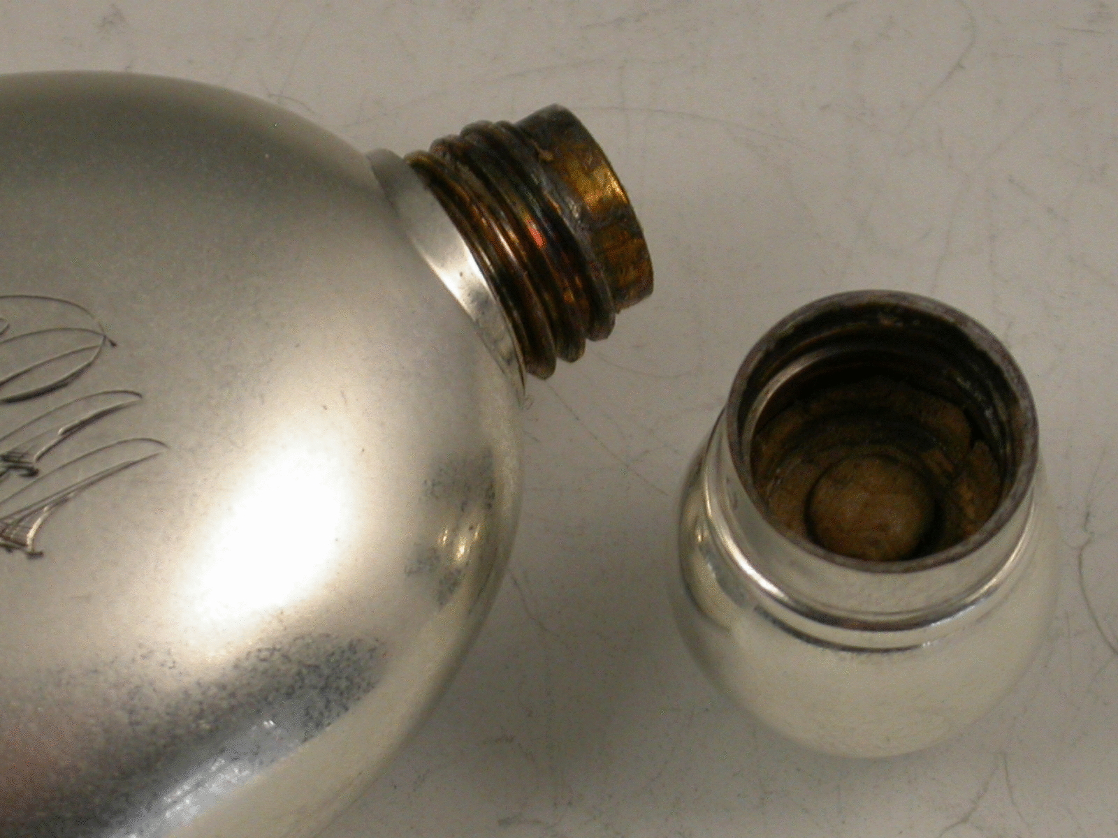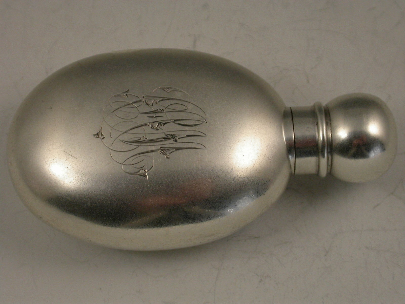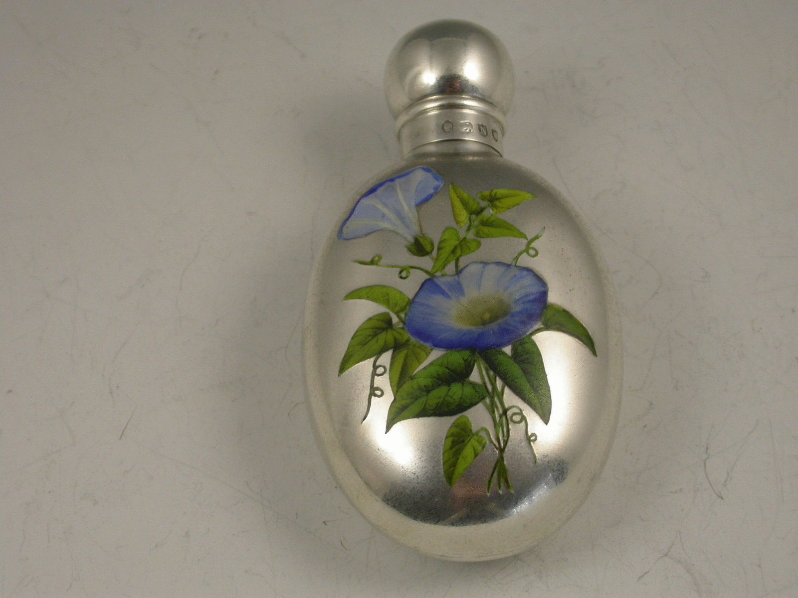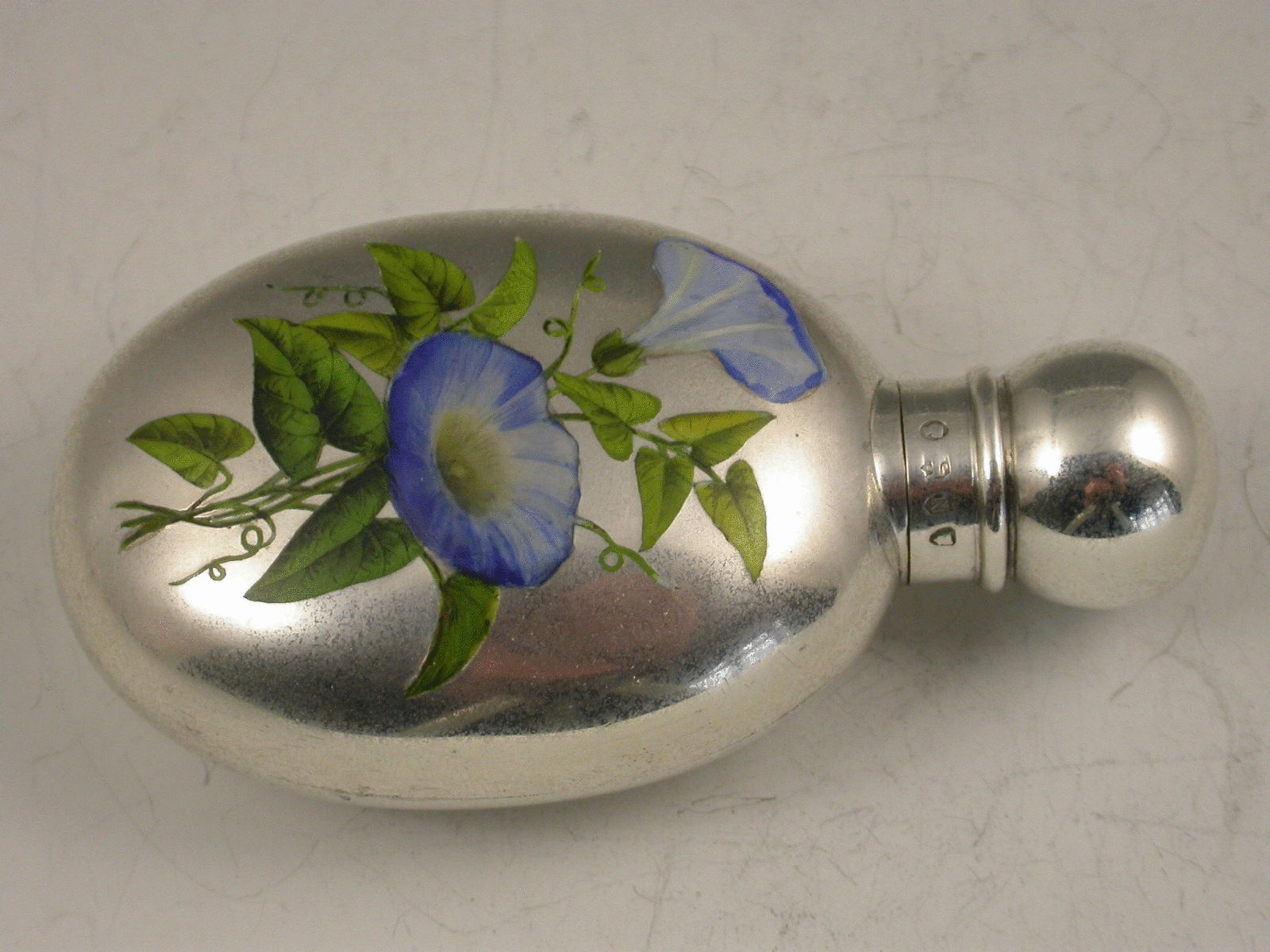 A fine Victorian oval silver Scent Flask with screw off circular top complete with original cork stopper, the face enamelled with blue Ipomoea plants. The reverse engraved with script initials.