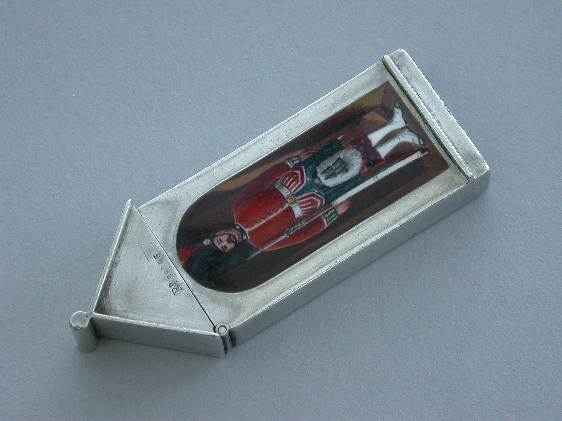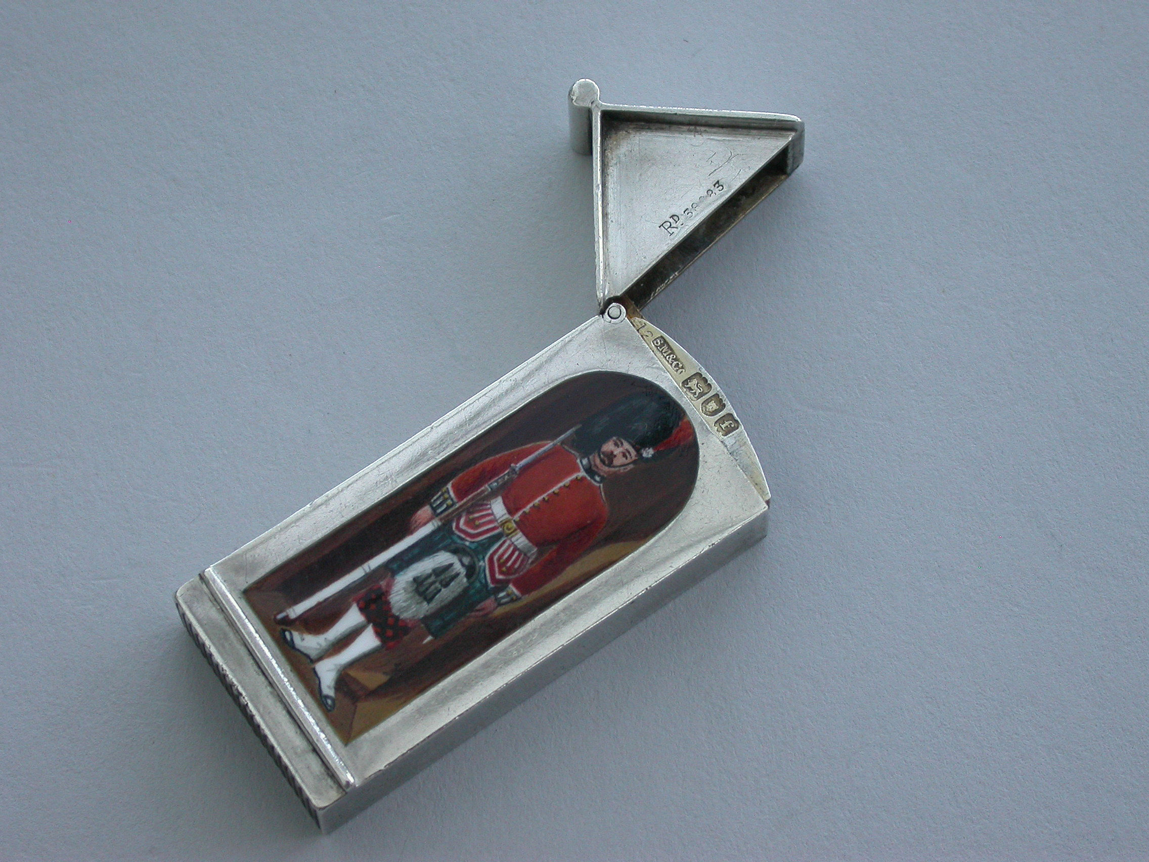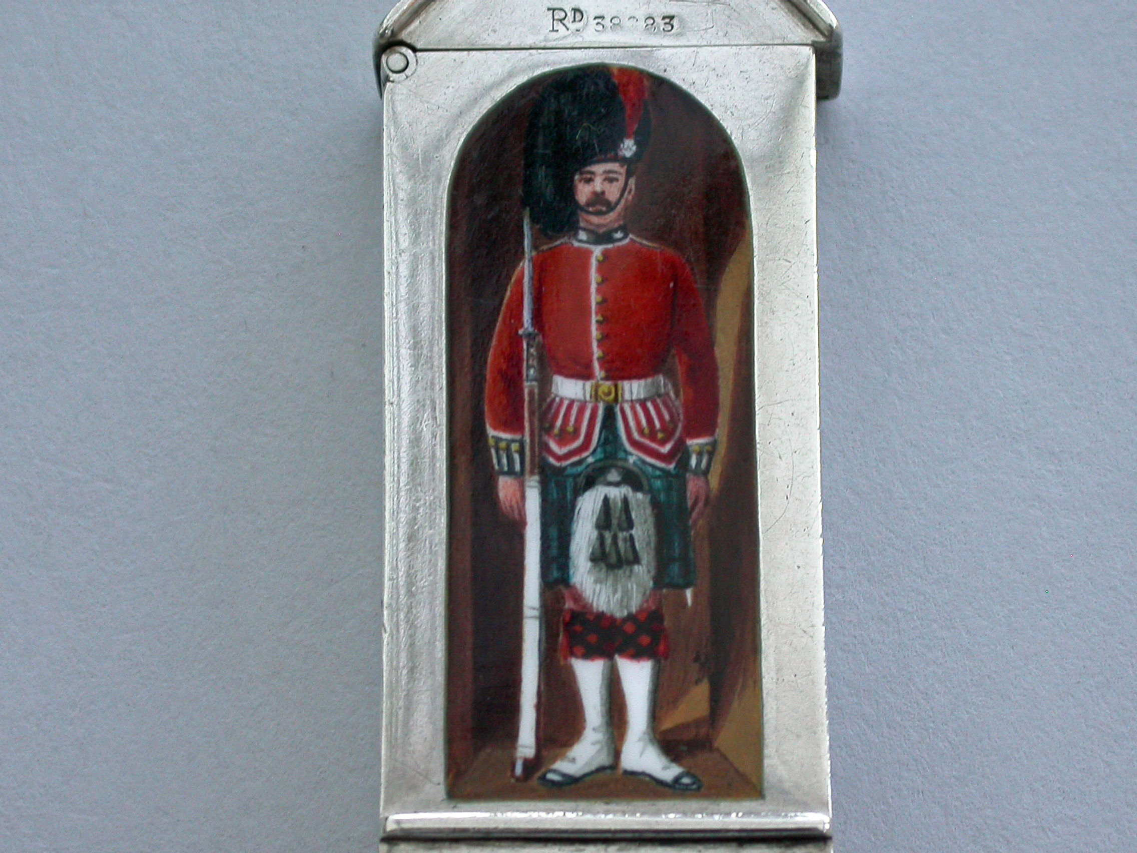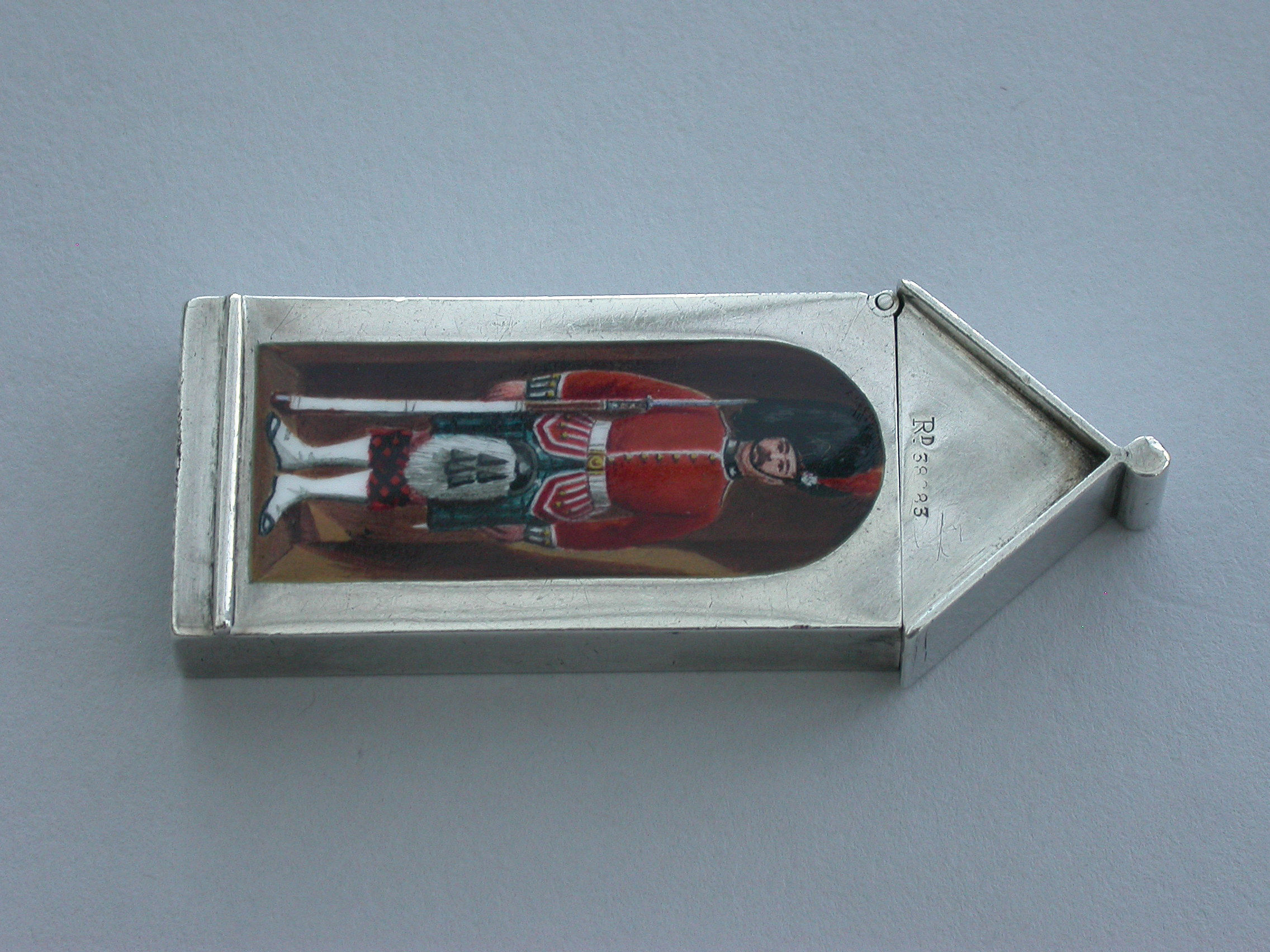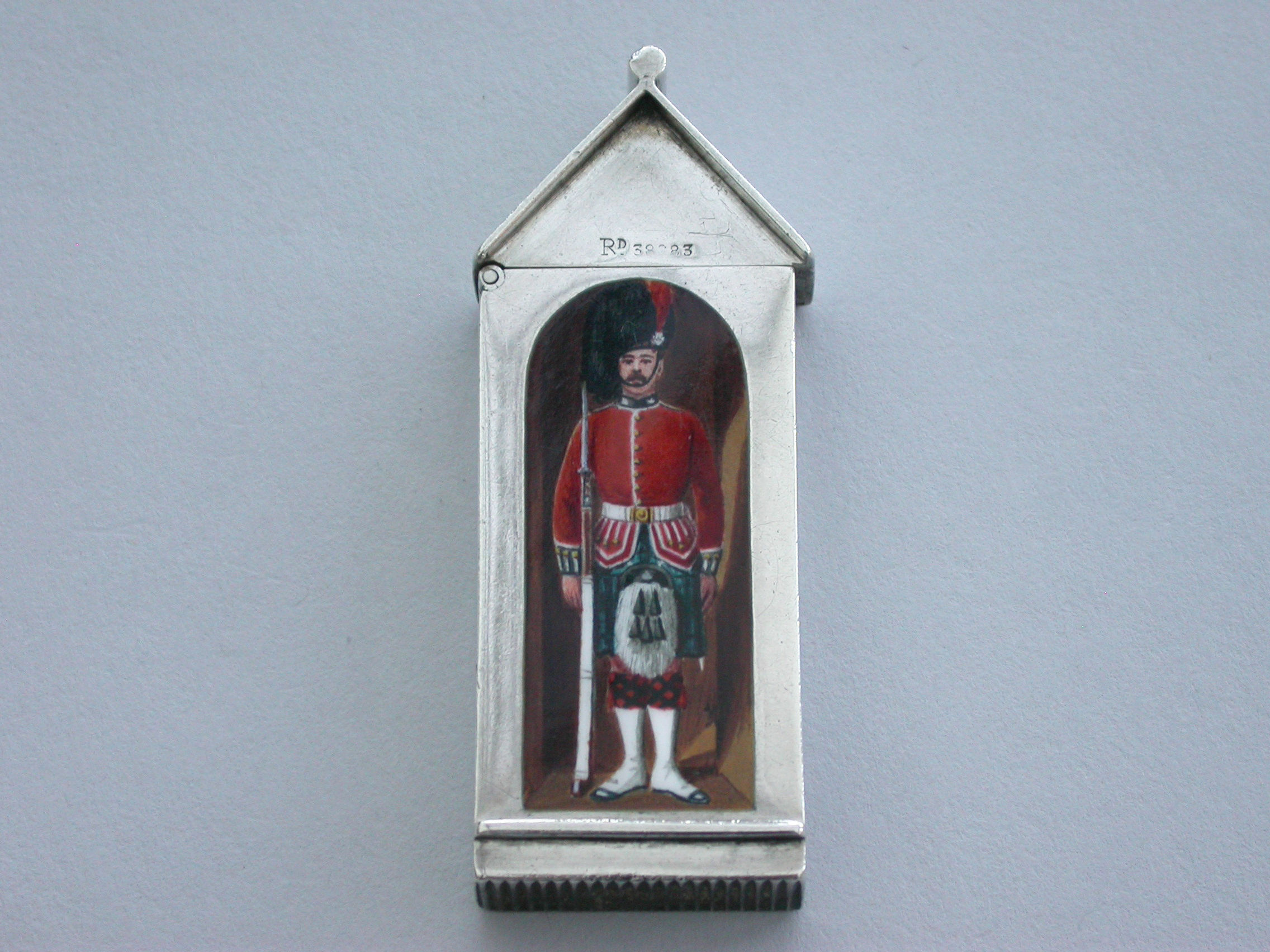 This is one from a series of silver and enamel Vesta Cases depicting ‘Soldiers of the Queen’ produced by Mordan around the time of Victoria’s Golden Jubilee in 1887. It was originally thought that the Sentry Box Vesta was limited to a series of perhaps 10 or 12 different examples made specifically for the Jubilee. Around 25 plus different Regiments have now been recorded.