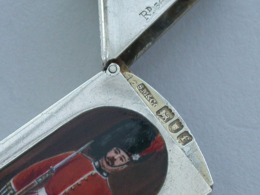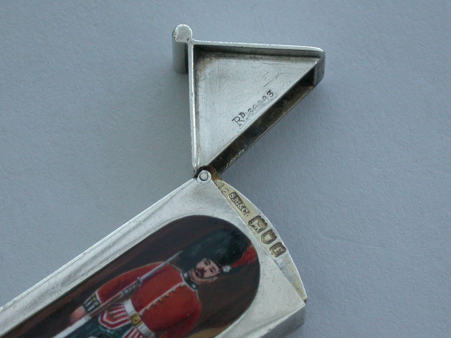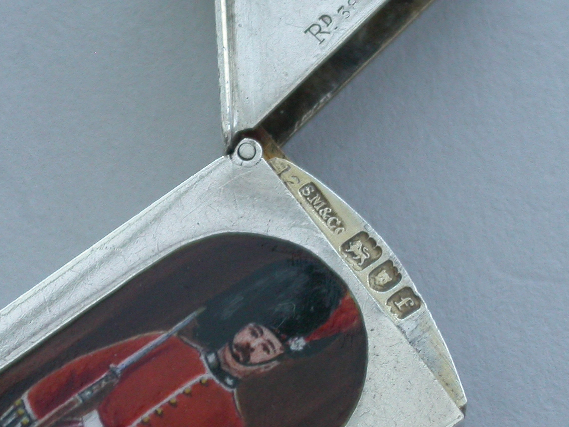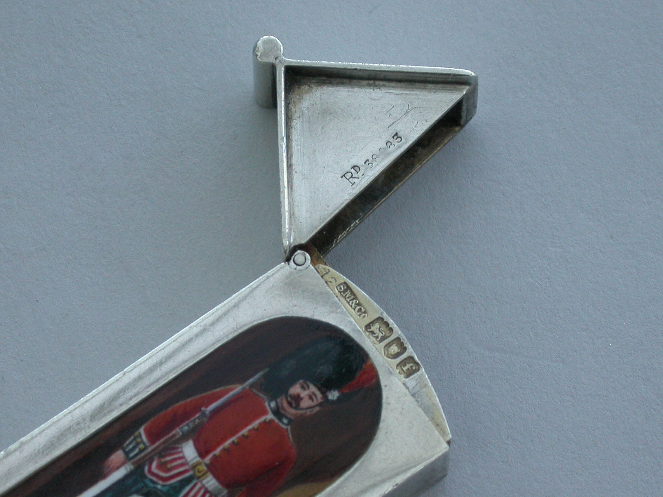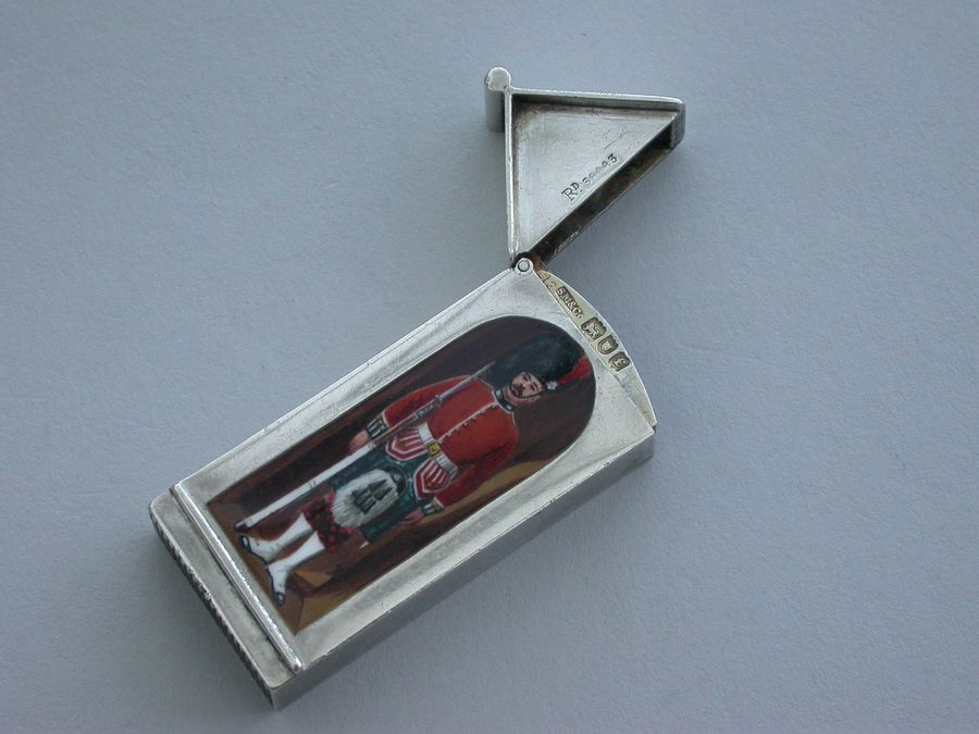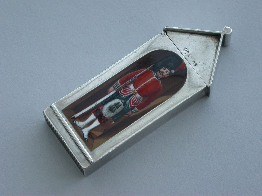 This is one from a series of silver and enamel Vesta Cases depicting ‘Soldiers of the Queen’ produced by Mordan around the time of Victoria’s Golden Jubilee in 1887. It was originally thought that the Sentry Box Vesta was limited to a series of perhaps 10 or 12 different examples made specifically for the Jubilee. Around 25 plus different Regiments have now been recorded.
