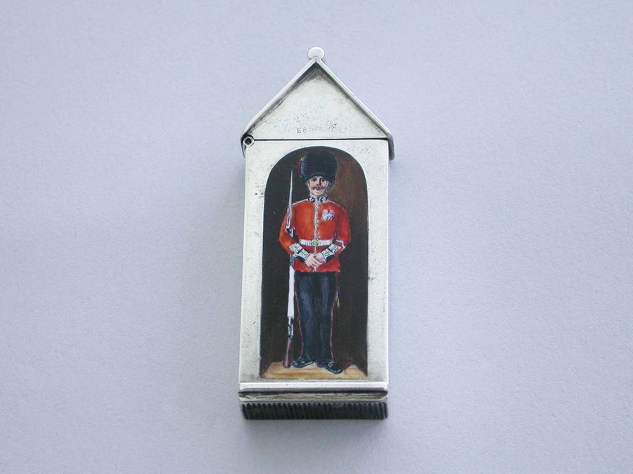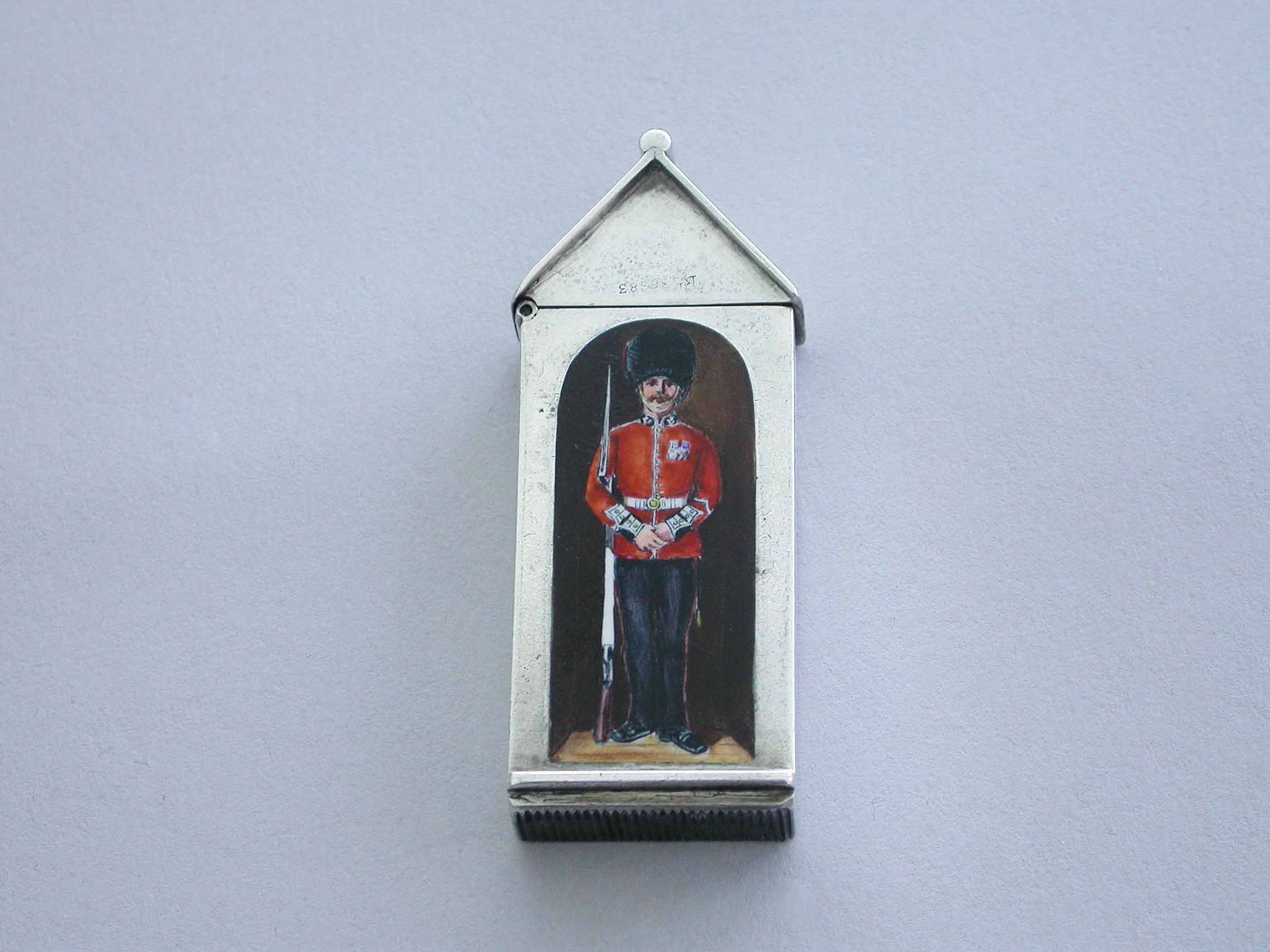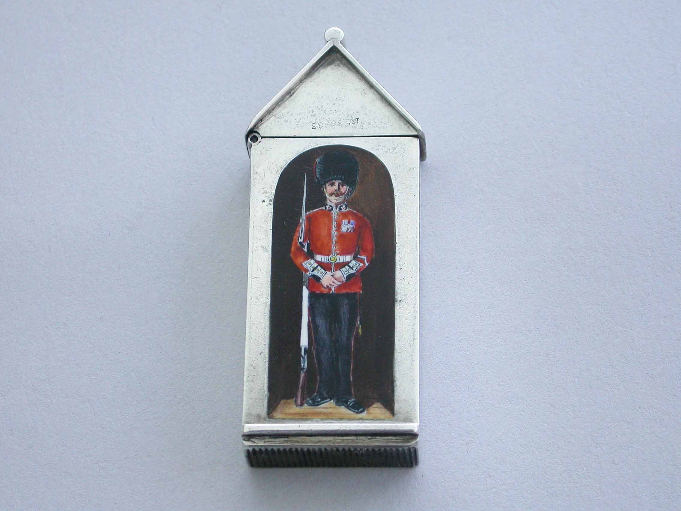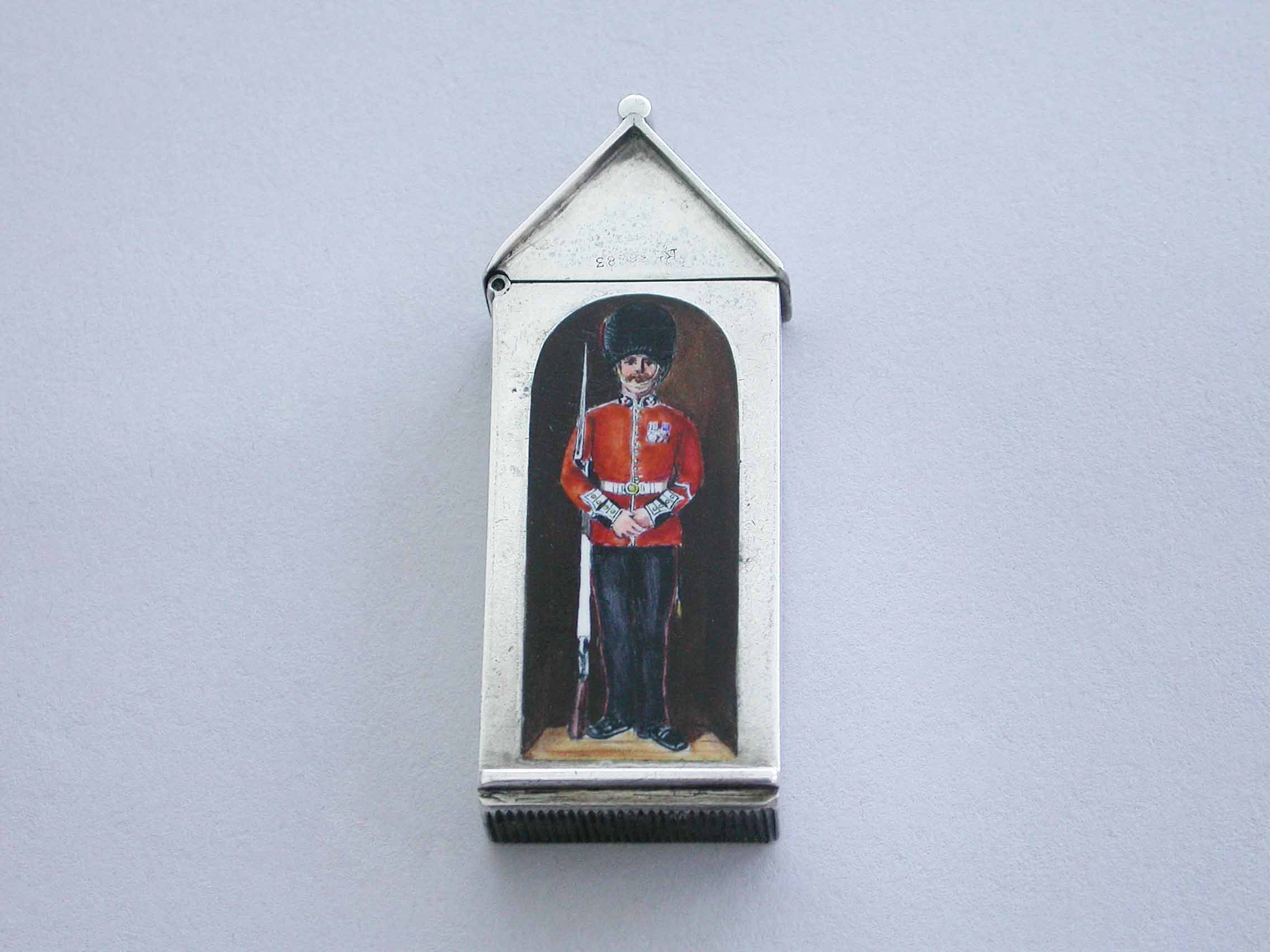 A rare Victorian silver and enamel Vesta Case of Sentry Box form with hinged peaked lid, the face enamelled with a soldier from The Coldstream Guards.