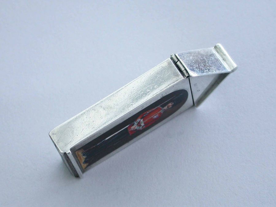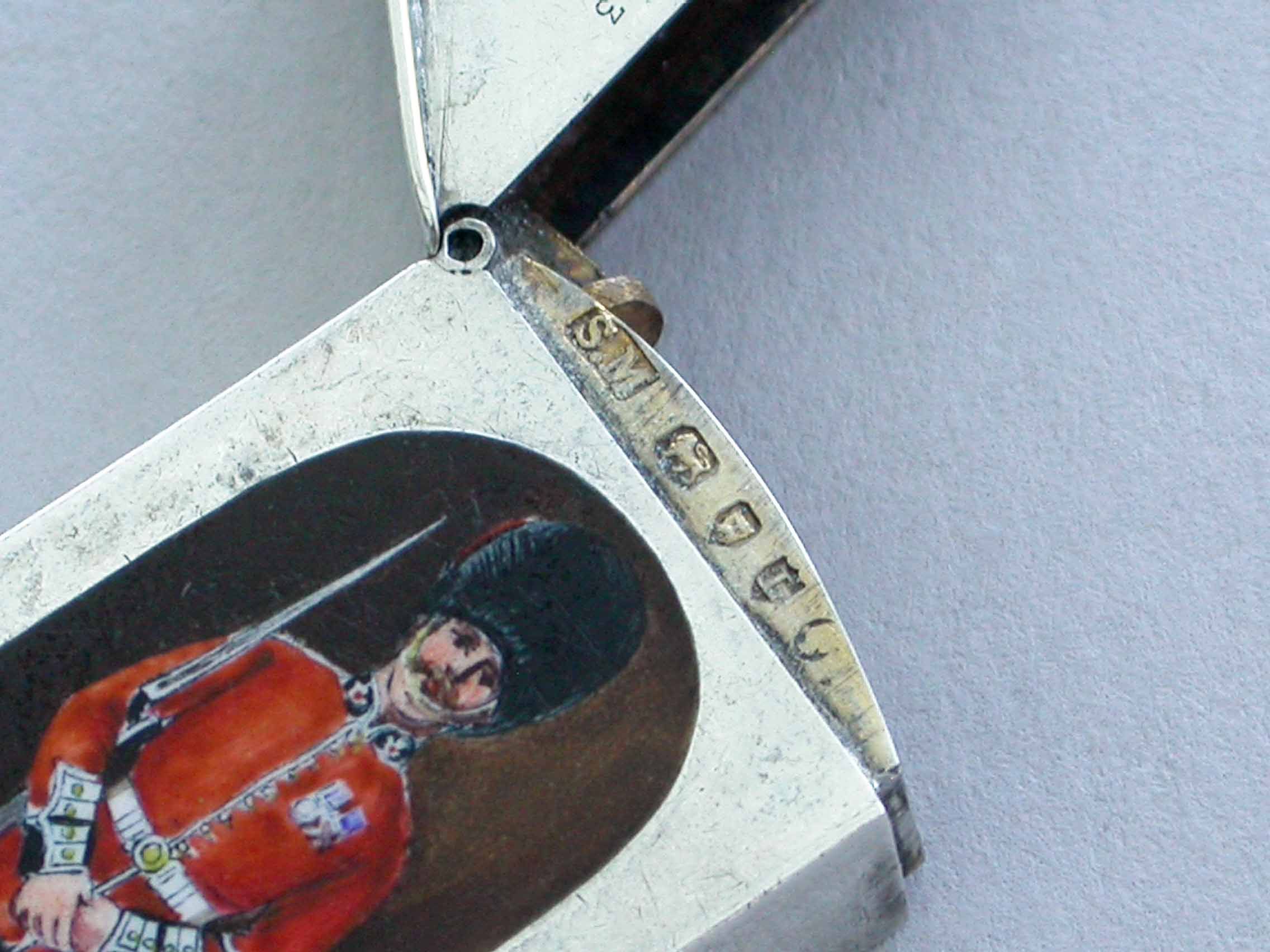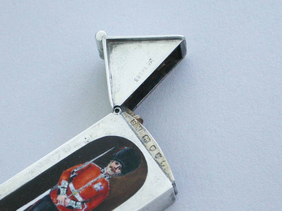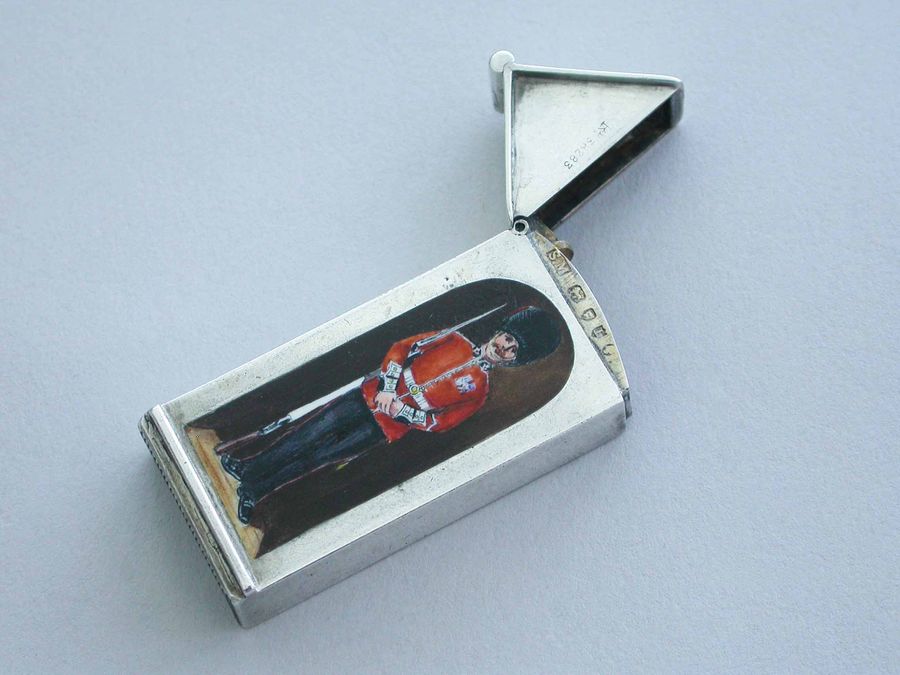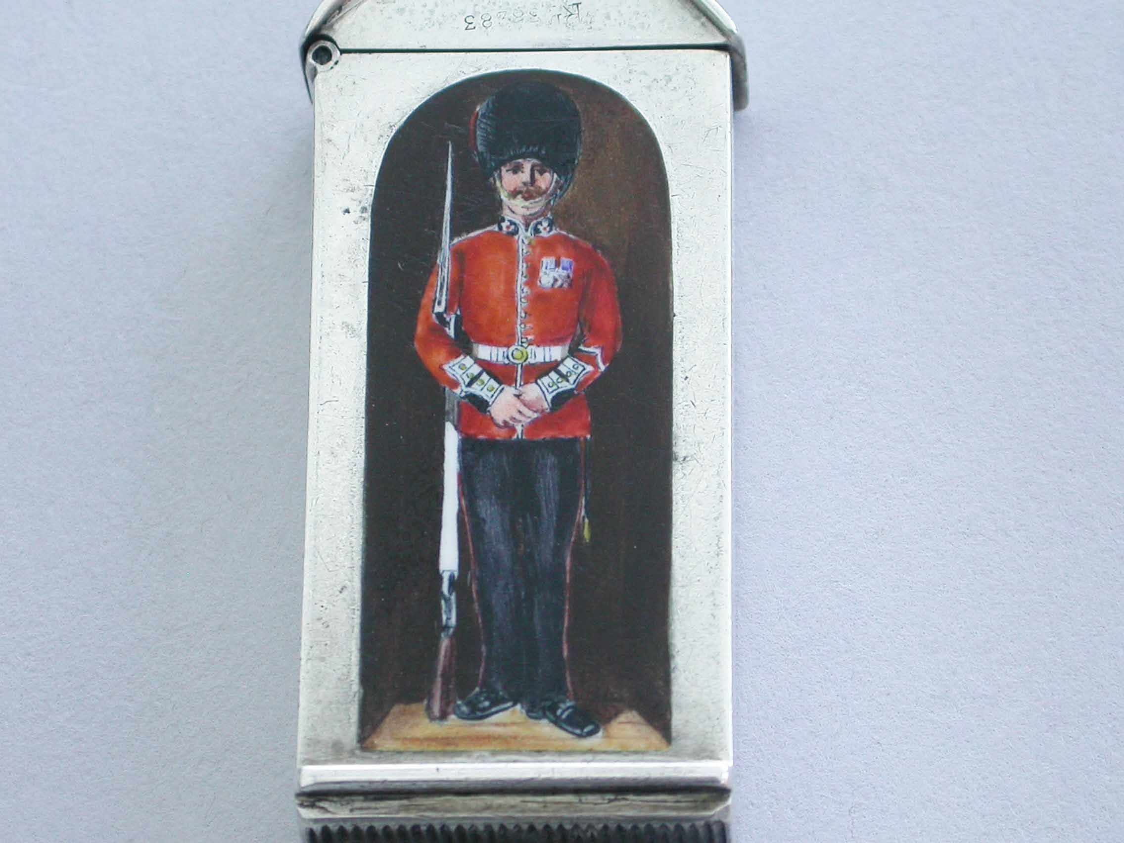 This is one from a series of silver and enamel Vesta Cases depicting ‘Soldiers of the Queen’ produced by Mordan around the time of Victoria’s Golden Jubilee in 1887. It was originally thought that the Sentry Box Vesta was limited to a series of perhaps 10 or 12 different examples made specifically for the Jubilee. Around 25 plus different Regiments have now been recorded.