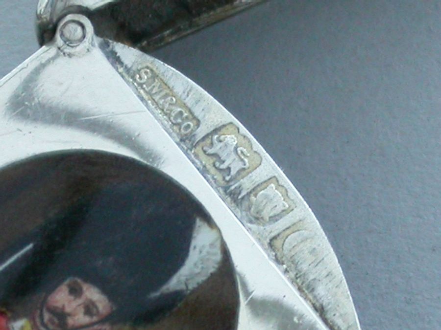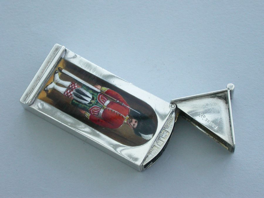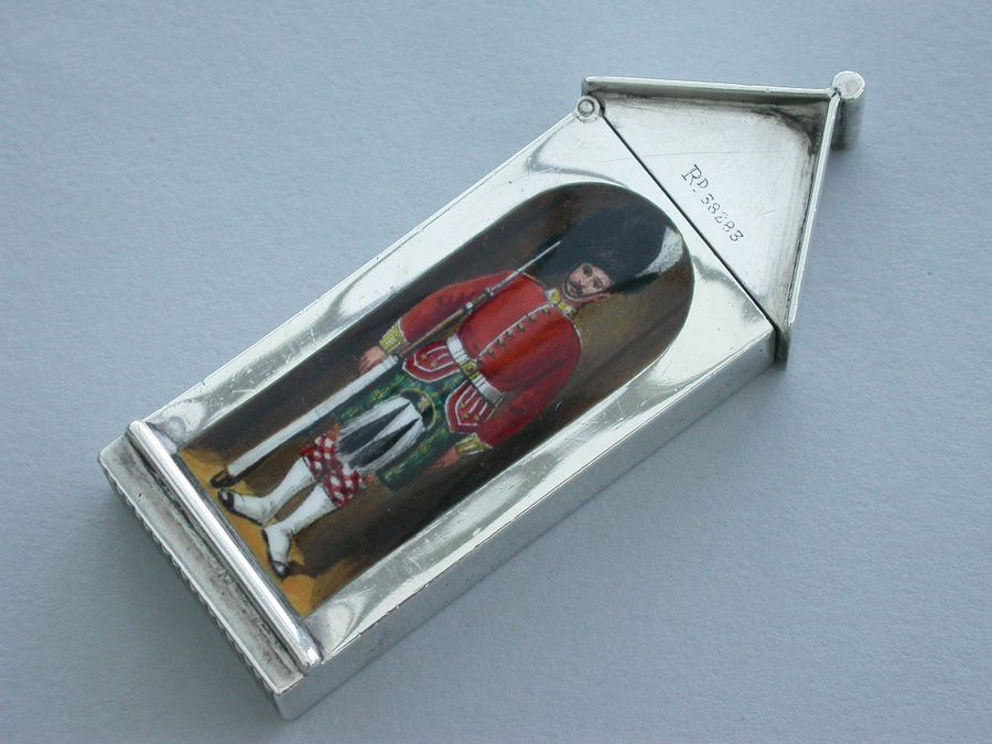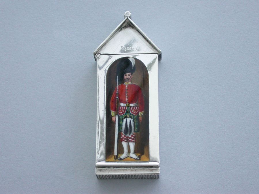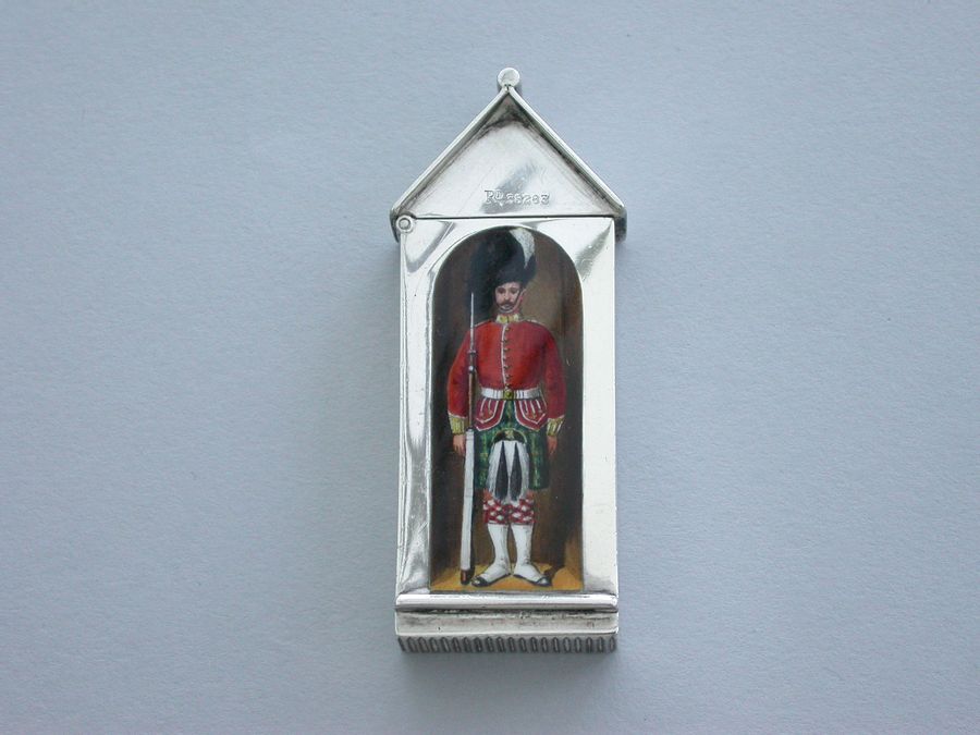 This is one from a series of silver and enamel Vesta Cases depicting ‘Soldiers of the Queen’ produced by Mordan around the time of Victoria’s Golden Jubilee in 1887. It was originally thought that the Sentry Box Vesta was limited to a series of perhaps 10 or 12 different examples made specifically for the Jubilee. Around 25 plus different Regiments have now been recorded.
