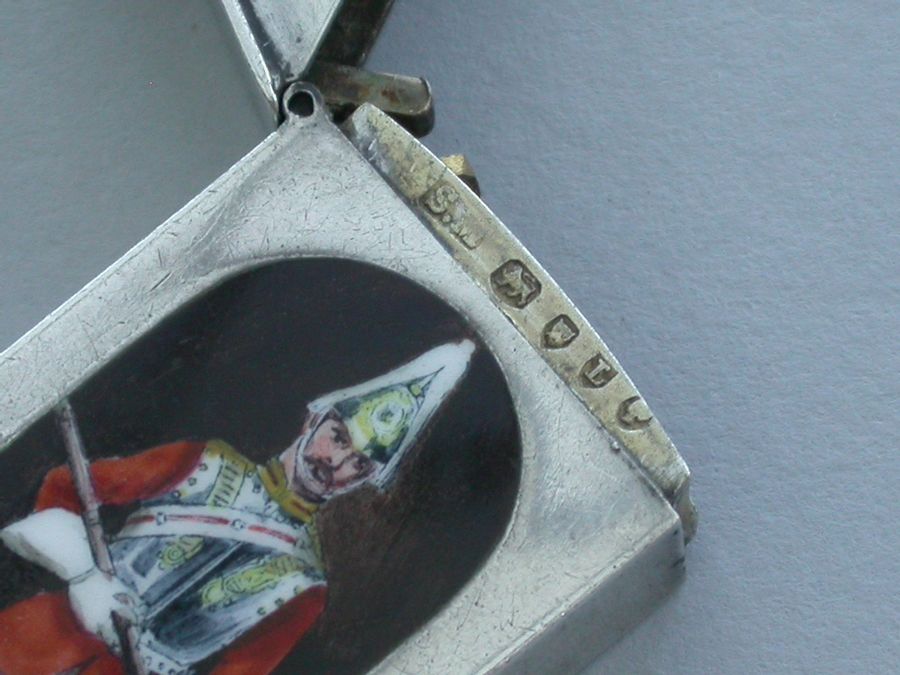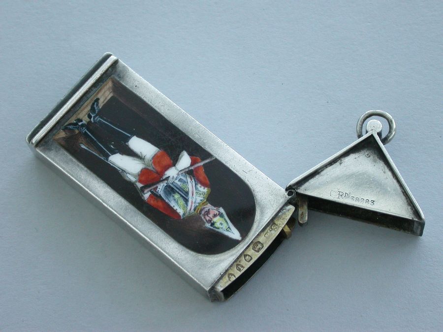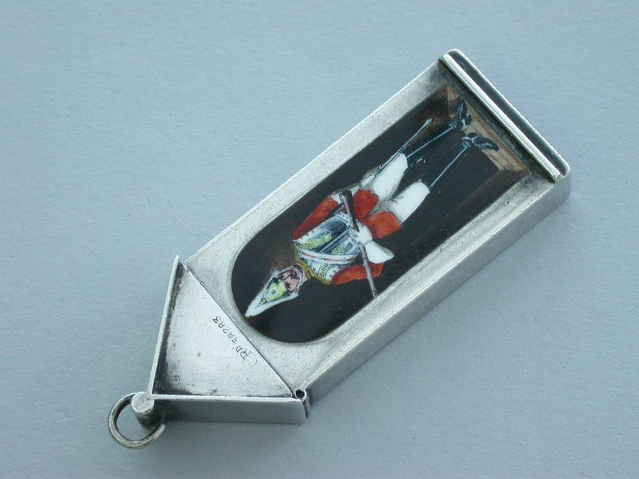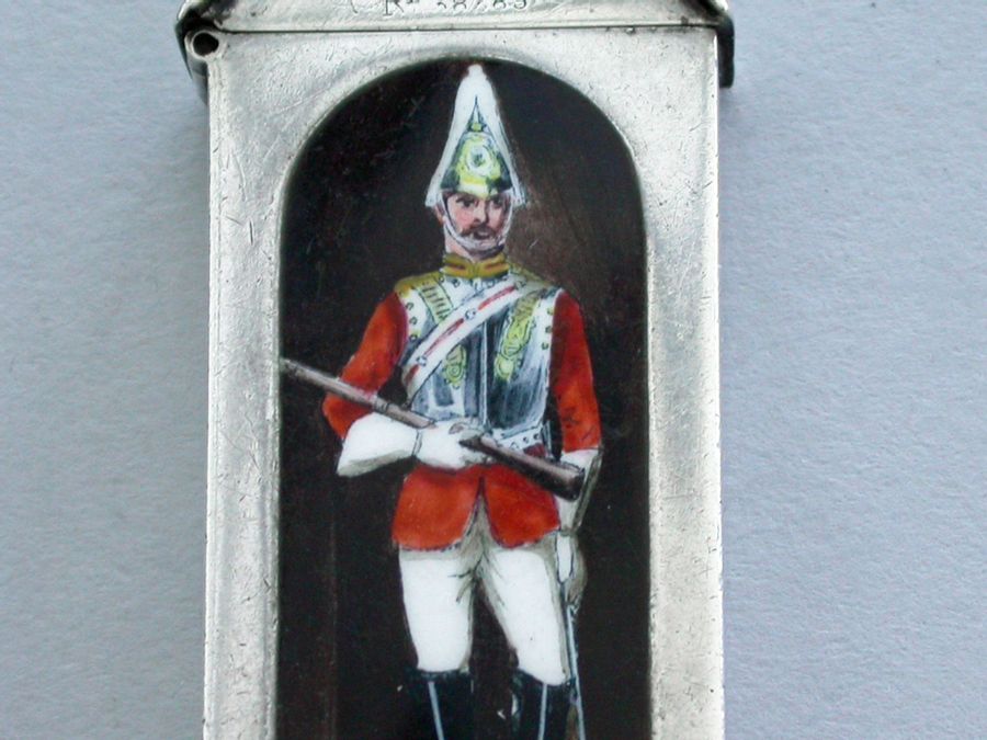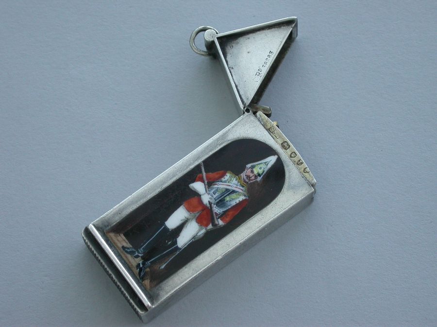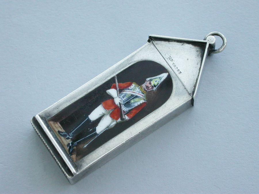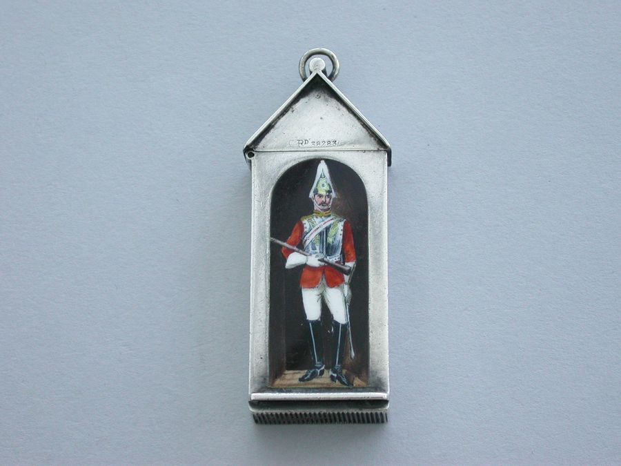 This is one from a series of silver and enamel Vesta Cases depicting ‘Soldiers of the Queen’ produced by Mordan around the time of Victoria’s Golden Jubilee in 1887. It was originally thought that the Sentry Box Vesta was limited to a series of perhaps 10 or 12 different examples made specifically for the Jubilee. Around 25 plus different Regiments have now been recorded.