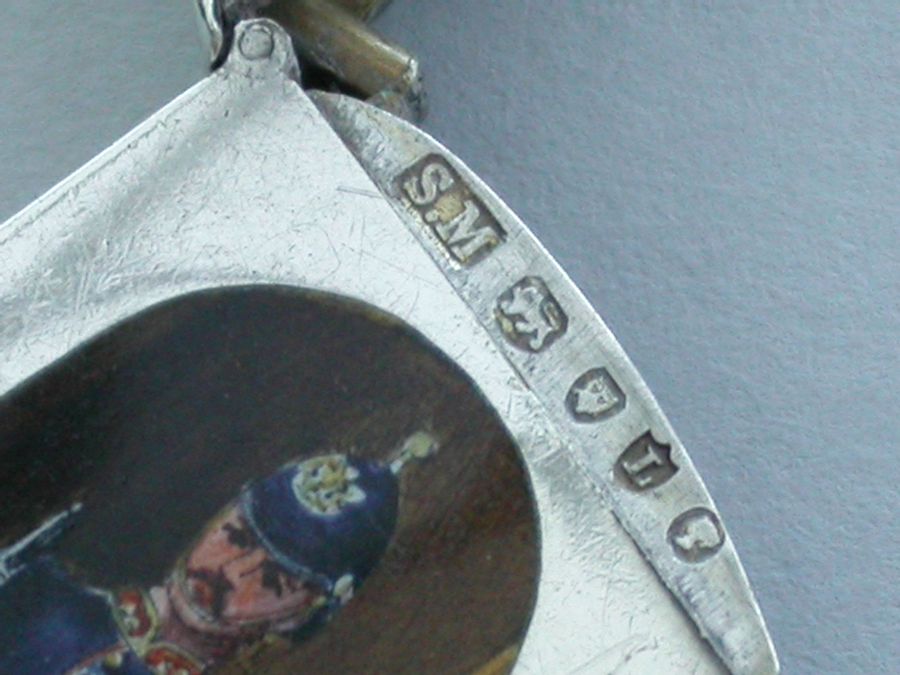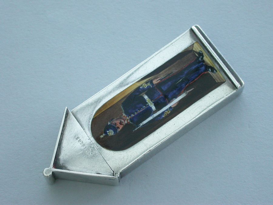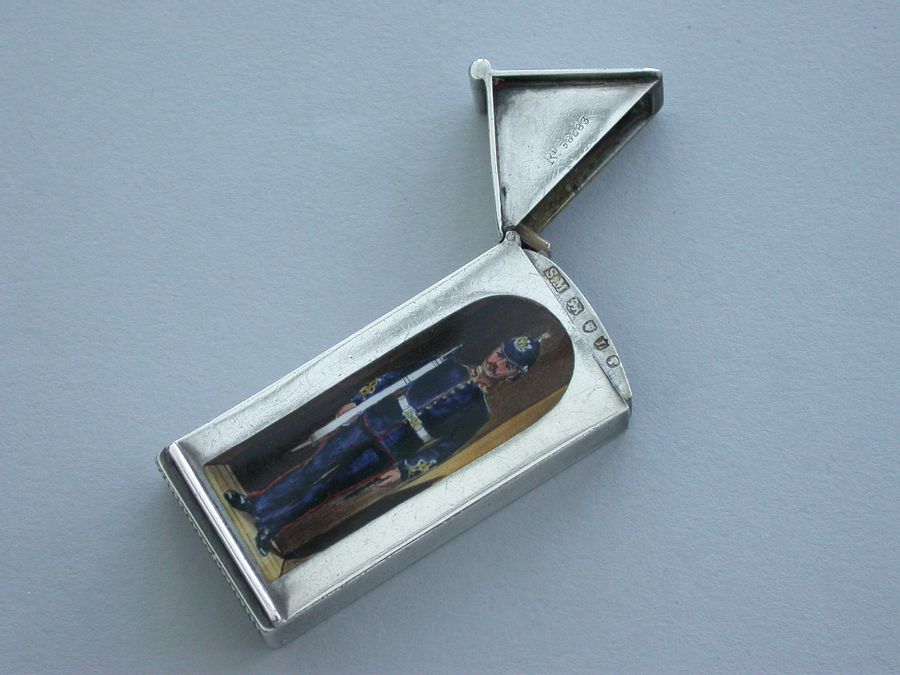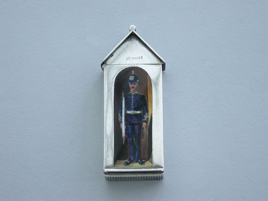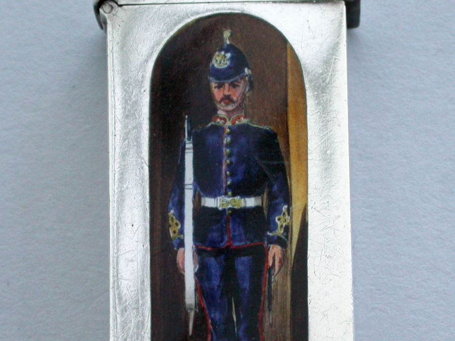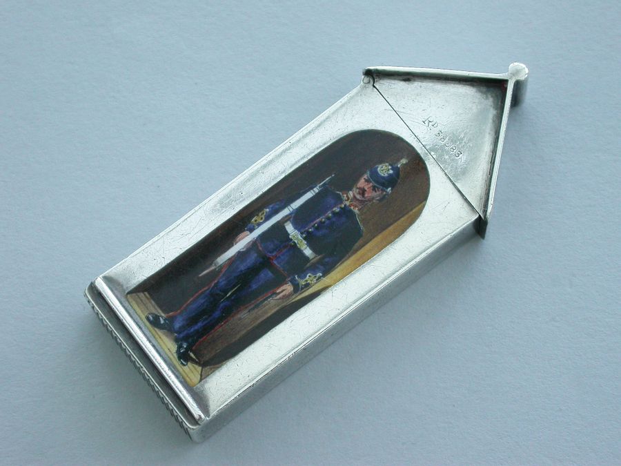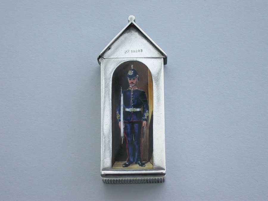 This is one from a series of silver and enamel Vesta Cases depicting ‘Soldiers of the Queen’ produced by Mordan around the time of Victoria’s Golden Jubilee in 1887. It was originally thought that the Sentry Box Vesta was limited to a series of perhaps 10 or 12 different examples made specifically for the Jubilee. Around 25 plus different Regiments have now been recorded.