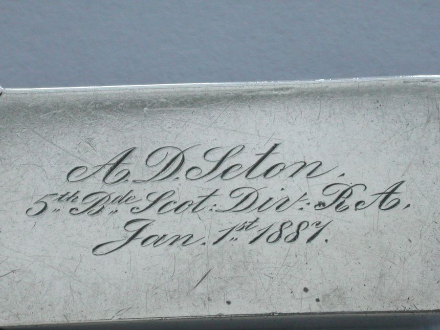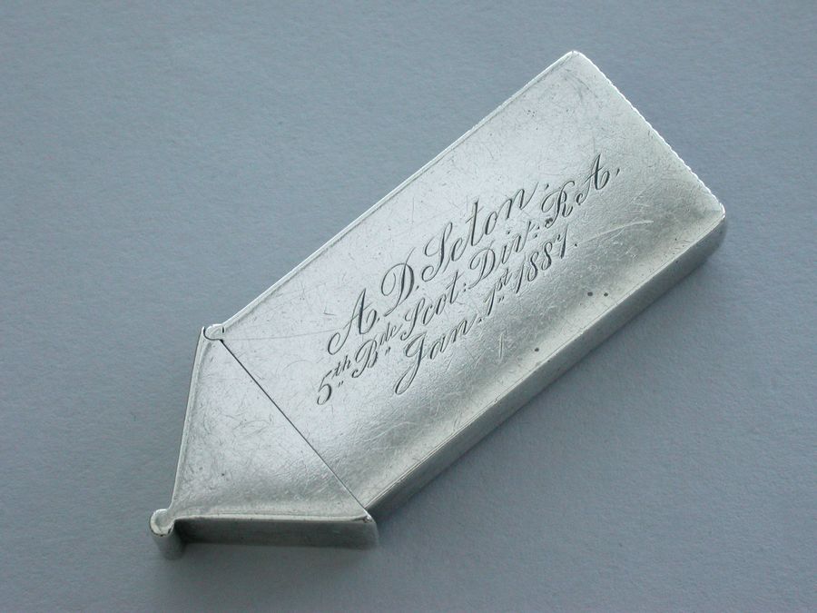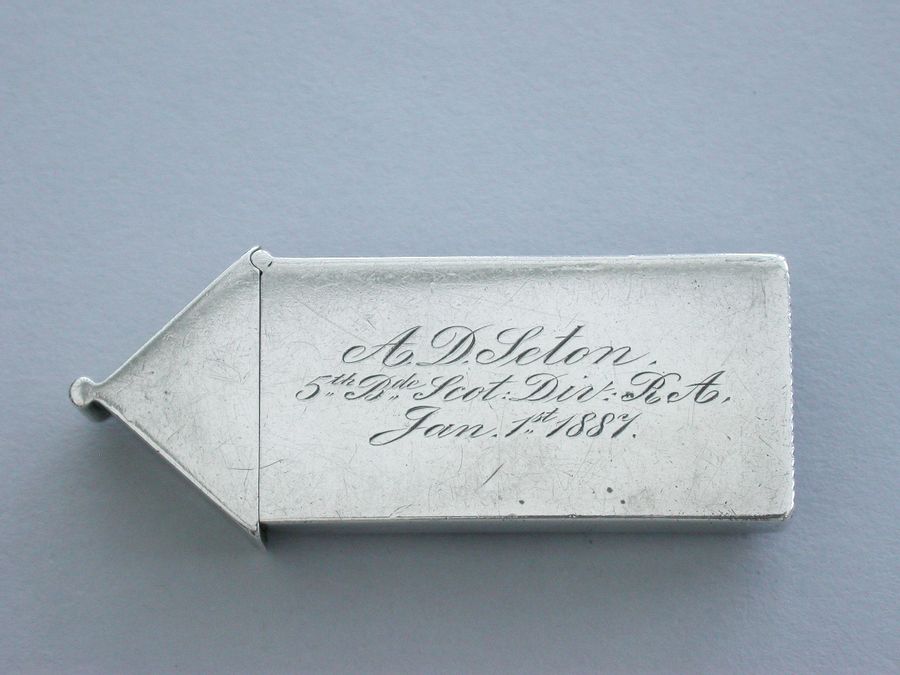 A fine and rare Victorian silver and enamel Vesta Case of Sentry Box form with hinged peaked lid, the face enamelled with a soldier from The Royal Artillery (Scottish Division). Silver gilt interior. The reverse engraved - ""A D Seton, 5th Bde Scot Div. RA. Jan 1st 1887"".
