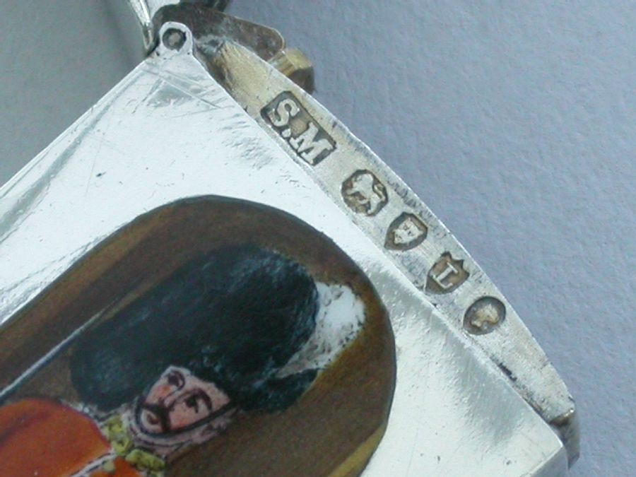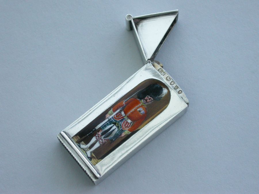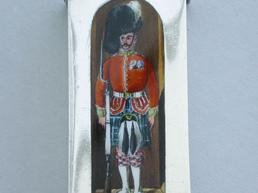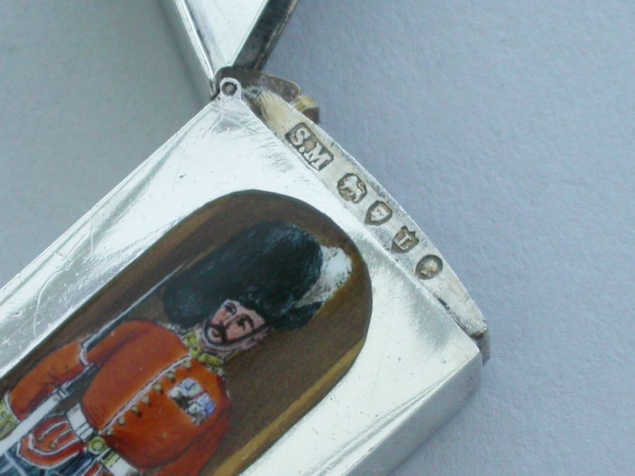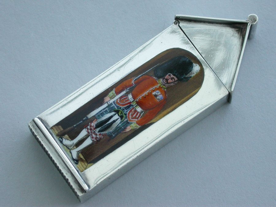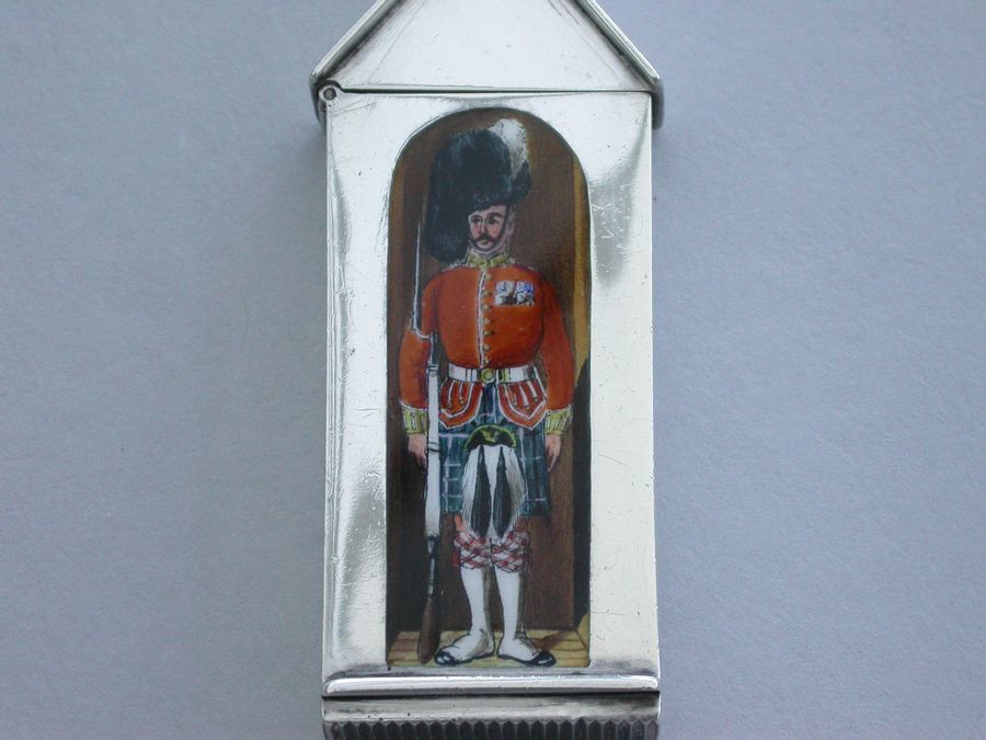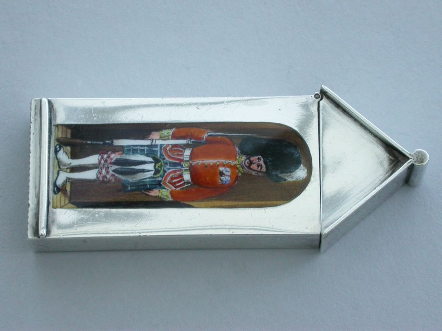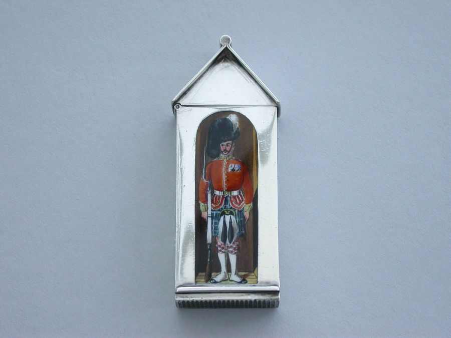 This is one from a series of silver and enamel Vesta Cases depicting ‘Soldiers of the Queen’ produced by Mordan around the time of Victoria’s Golden Jubilee in 1887. It was originally thought that the Sentry Box Vesta was limited to a series of perhaps 10 or 12 different examples made specifically for the Jubilee. Around 25 plus different Regiments have now been recorded.