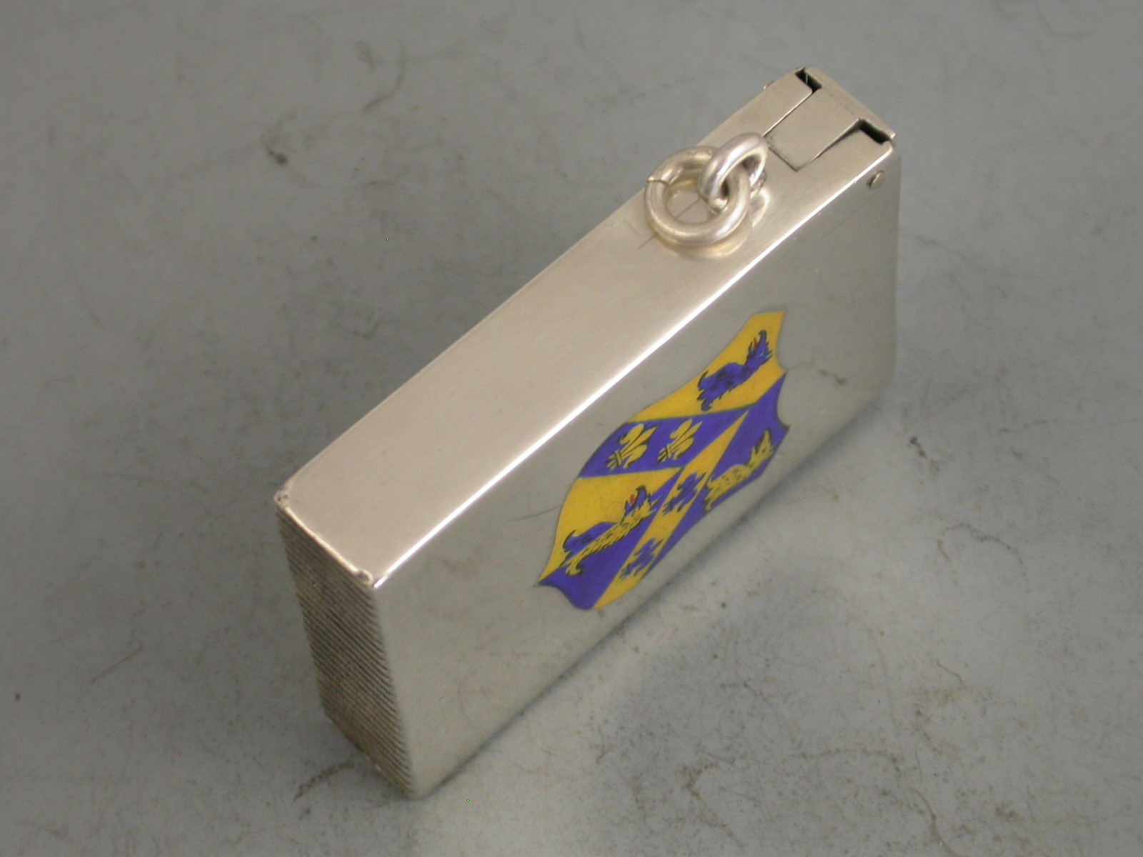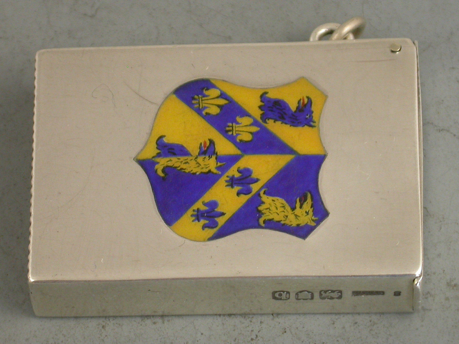 A fine Victorian silver Vesta Case of rectangular form with sprung hinged flat-top lid. The face enamelled with the Coat of Arms of Trinity College, Oxford University.