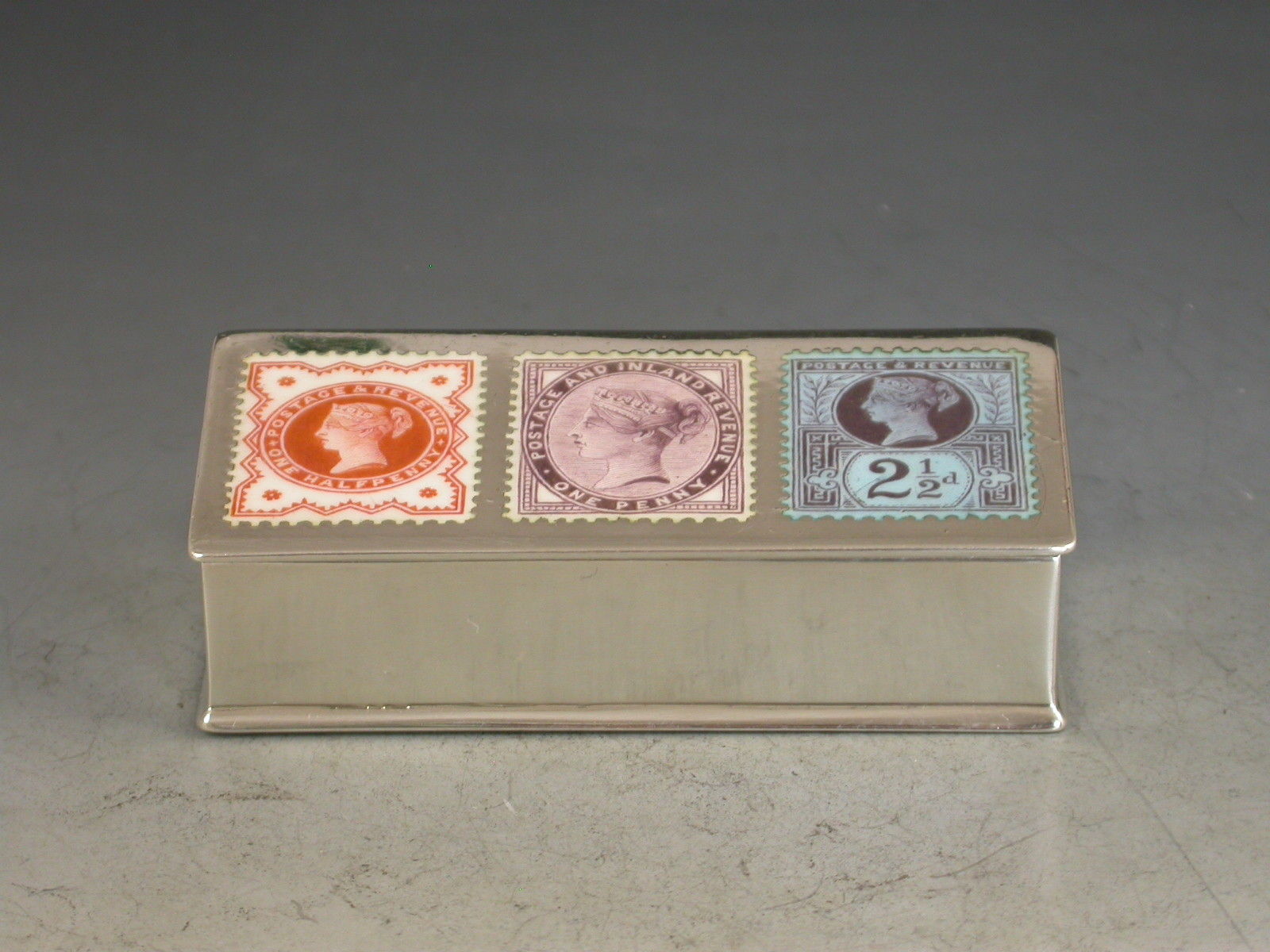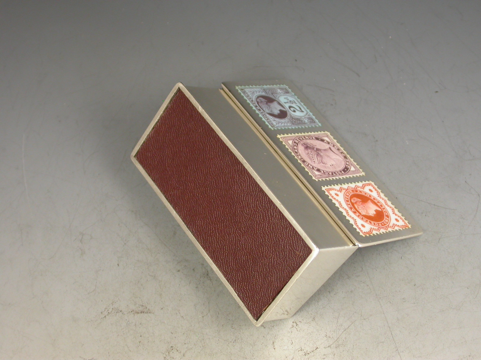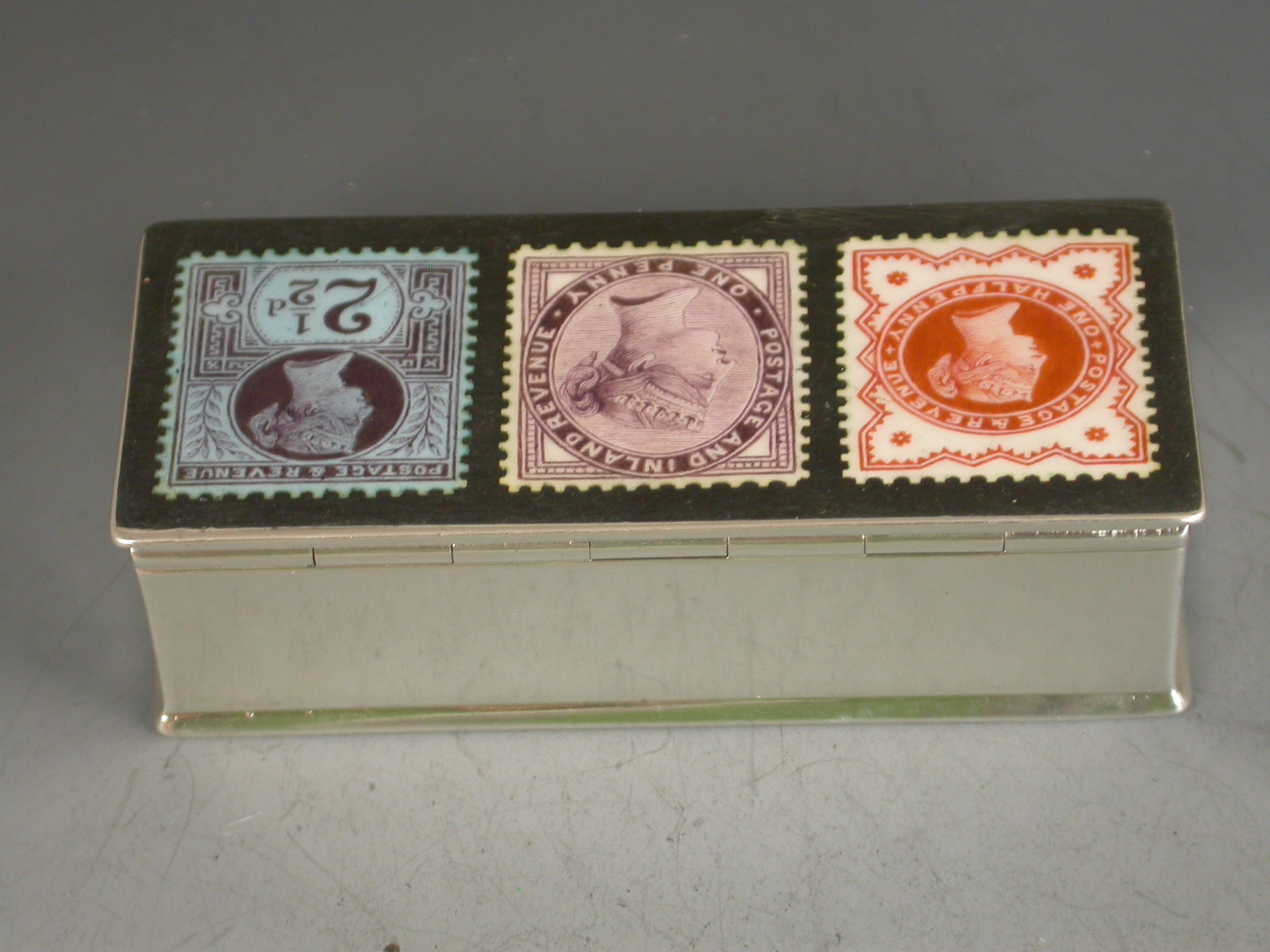 An extremely fine and rare Victorian silver triple compartment Stamp Box, the sloping hinged lid with superb inset enamel depictions of Victorian half-penny vermillion, one penny lilac and two and a half penny blue stamps. The interior with three sloping compartments.