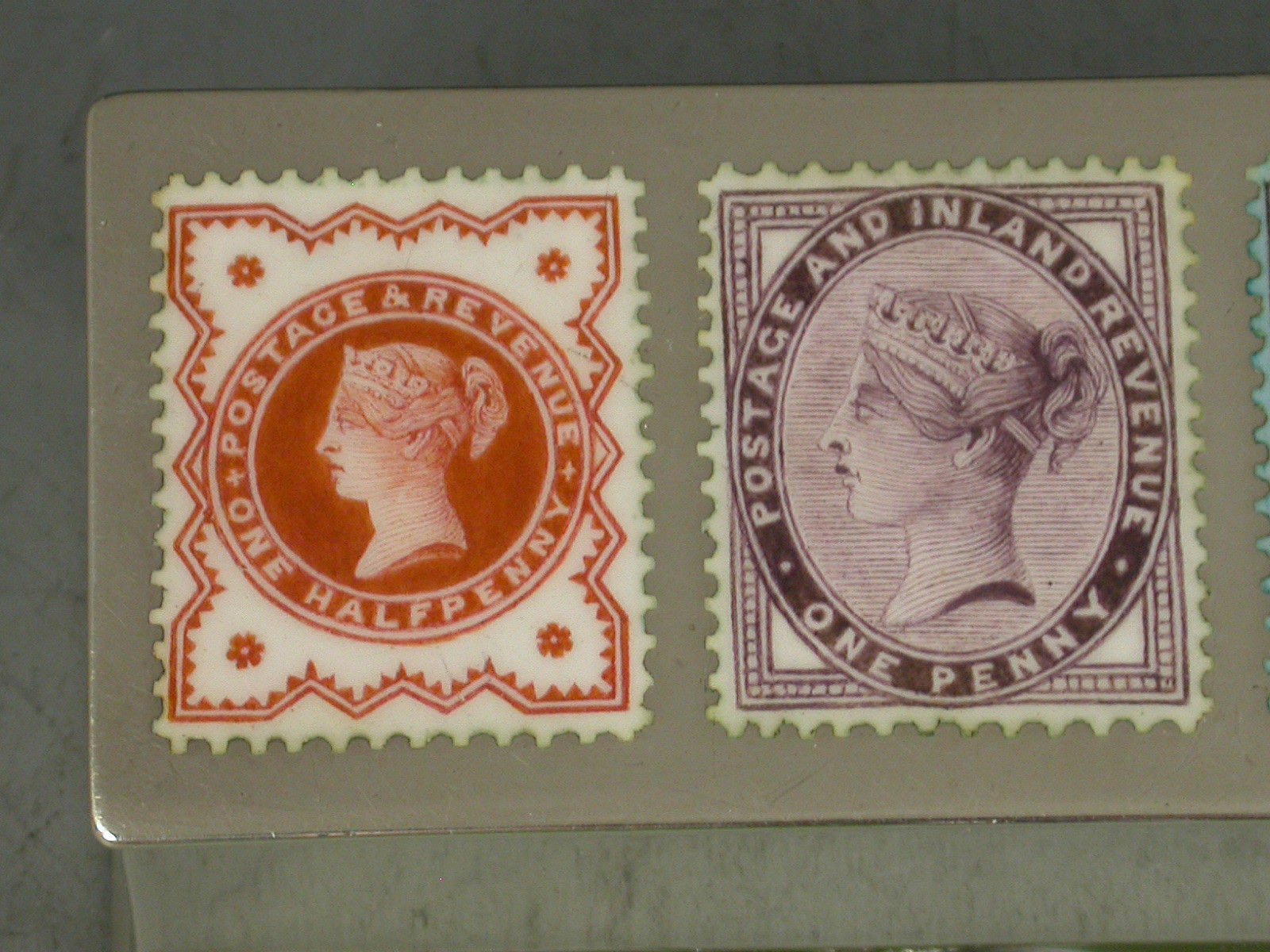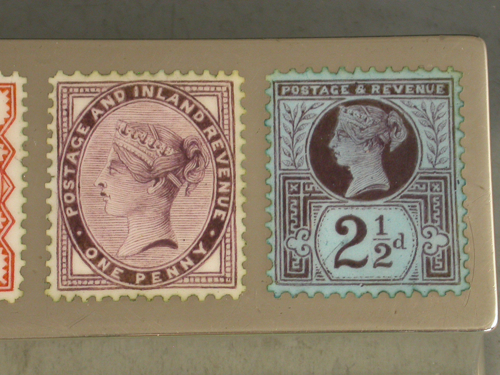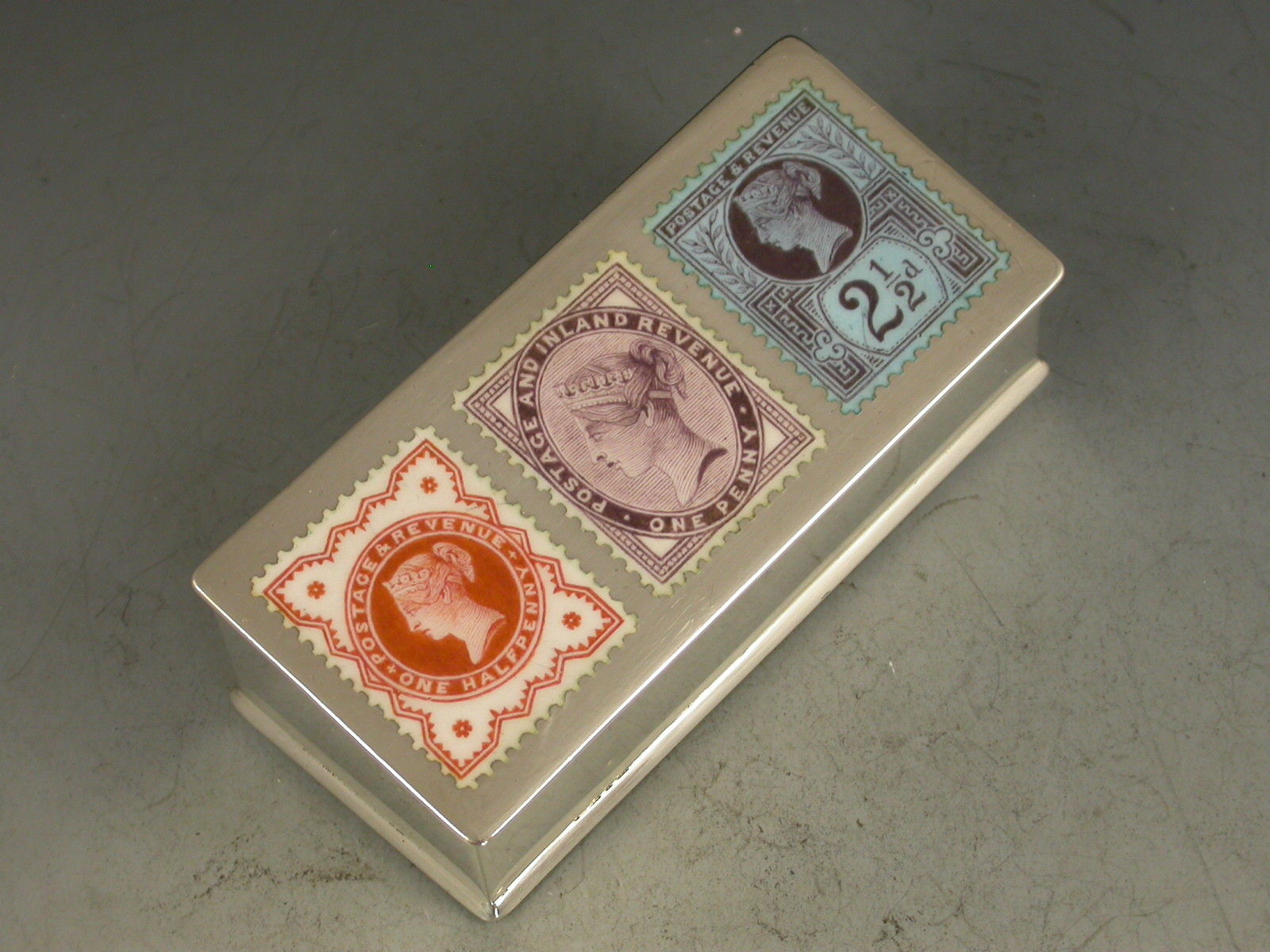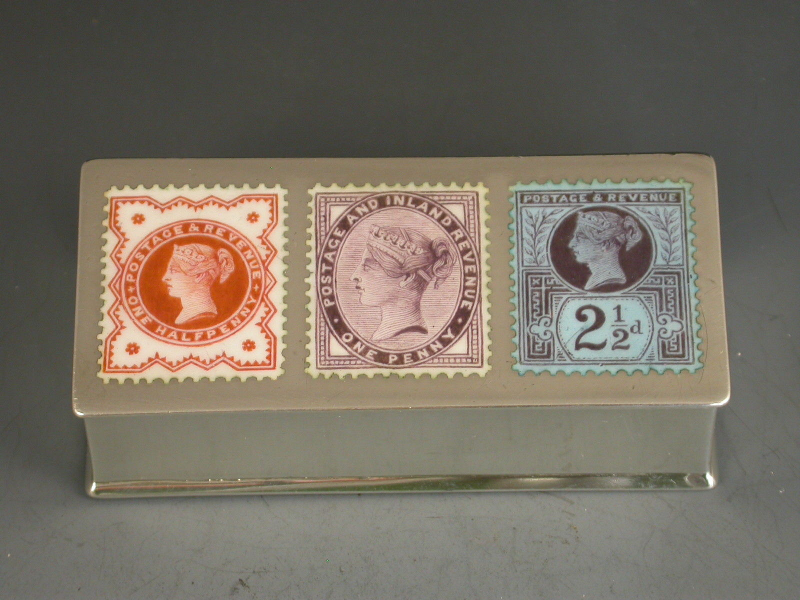 An extremely fine and rare Victorian silver triple compartment Stamp Box, the sloping hinged lid with superb inset enamel depictions of Victorian half-penny vermillion, one penny lilac and two and a half penny blue stamps. The interior with three sloping compartments.