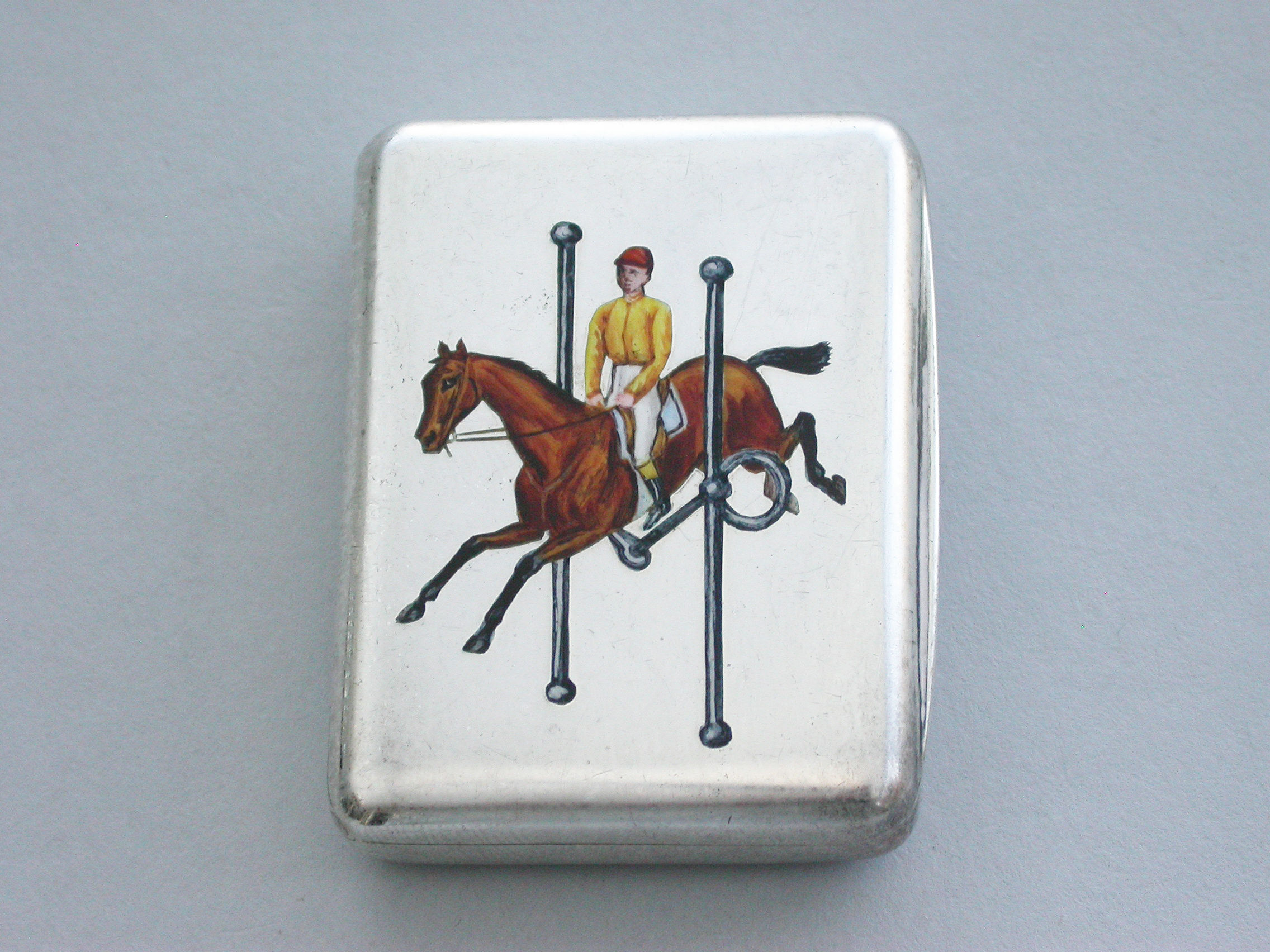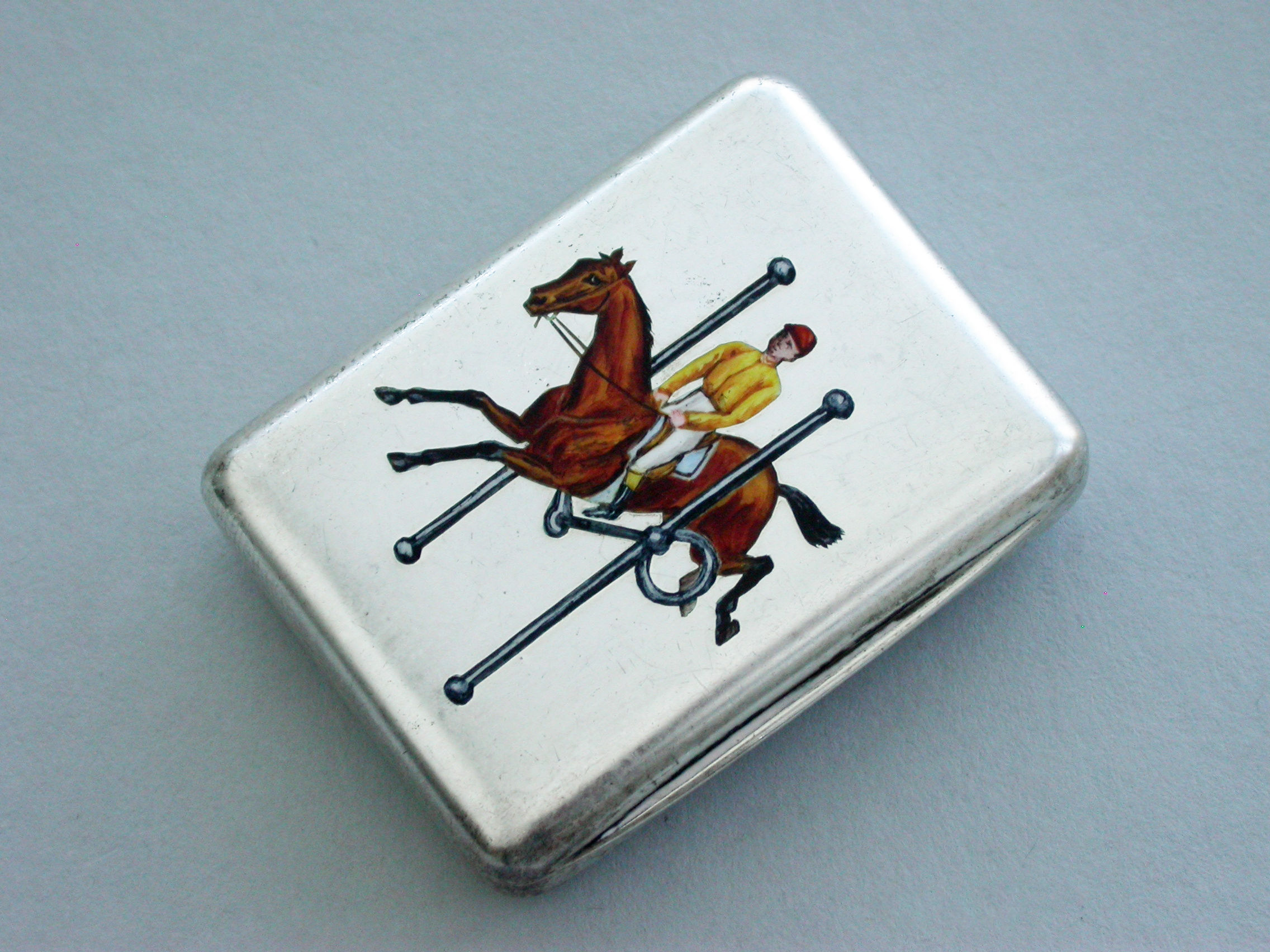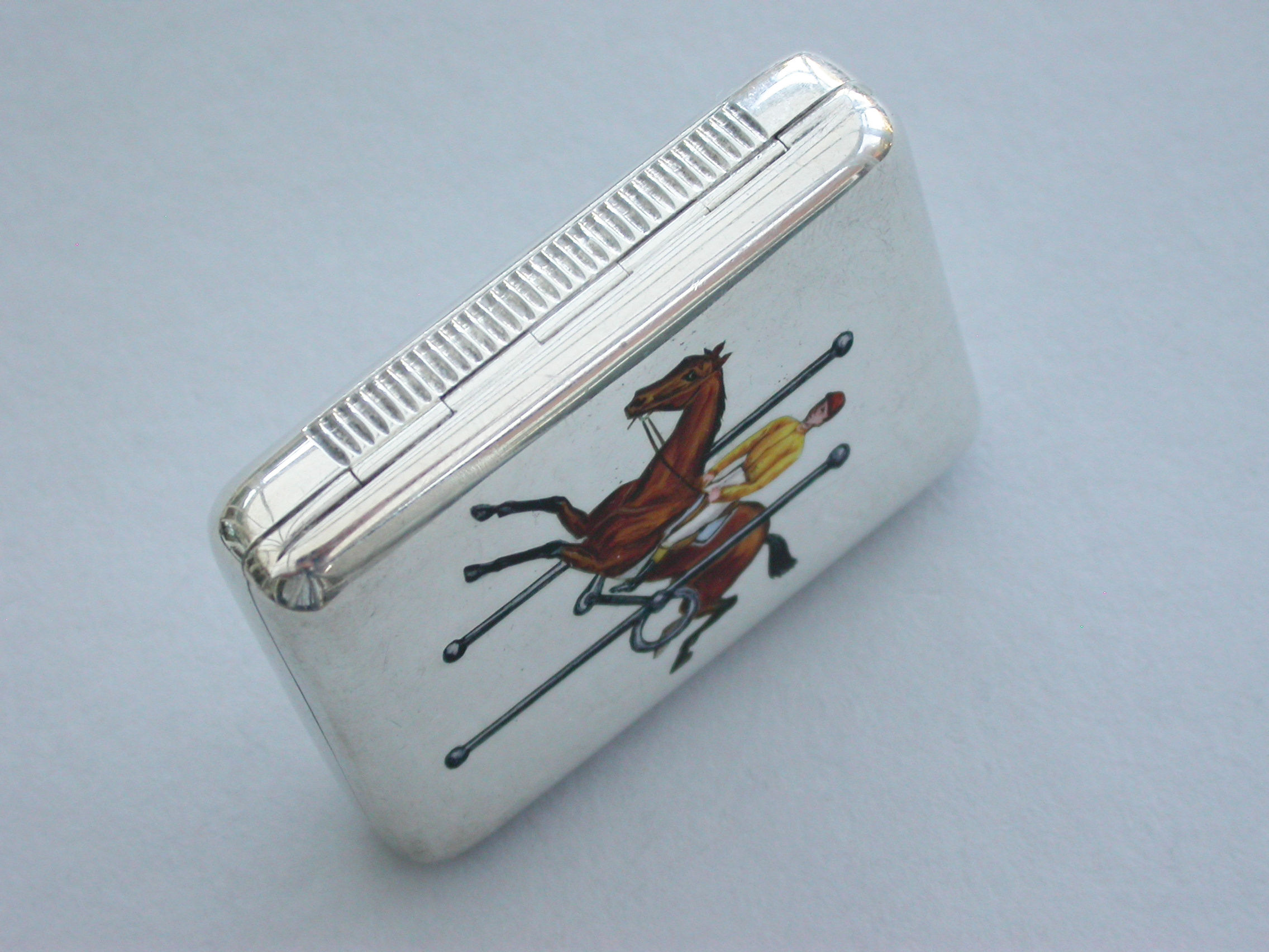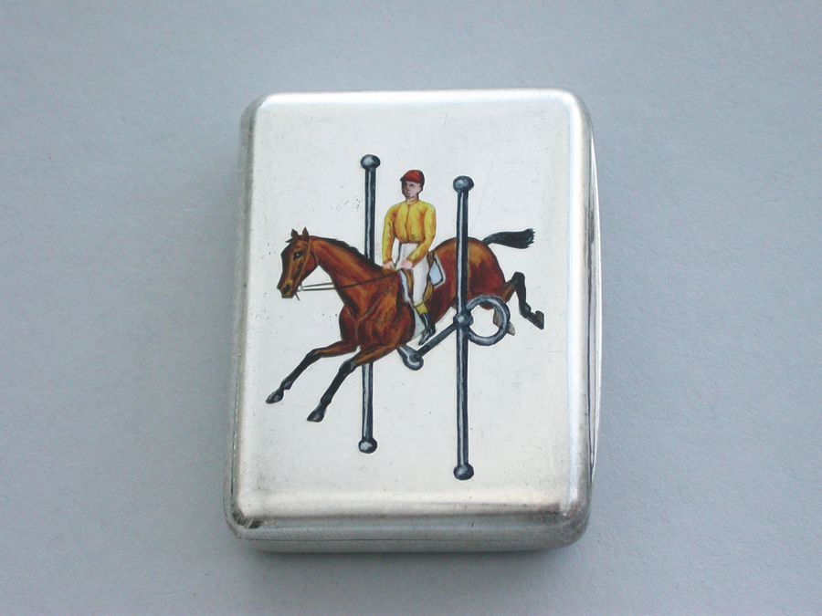 A good Victorian silver Vesta Case of rounded rectangular form with hinged lid and silver gilt interior, the face enamelled with a horse and jockey jumping through a full-cheek Snaffle Bit.