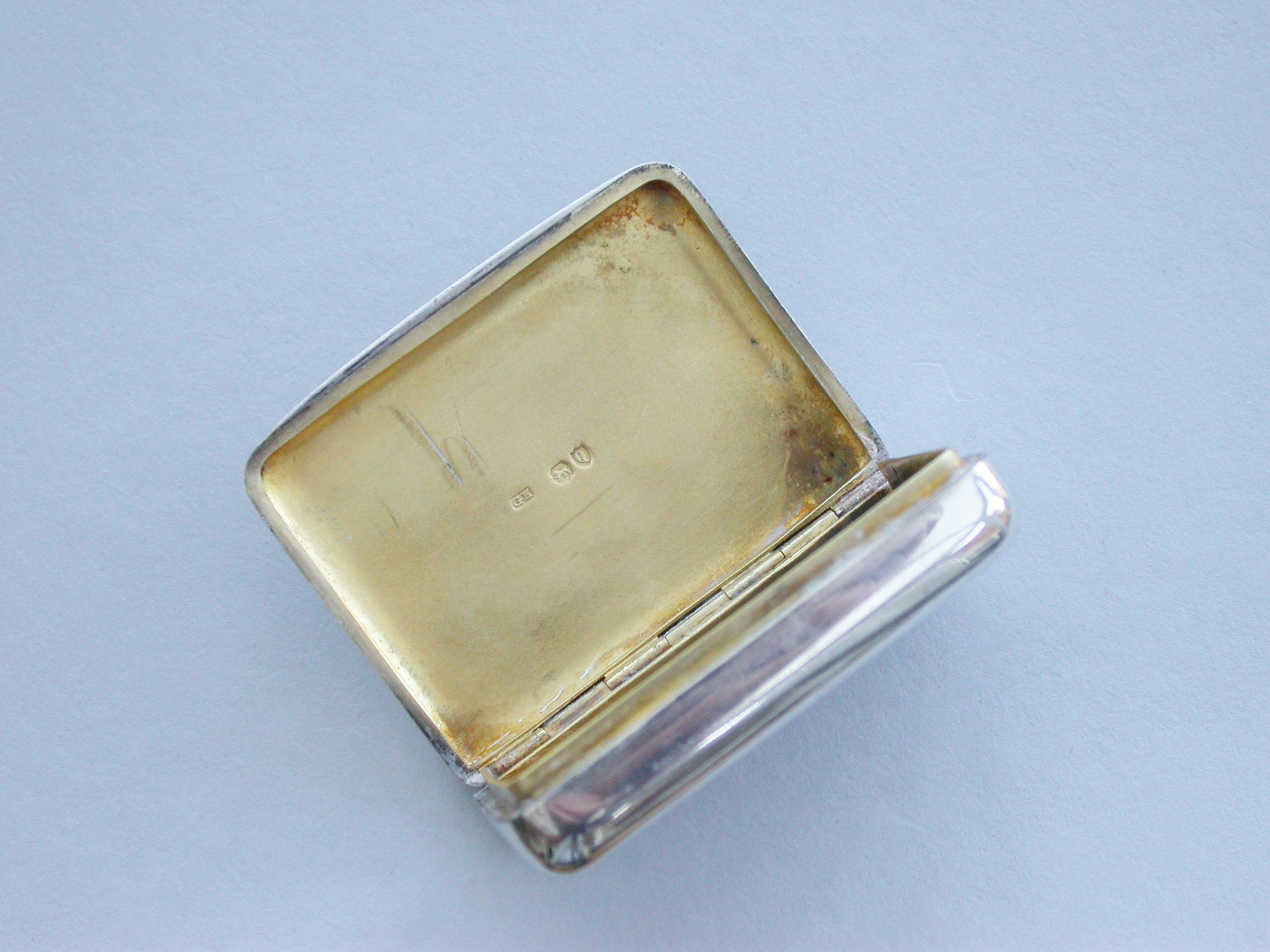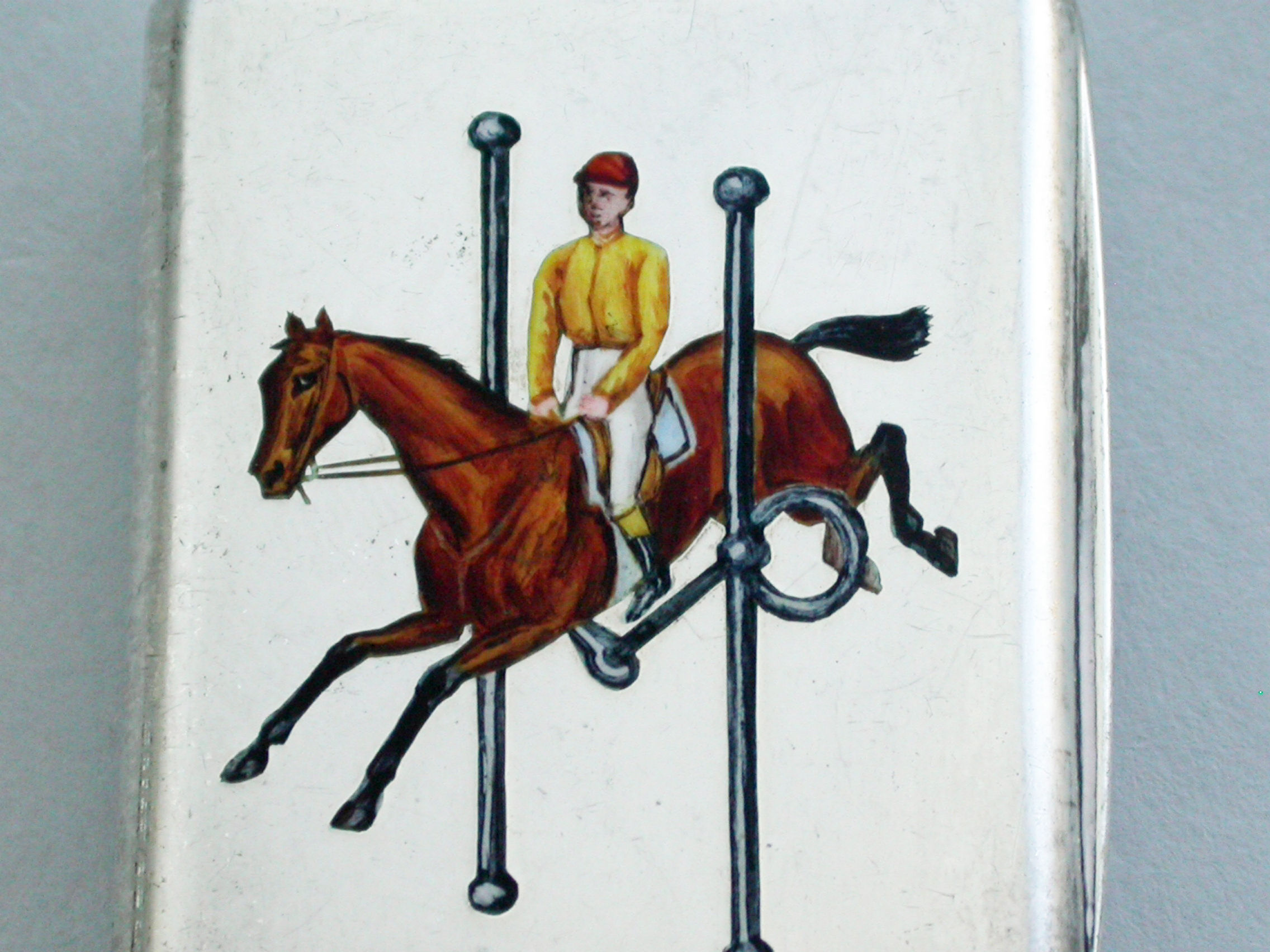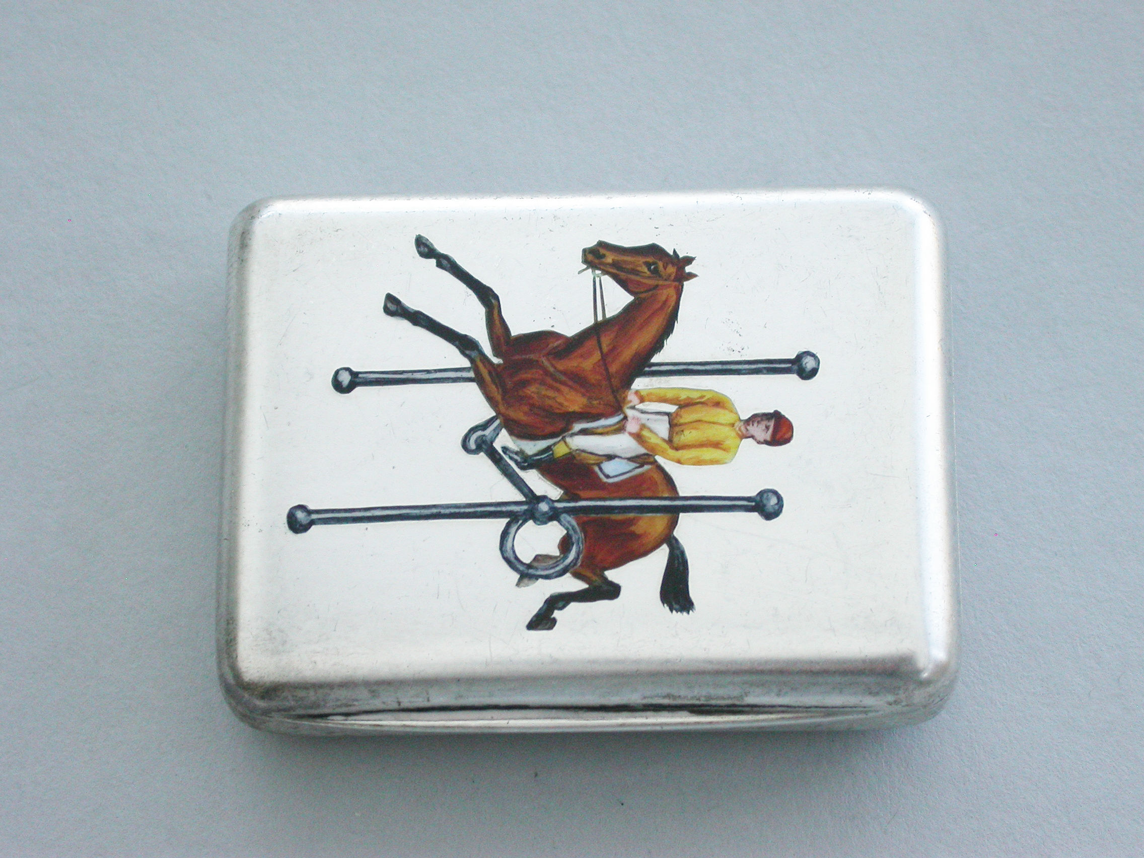 A good Victorian silver Vesta Case of rounded rectangular form with hinged lid and silver gilt interior, the face enamelled with a horse and jockey jumping through a full-cheek Snaffle Bit.